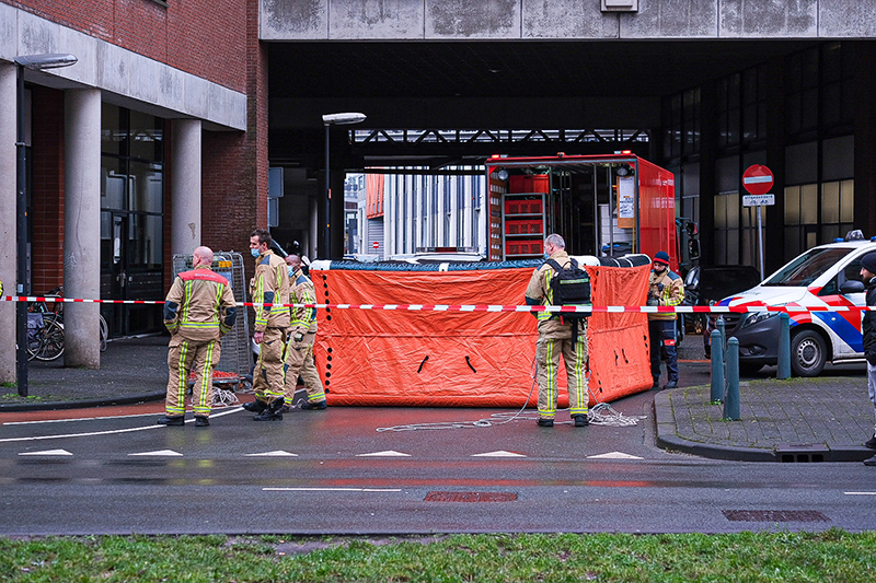 Nadat het luchtkussen werd geplaatst viel de vrouw uit het raam en belandde op het kussen. Zij werd in de ambulance onderzocht.