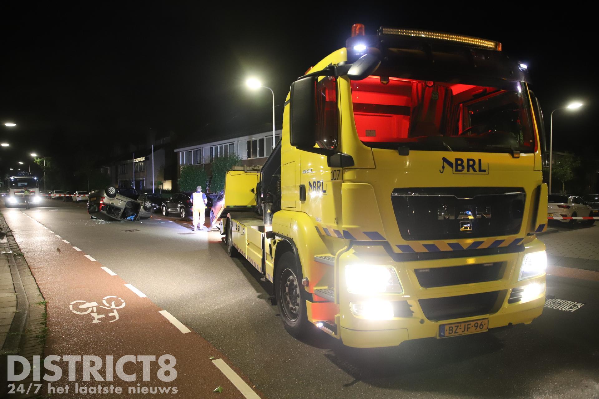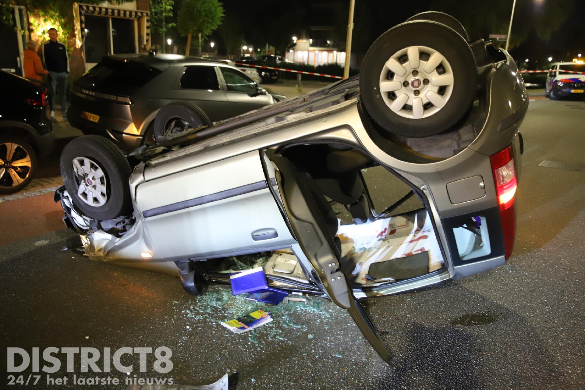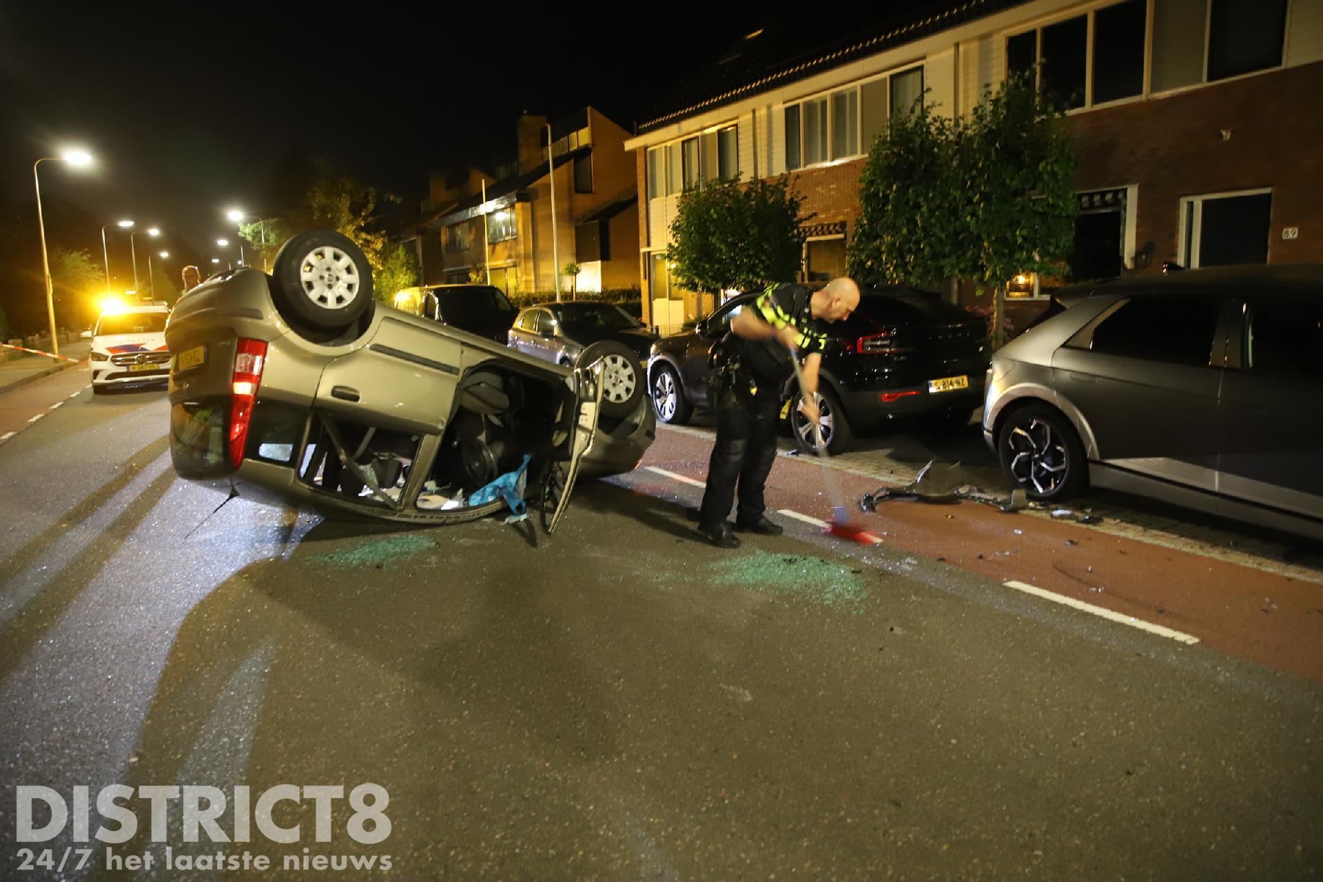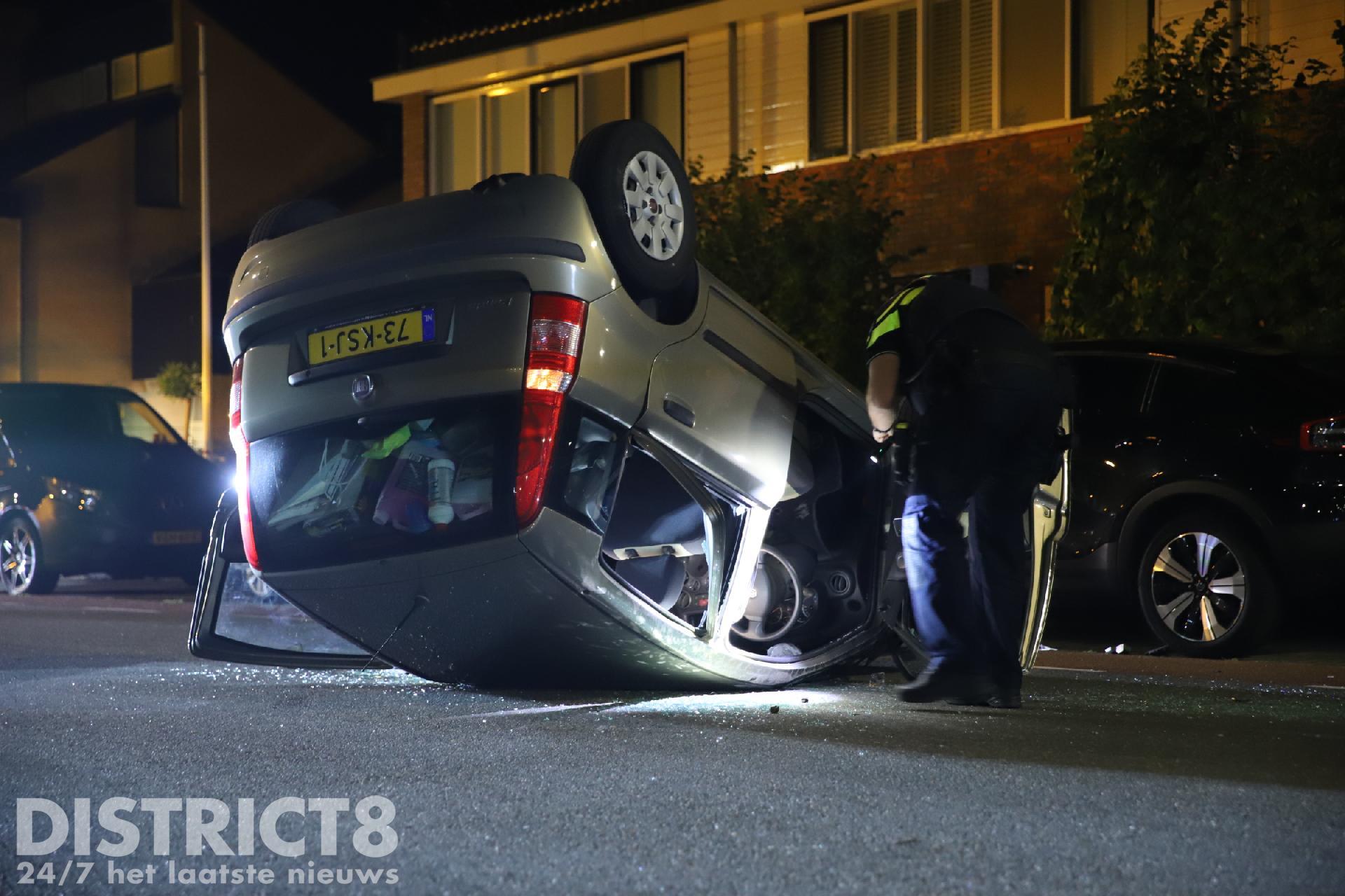 Door nog onbekende oorzaak reed de automobilist tegen een geparkeerde auto ter hoogte van de Regulierenstraat. De auto kwam op het dak tot stilstand.