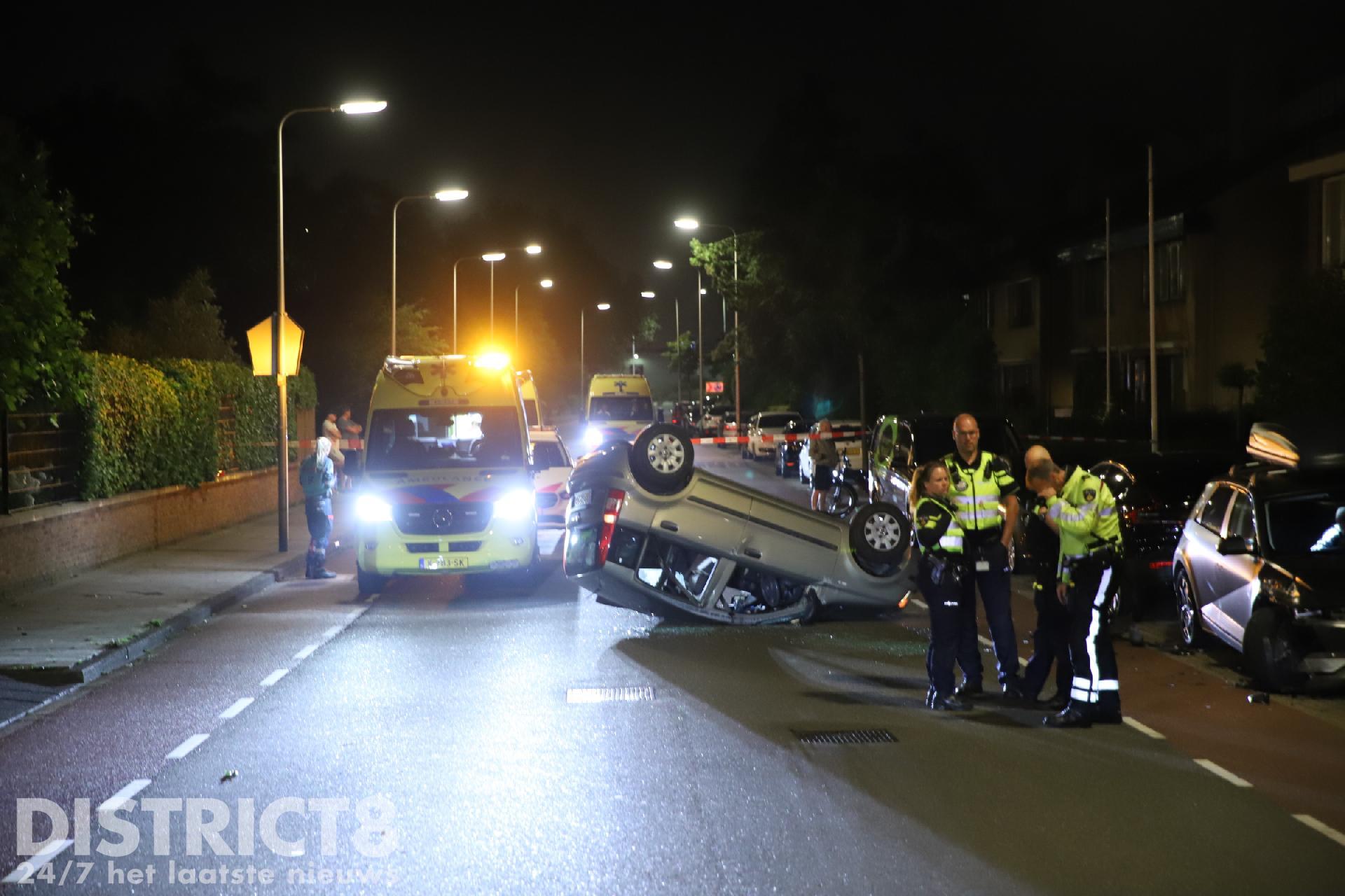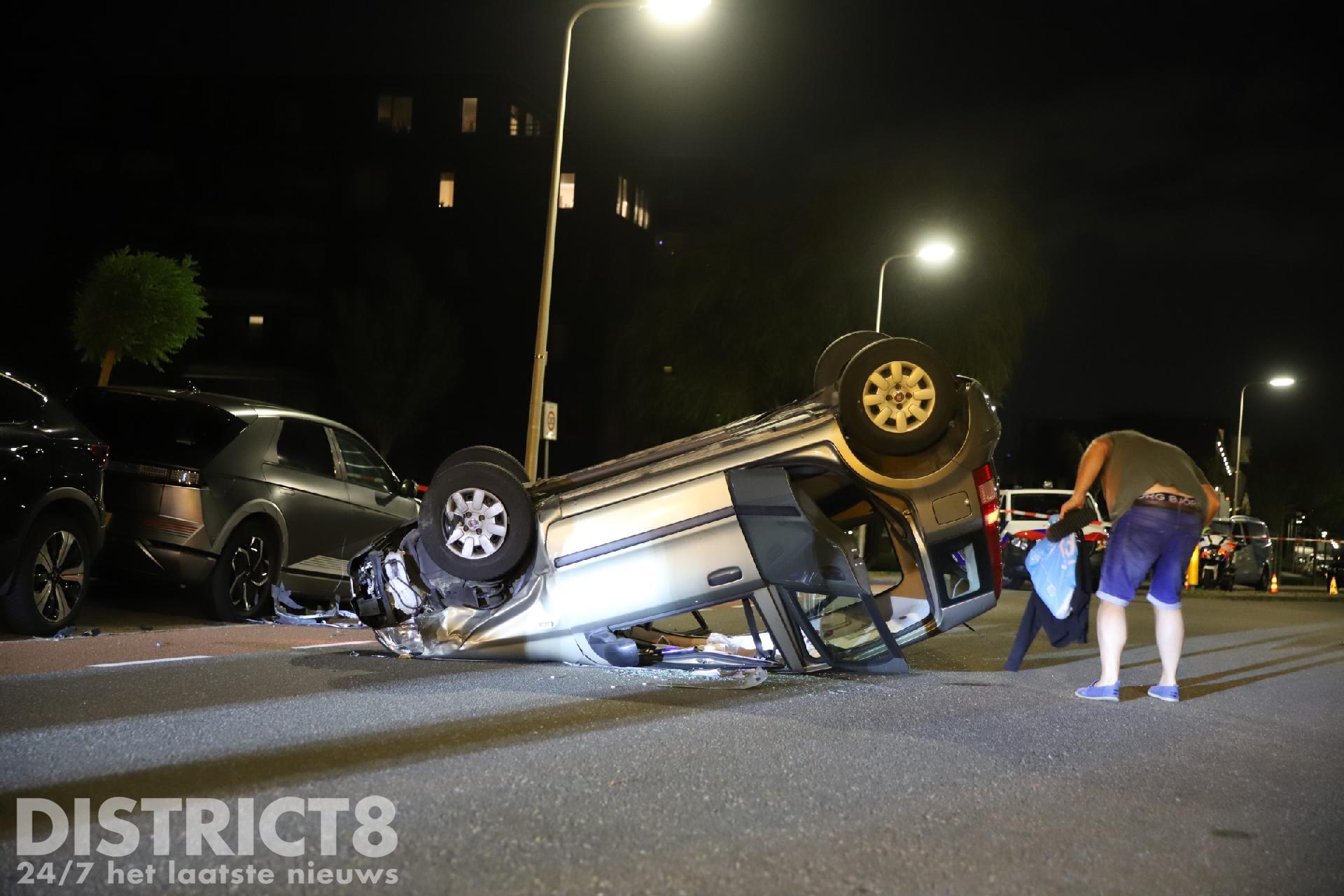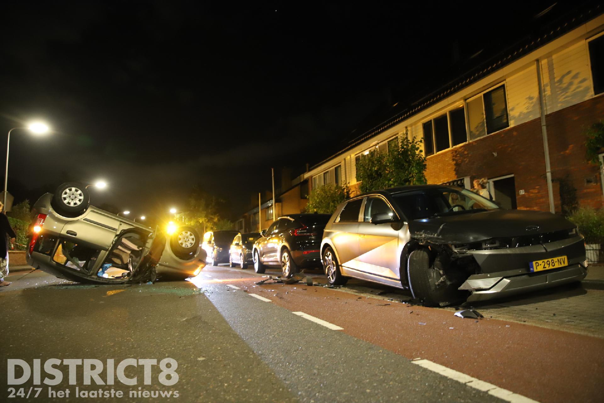 Door nog onbekende oorzaak reed de automobilist tegen een geparkeerde auto ter hoogte van de Regulierenstraat. De auto kwam op het dak tot stilstand.