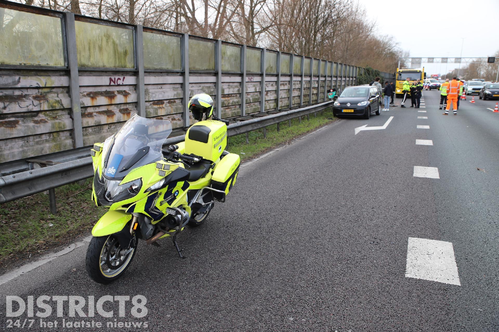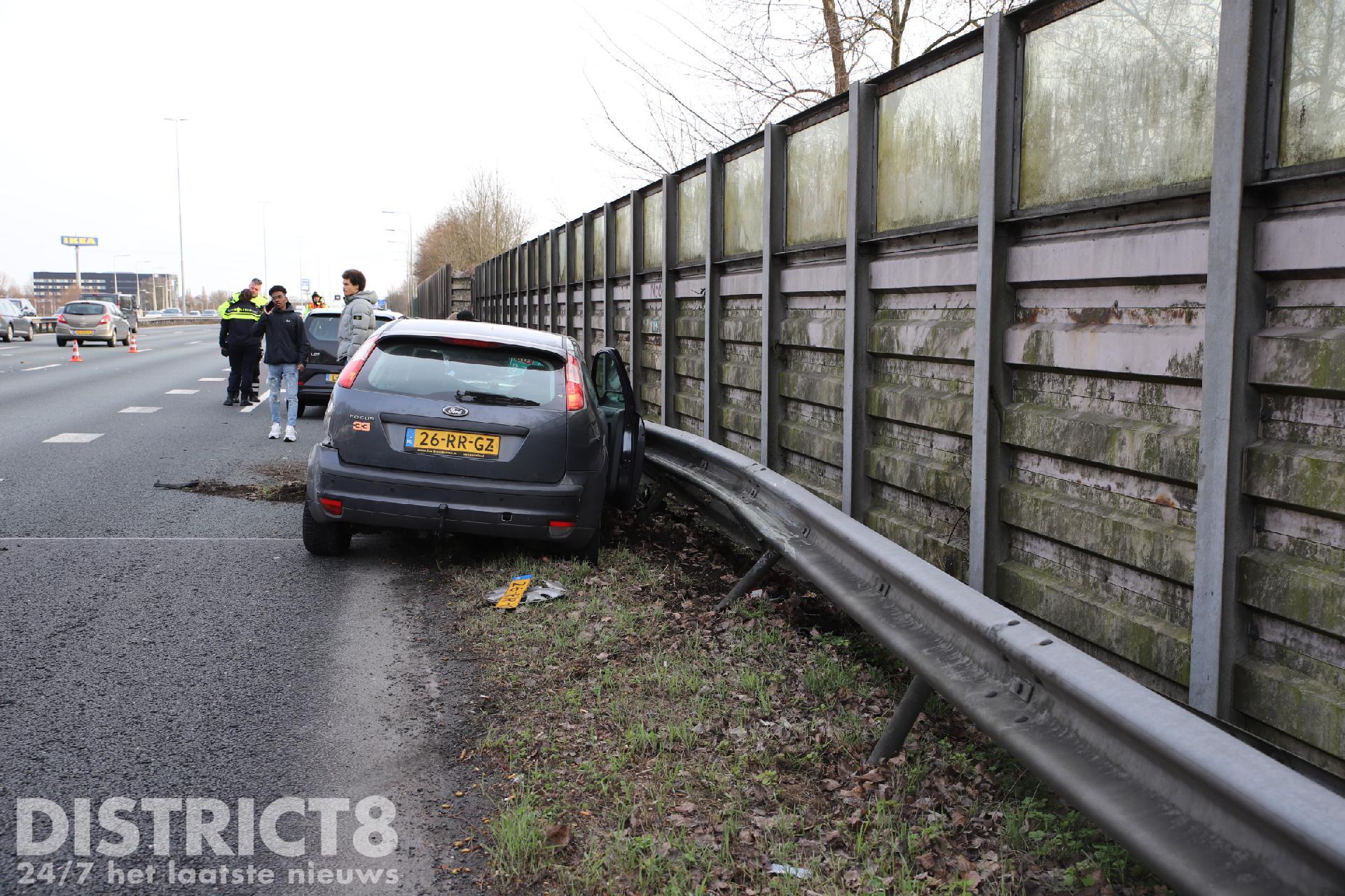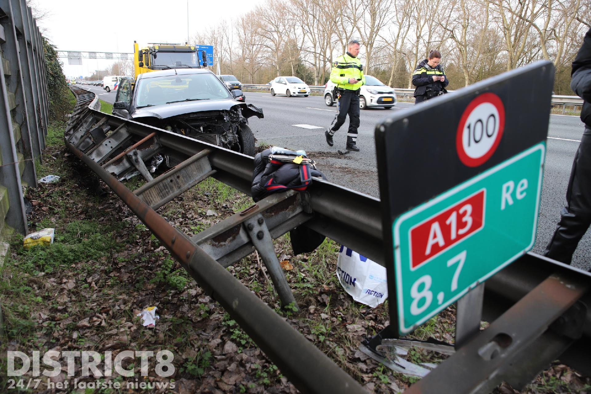 Eén personen auto samen met de vangrail raakte zwaar beschadigd, volgens een bestuurder heeft een vrachtwagen het ongeluk veroorzaakt en is hierna doorgereden. De met spoed ter plaatse gekomen ambulance kon al snel weer door, er bleek gelukkig niemand gewond te zijn geraakt.