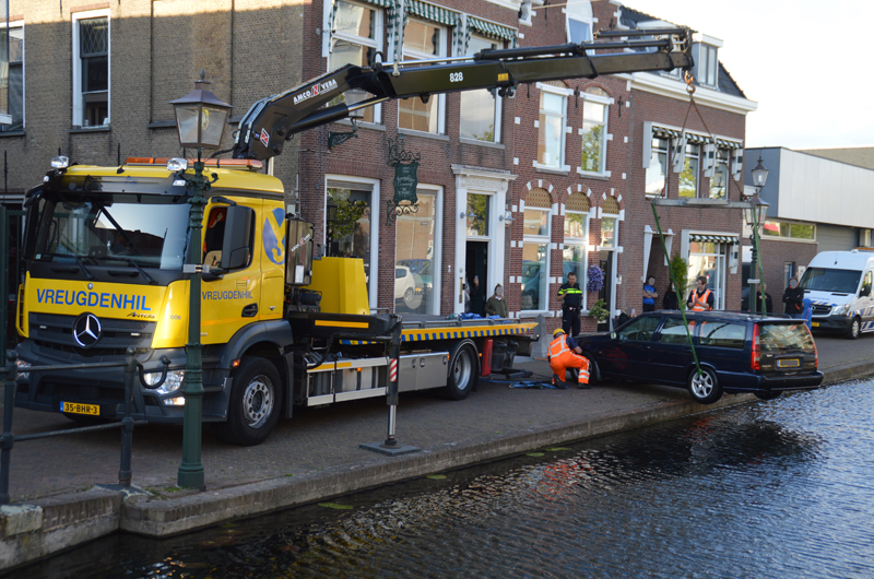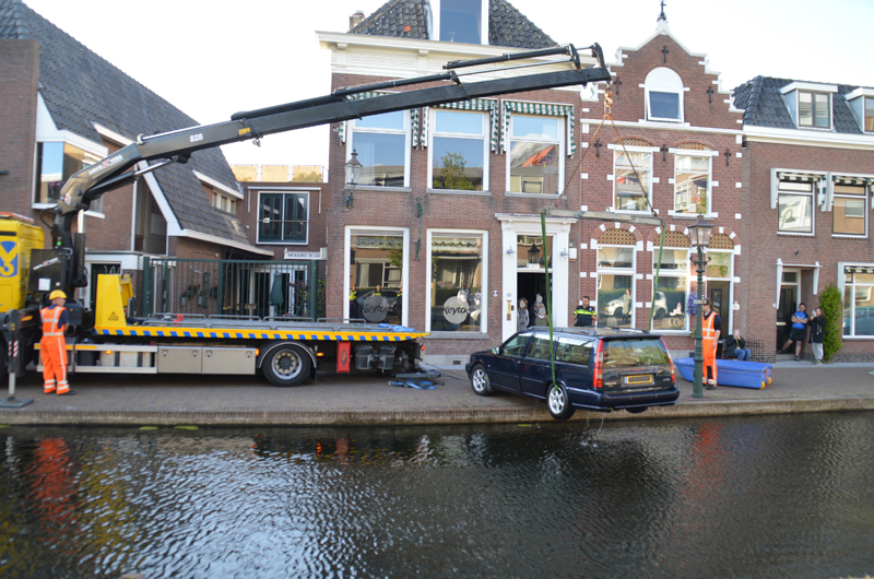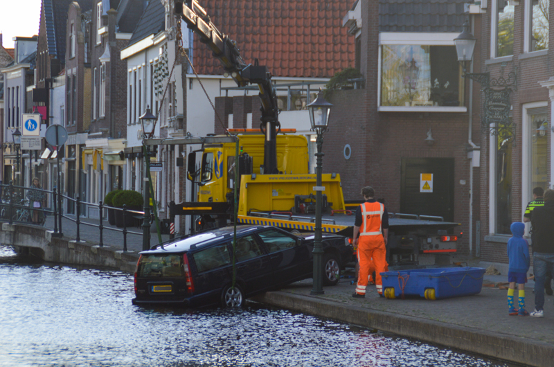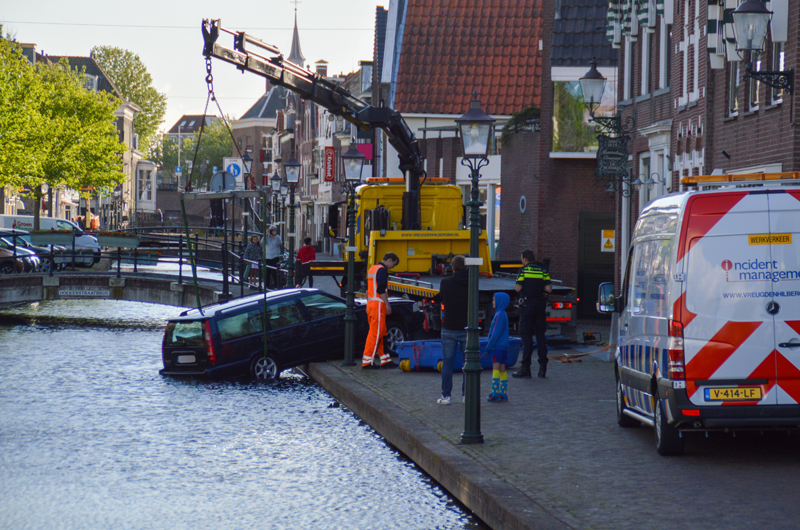 Het voertuig rolde met de achterkant het water in. Het incident trok redelijk veel bekijks van omstanders.