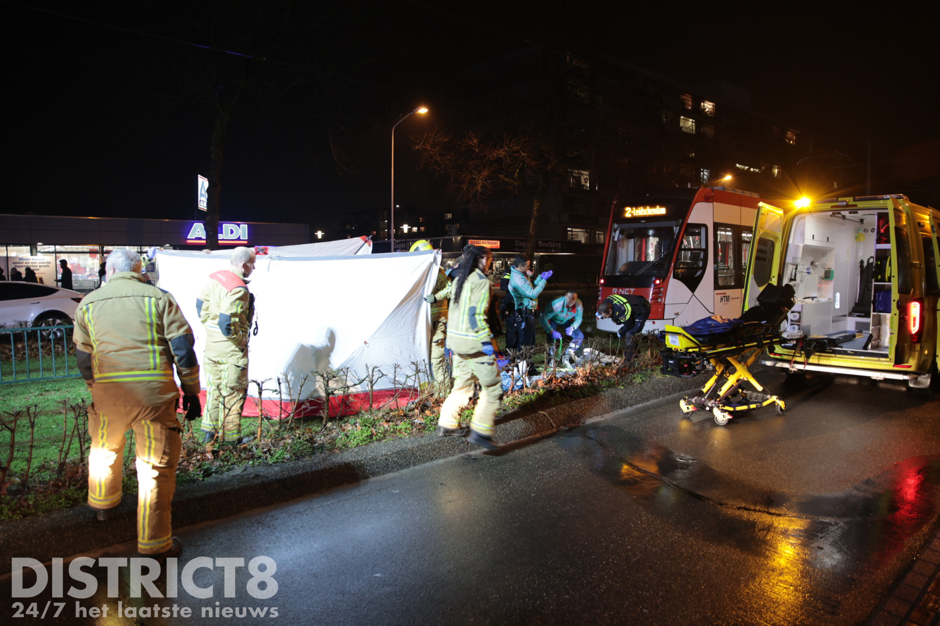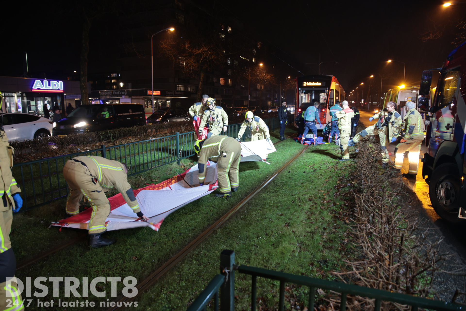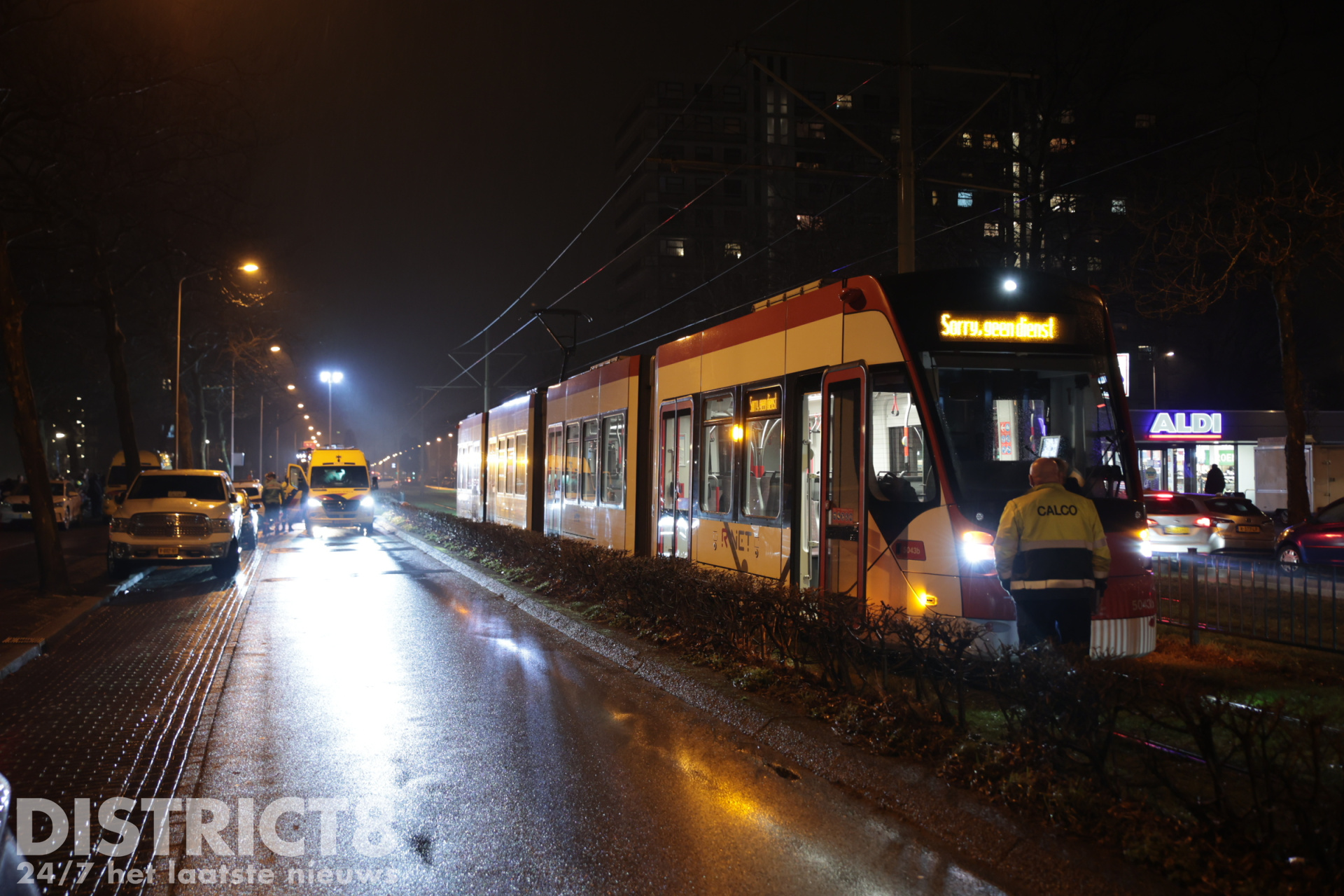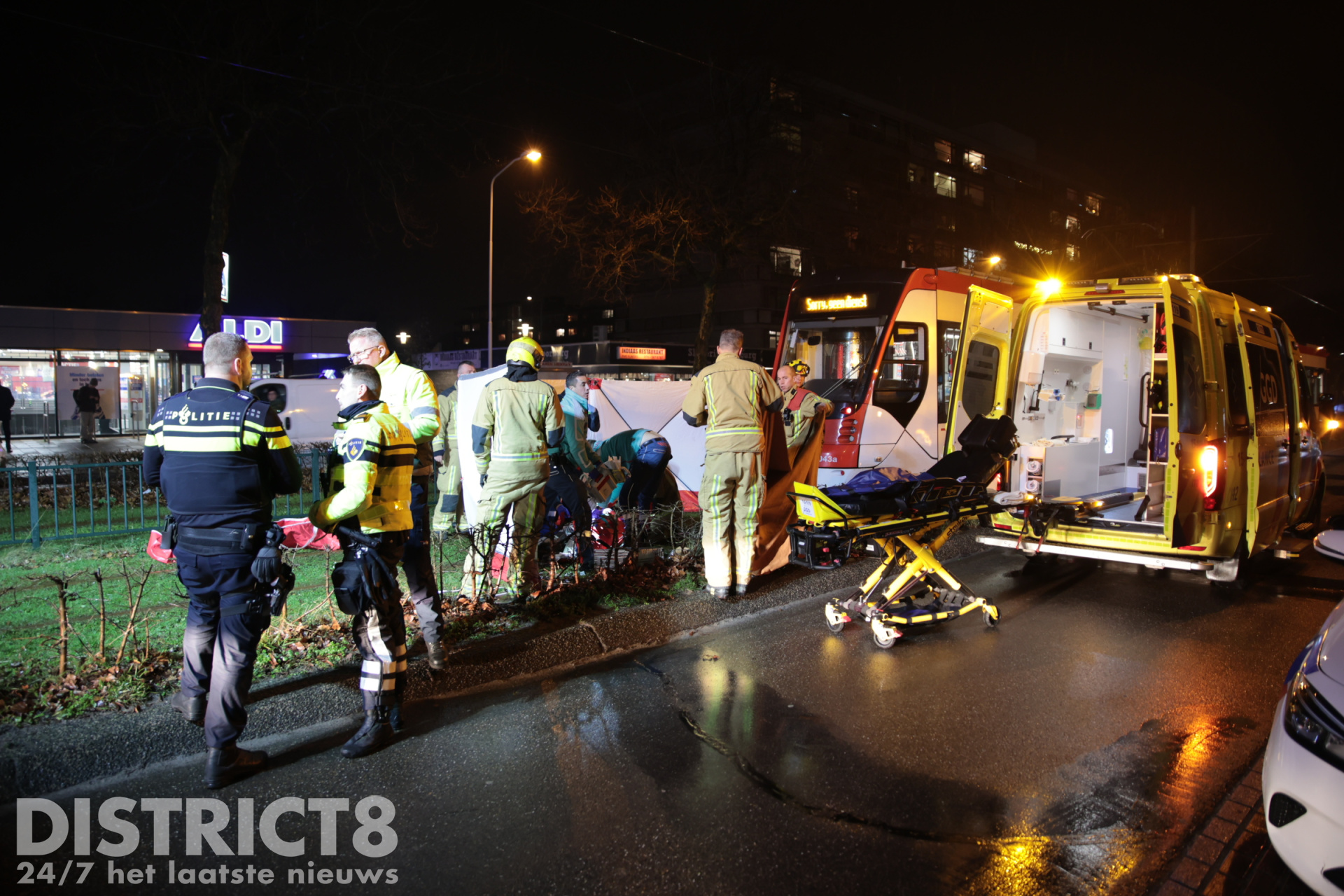 Even na zeven uur ging het mis. Op de trambaan ter hoogte van de Aldi supermarkt ging het mis. De voetganger stak de trambaan over en werd daarbij geschept. De tram kwam enkele meters verderop tot stilstand.