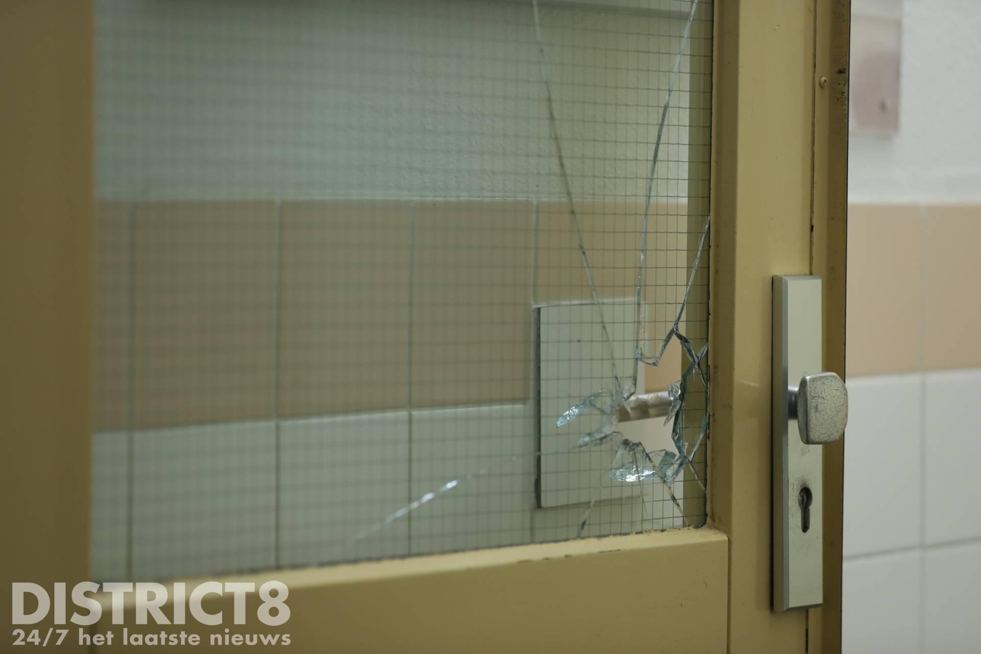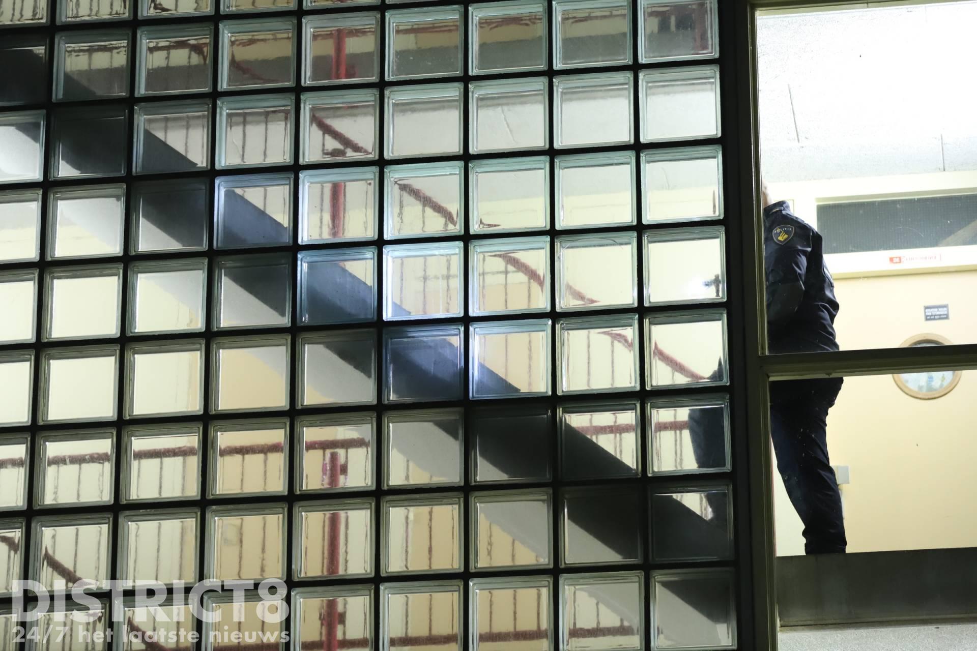 Op de derde etage bleek de voordeur van een woning met een gezin beschoten te zijn door de verdachte. Om de portiek in te komen had de verdachte eerst het raam van de portiekdeur vernield om binnen te komen.