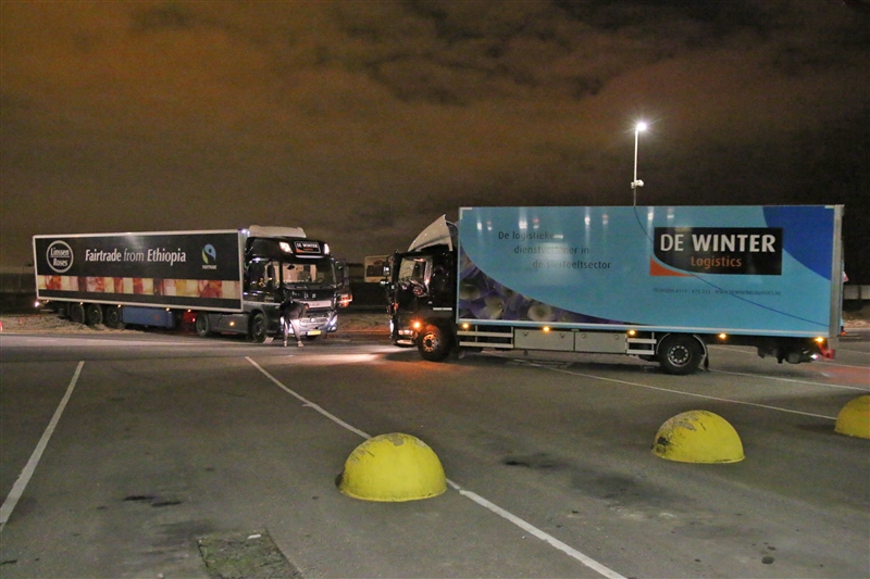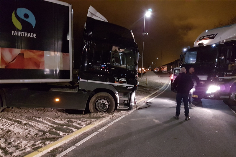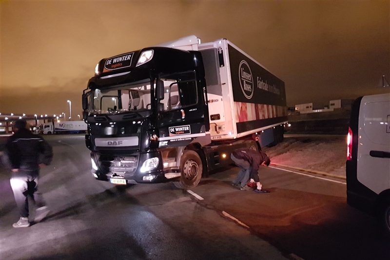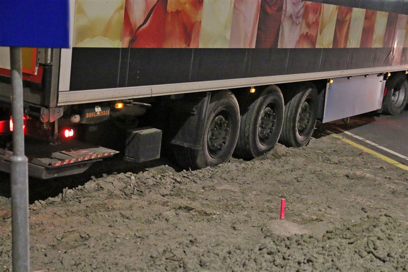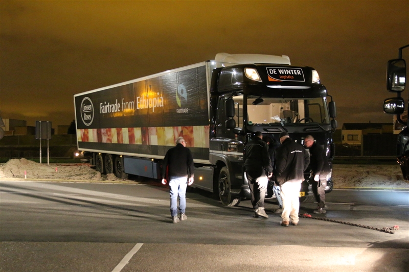 Een collega van hetzelfde transportbedrijf kon met een kabel te vrachtwagen weer vlot trekken. De vrachtwagen liep geen schade op.