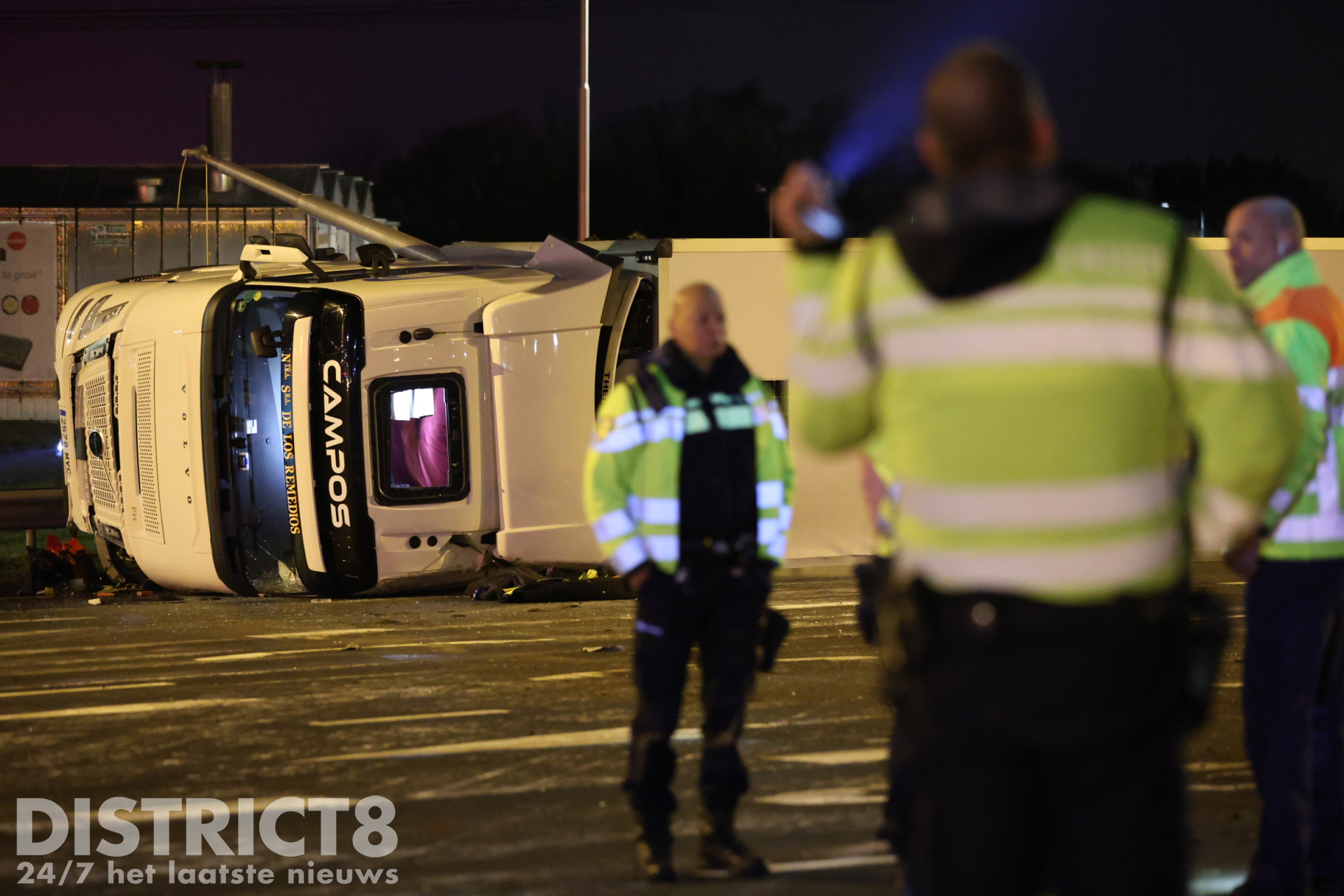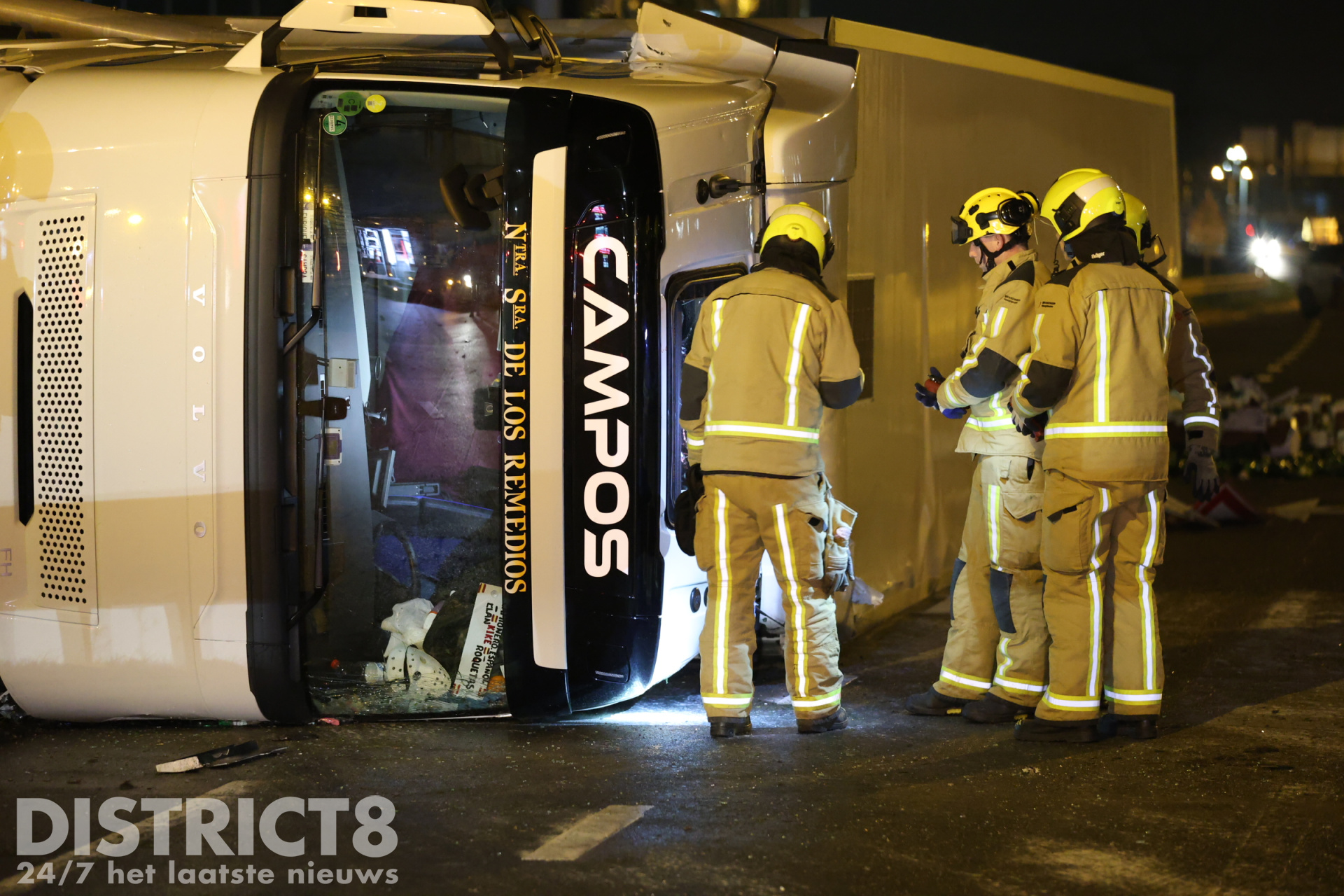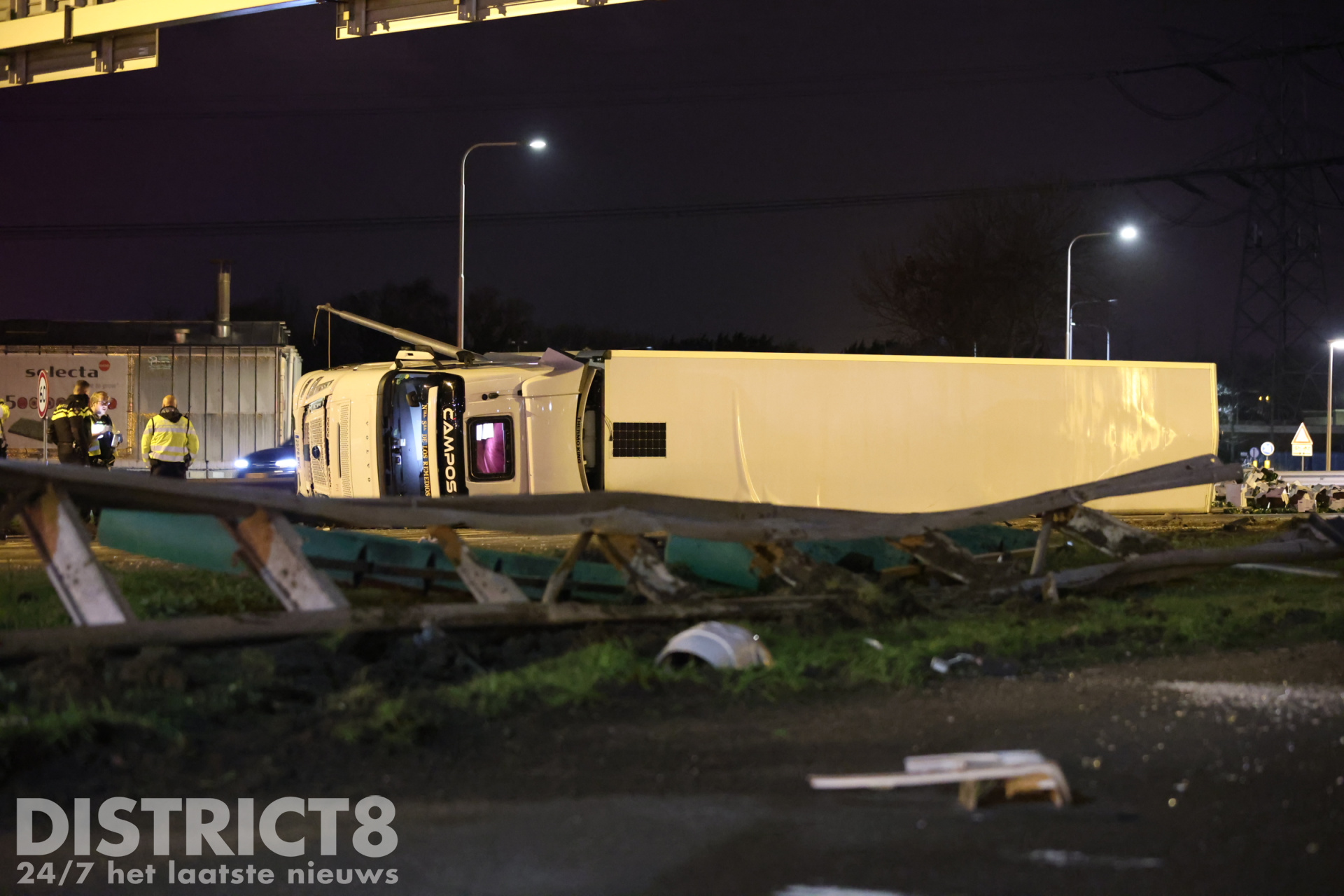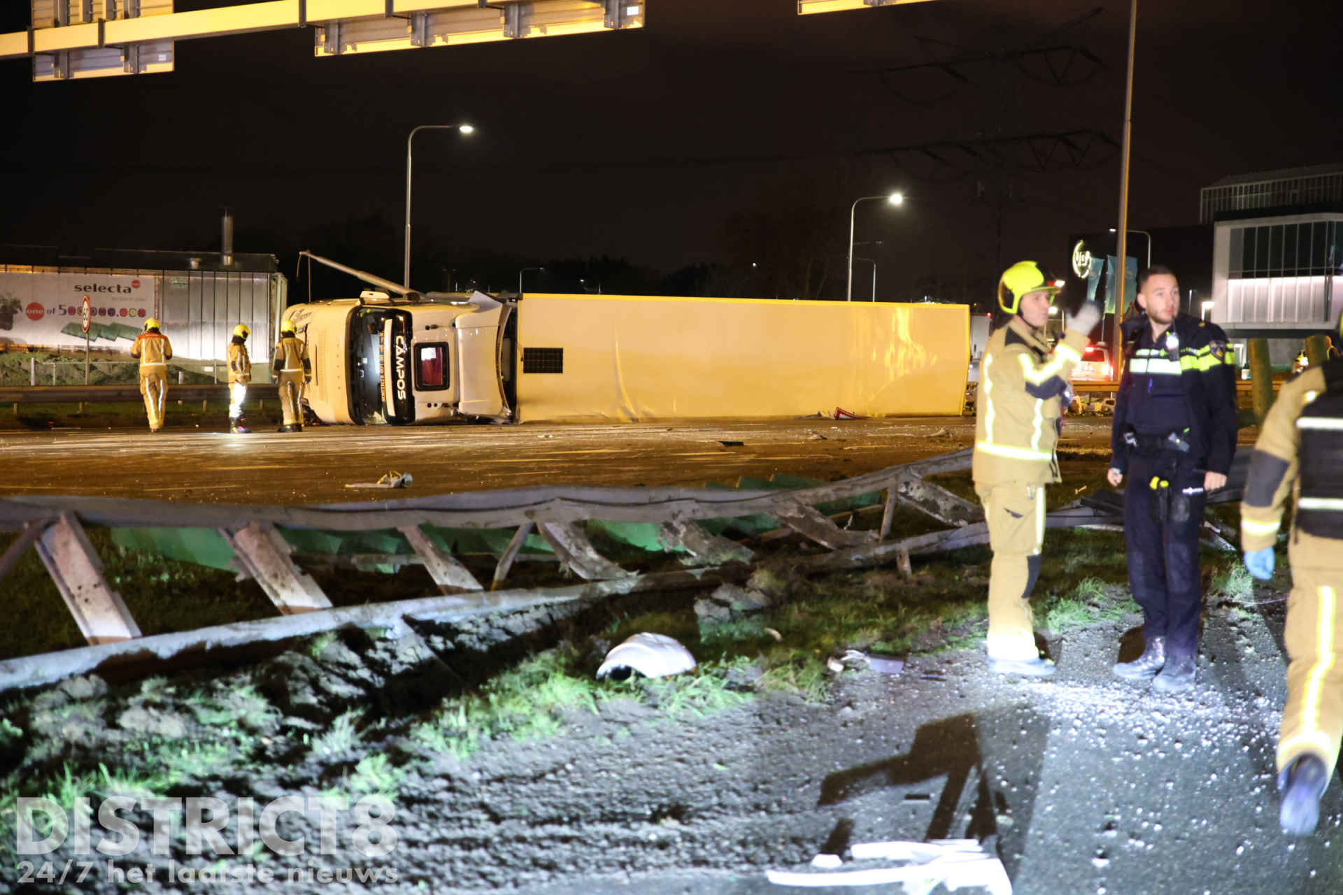 Even voor half twaalf ging het flink mis. De vrachtwagen kwam door nog onbekende oorzaak op zijn kant terecht en is daarna door de middenberm aan de andere kant van de weg tot stilstand gekomen.