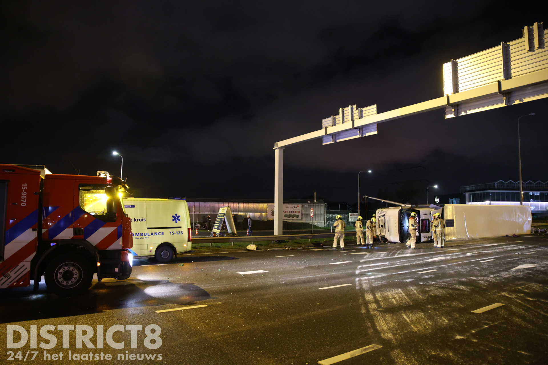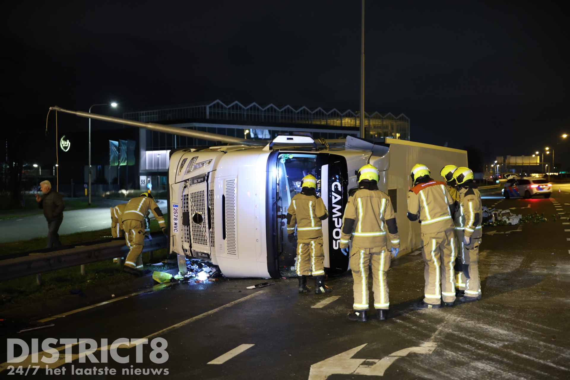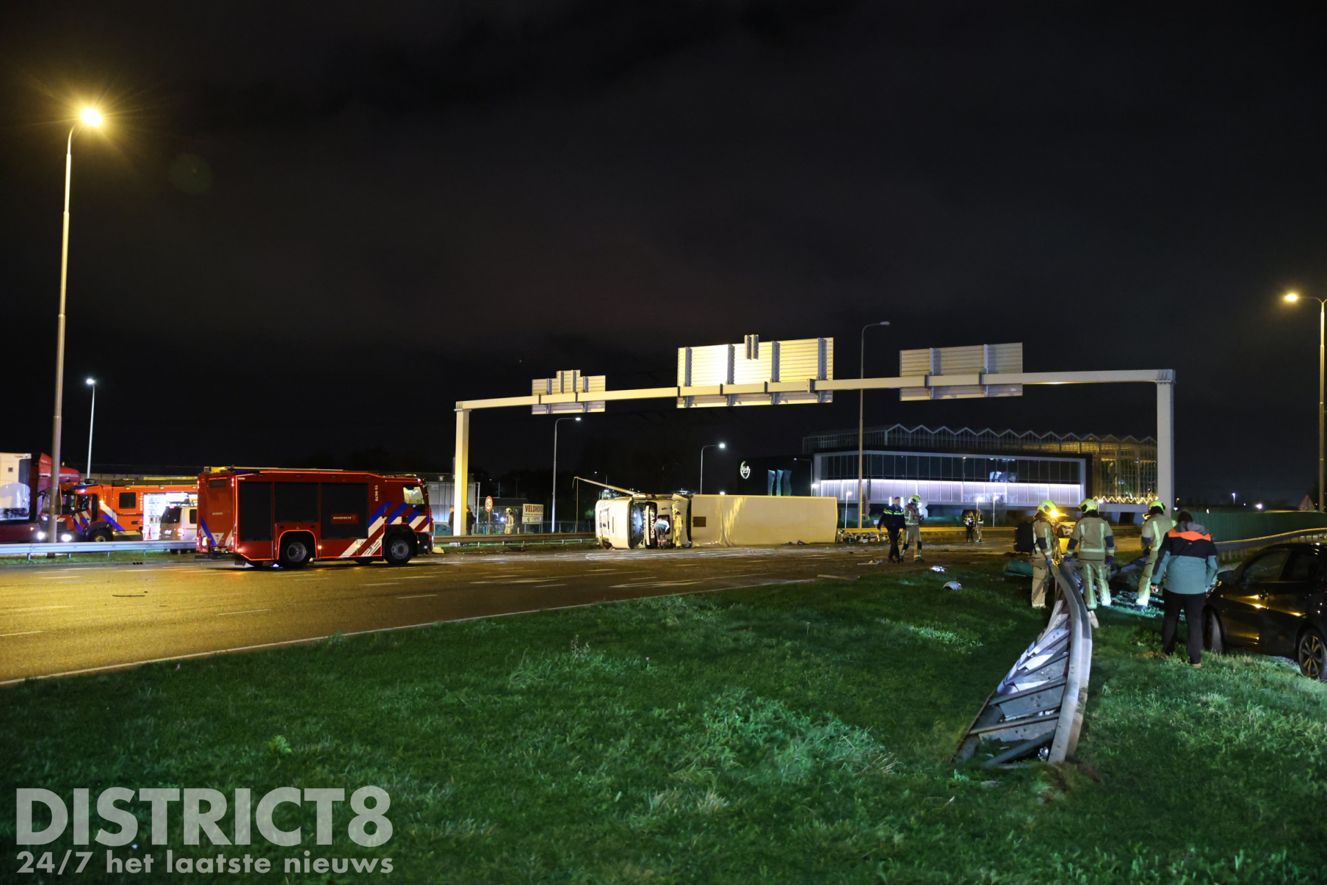 Even voor half twaalf ging het flink mis. De vrachtwagen kwam door nog onbekende oorzaak op zijn kant terecht en is daarna door de middenberm aan de andere kant van de weg tot stilstand gekomen.