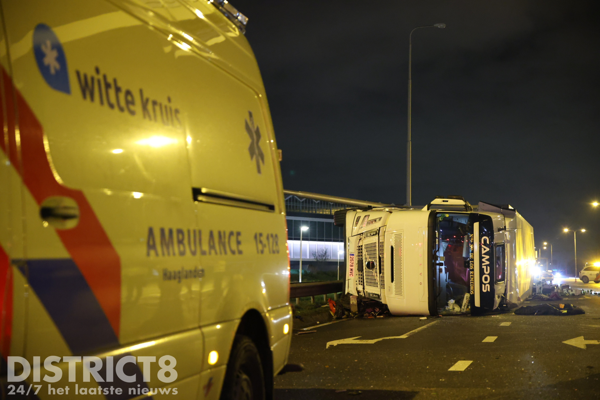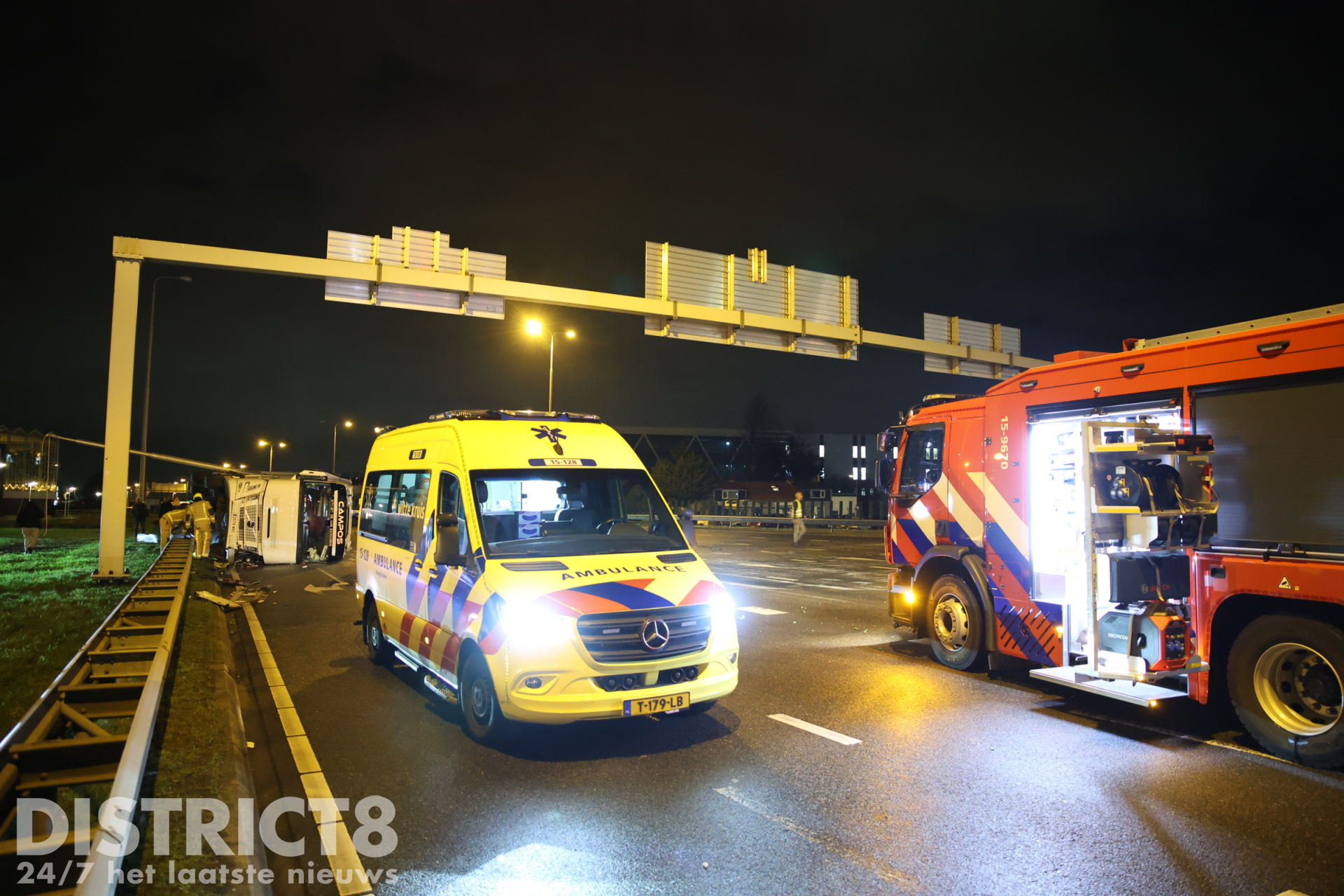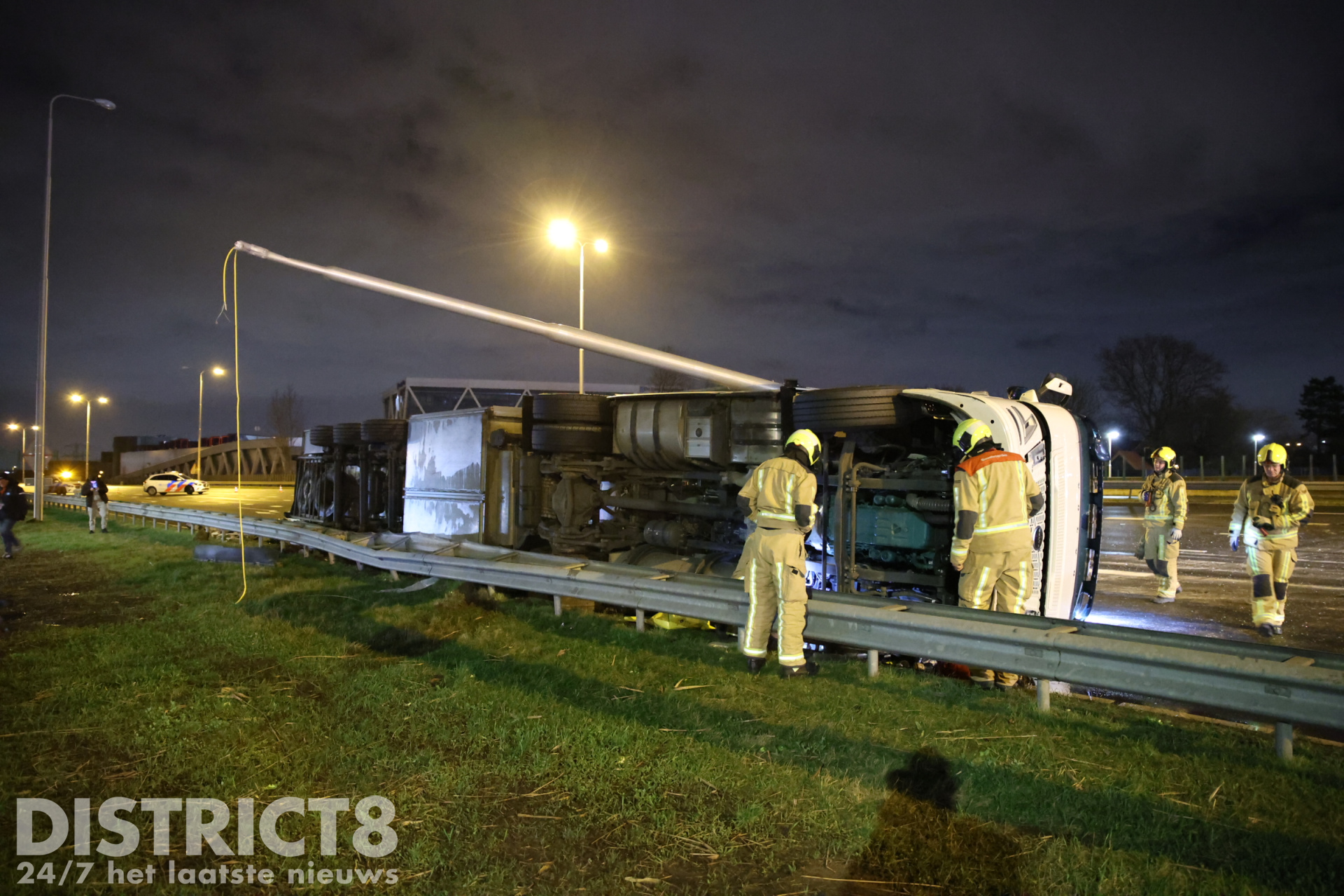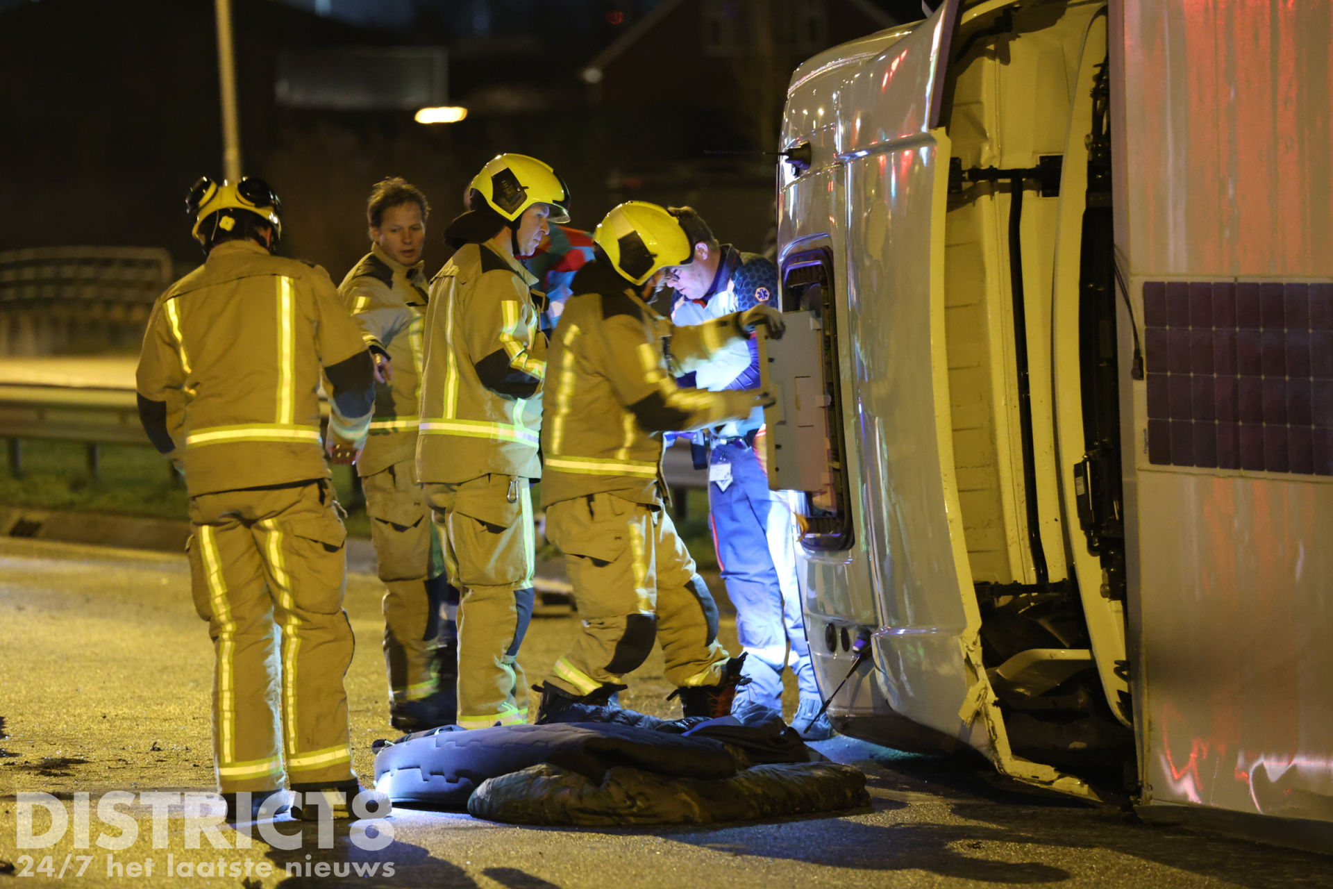 Even voor half twaalf ging het flink mis. De vrachtwagen kwam door nog onbekende oorzaak op zijn kant terecht en is daarna door de middenberm aan de andere kant van de weg tot stilstand gekomen.