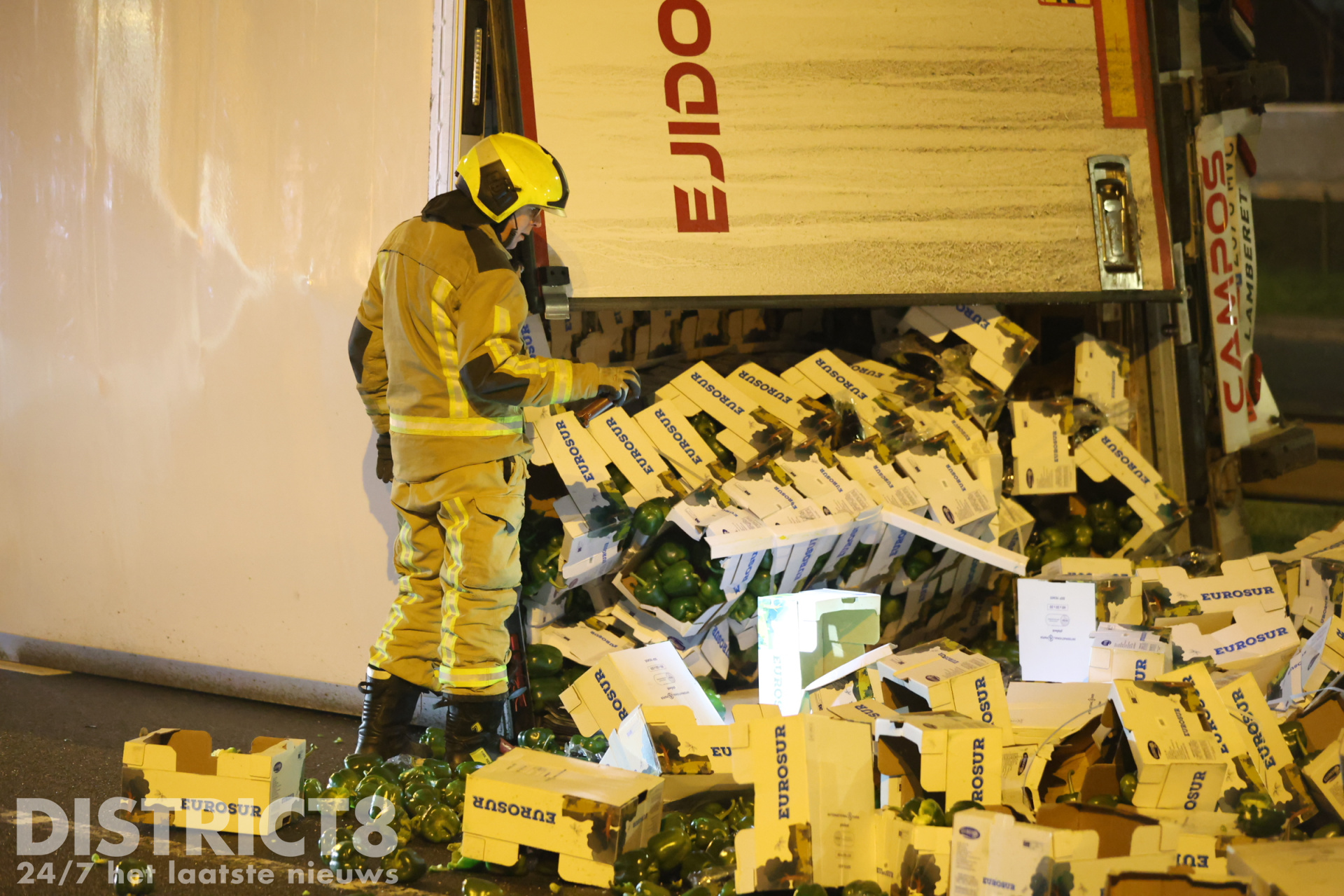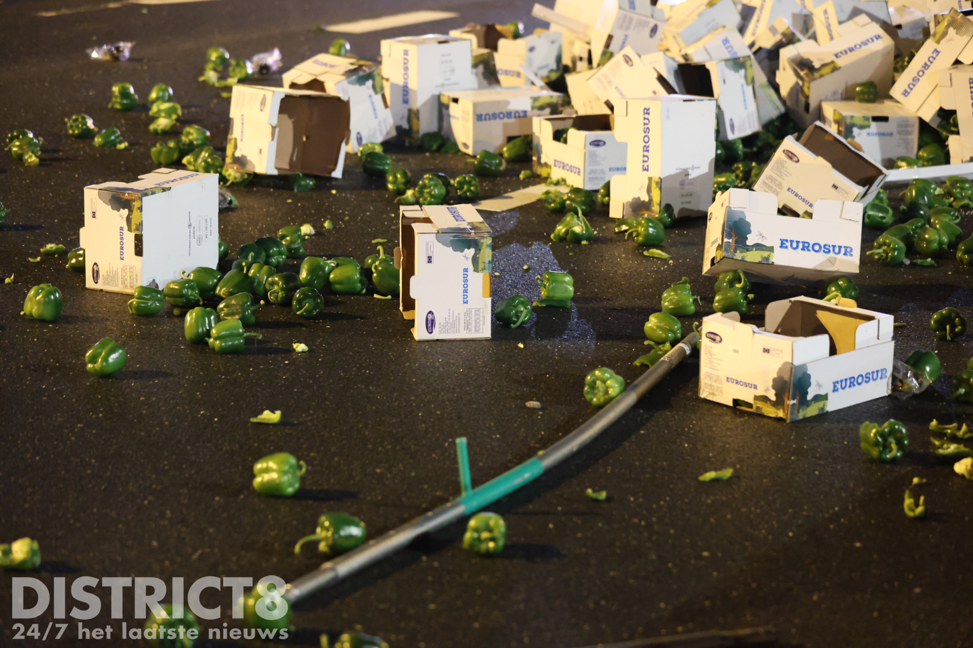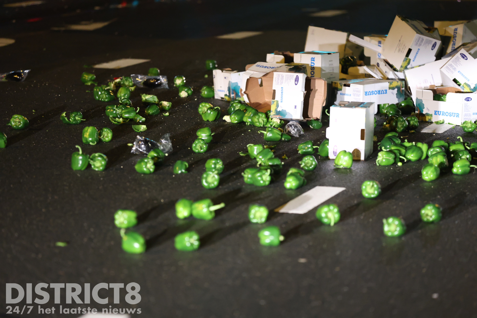 In de trailer van de vrachtwagen lagen vele dozen met paprika’s opgestapeld. Een deel hiervan kwam op de weg terecht.