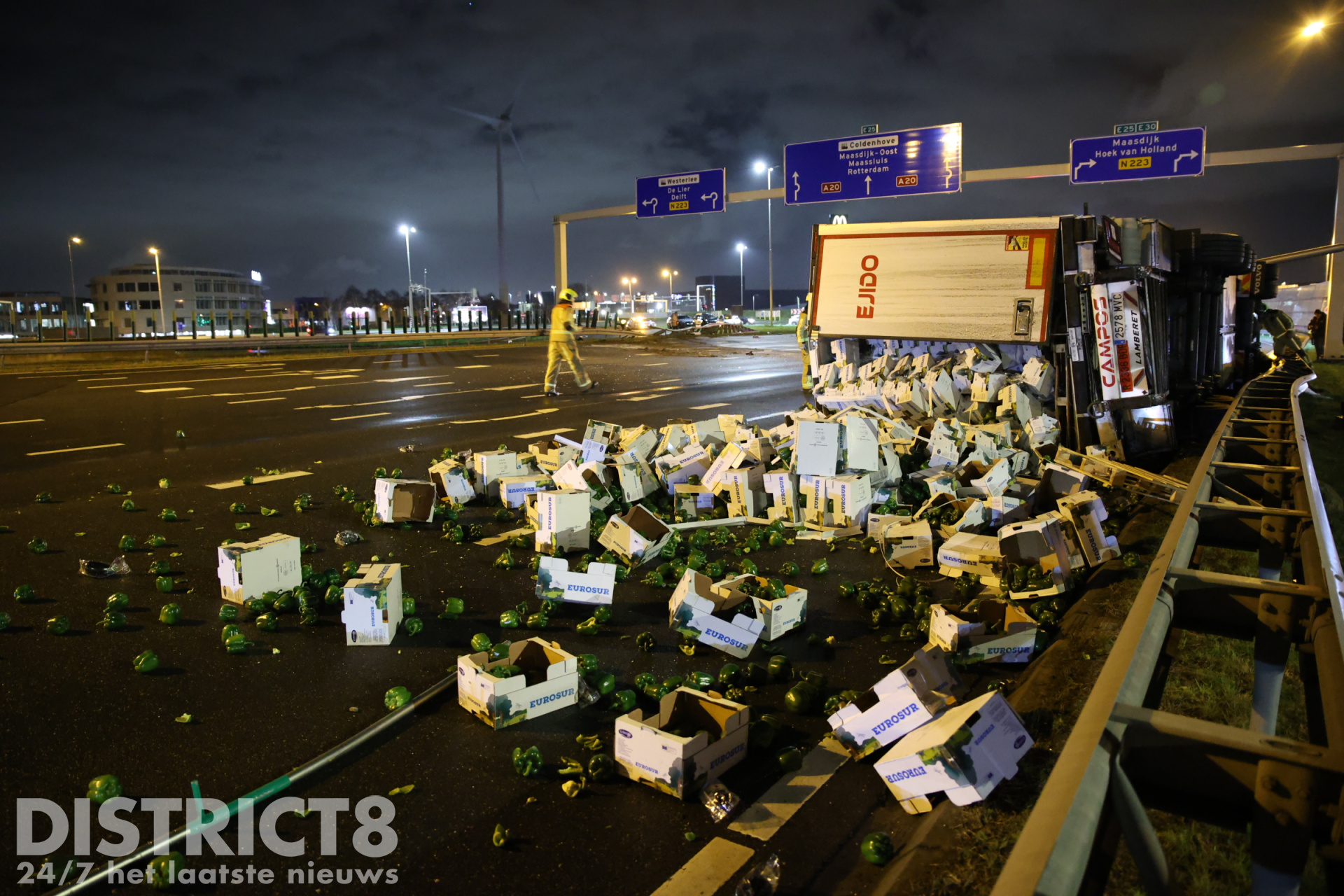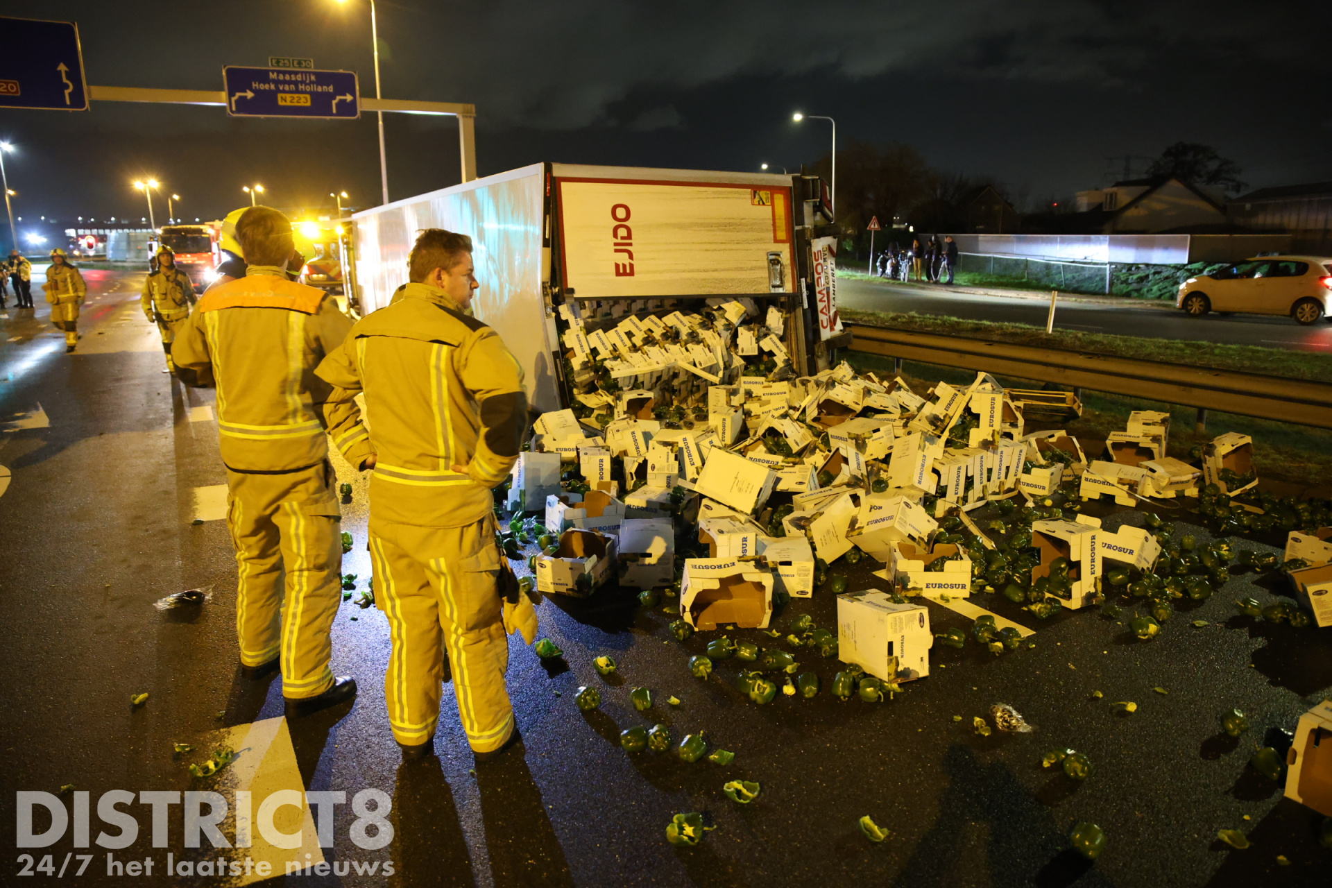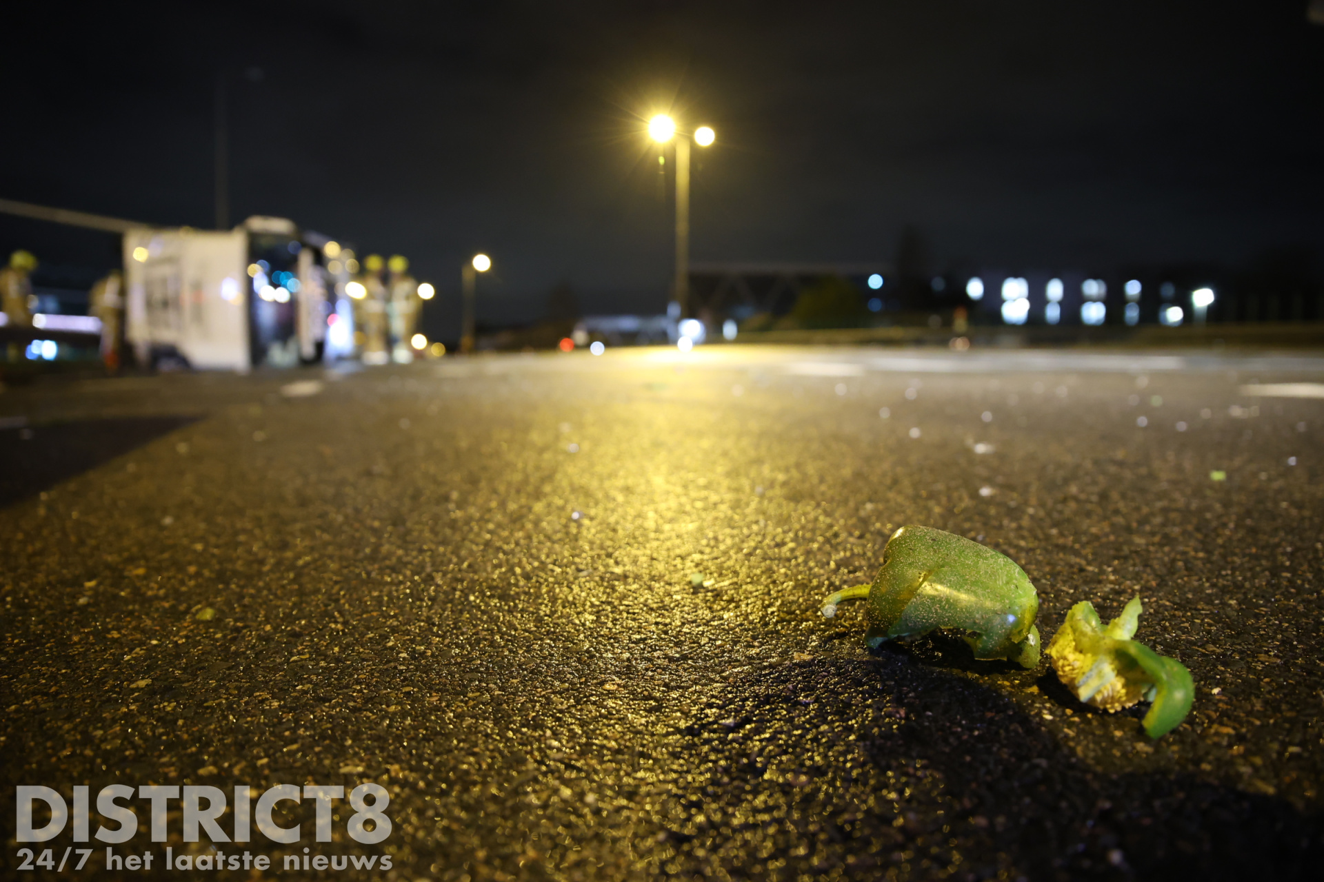 In de trailer van de vrachtwagen lagen vele dozen met paprika’s opgestapeld. Een deel hiervan kwam op de weg terecht.