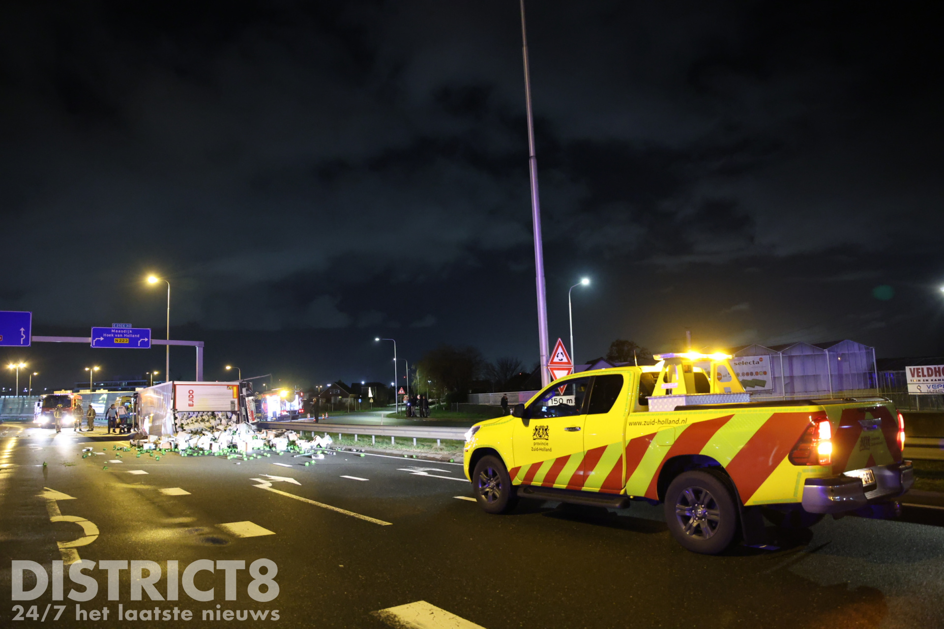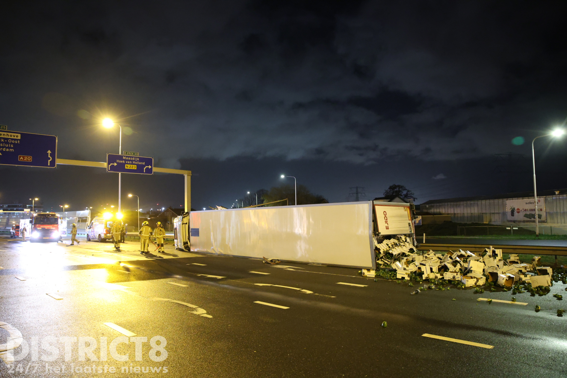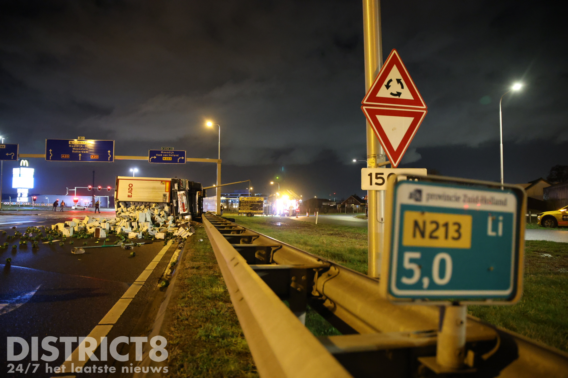 Naaldwijk – Op de Burgemeester Elsenweg (N213) in Naaldwijk is een vrachtwagen gekanteld. Hoe dit kon gebeuren is nog onbekend.