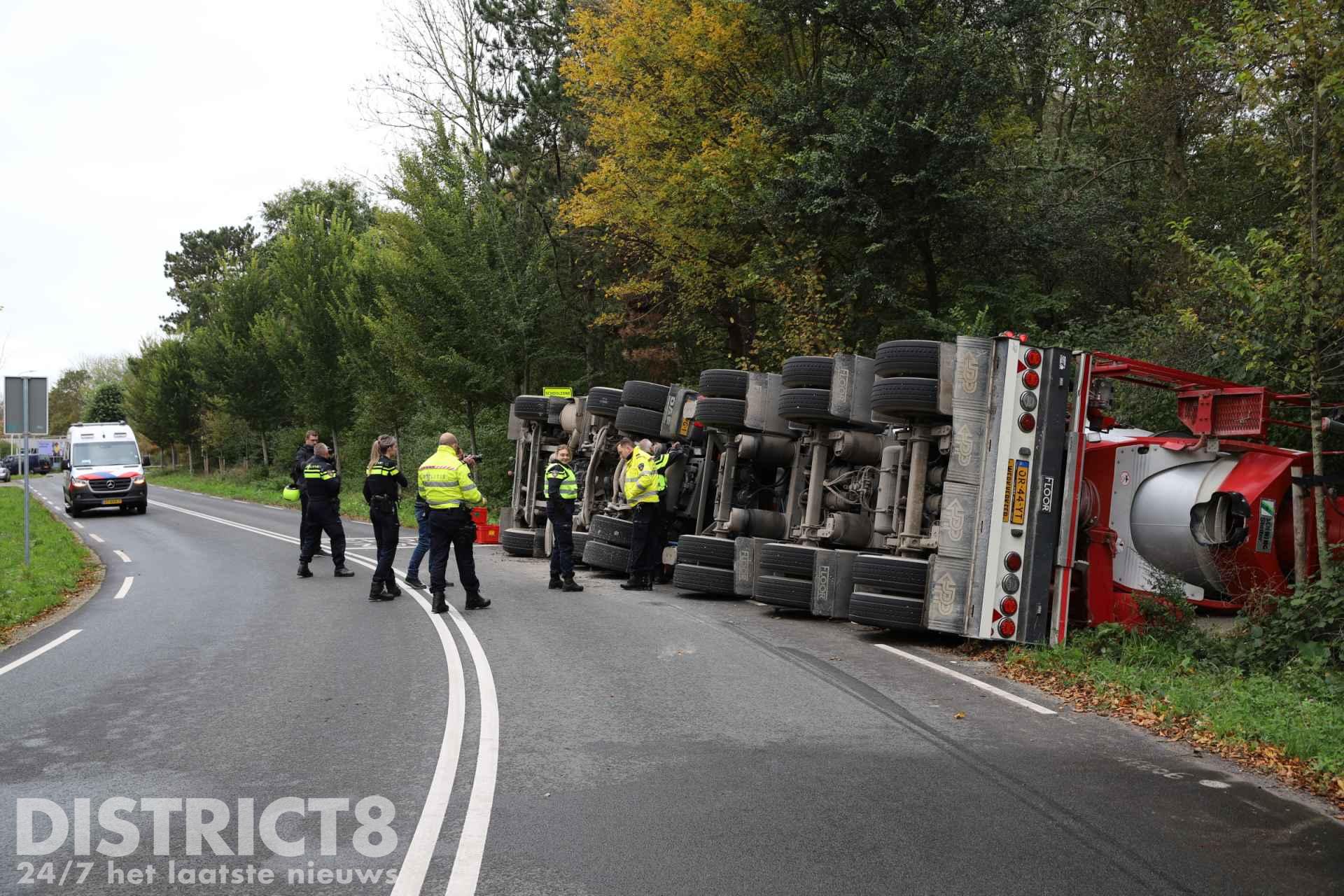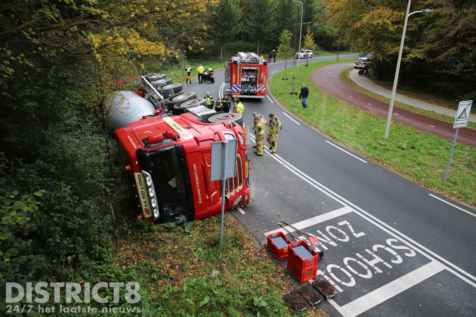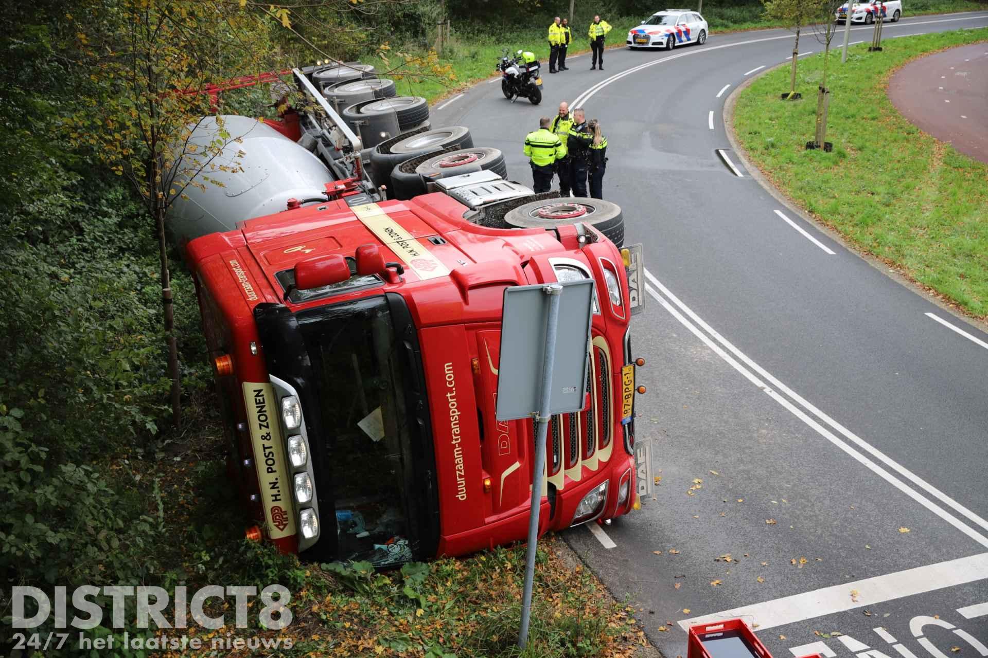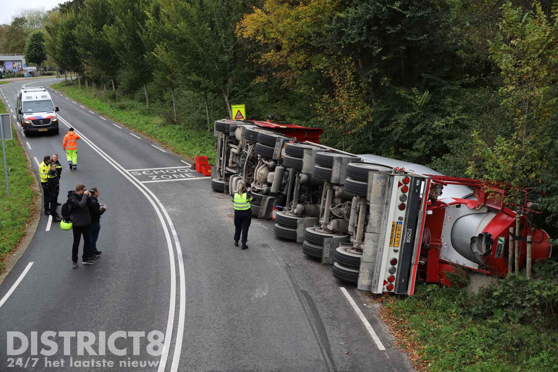 De cementwagen kwam in een flauwe bocht, door een nog onbekende oorzaak op zijn kant terecht. Meteen werden meerdere hulpdiensten ter plaatse gestuurd.