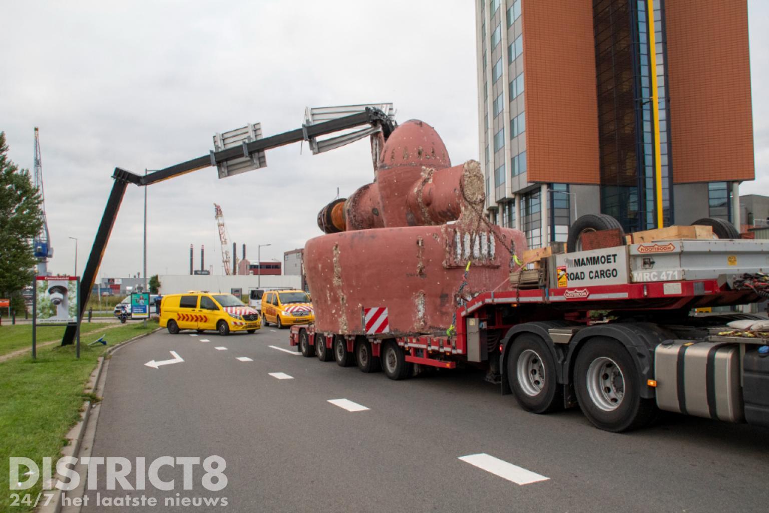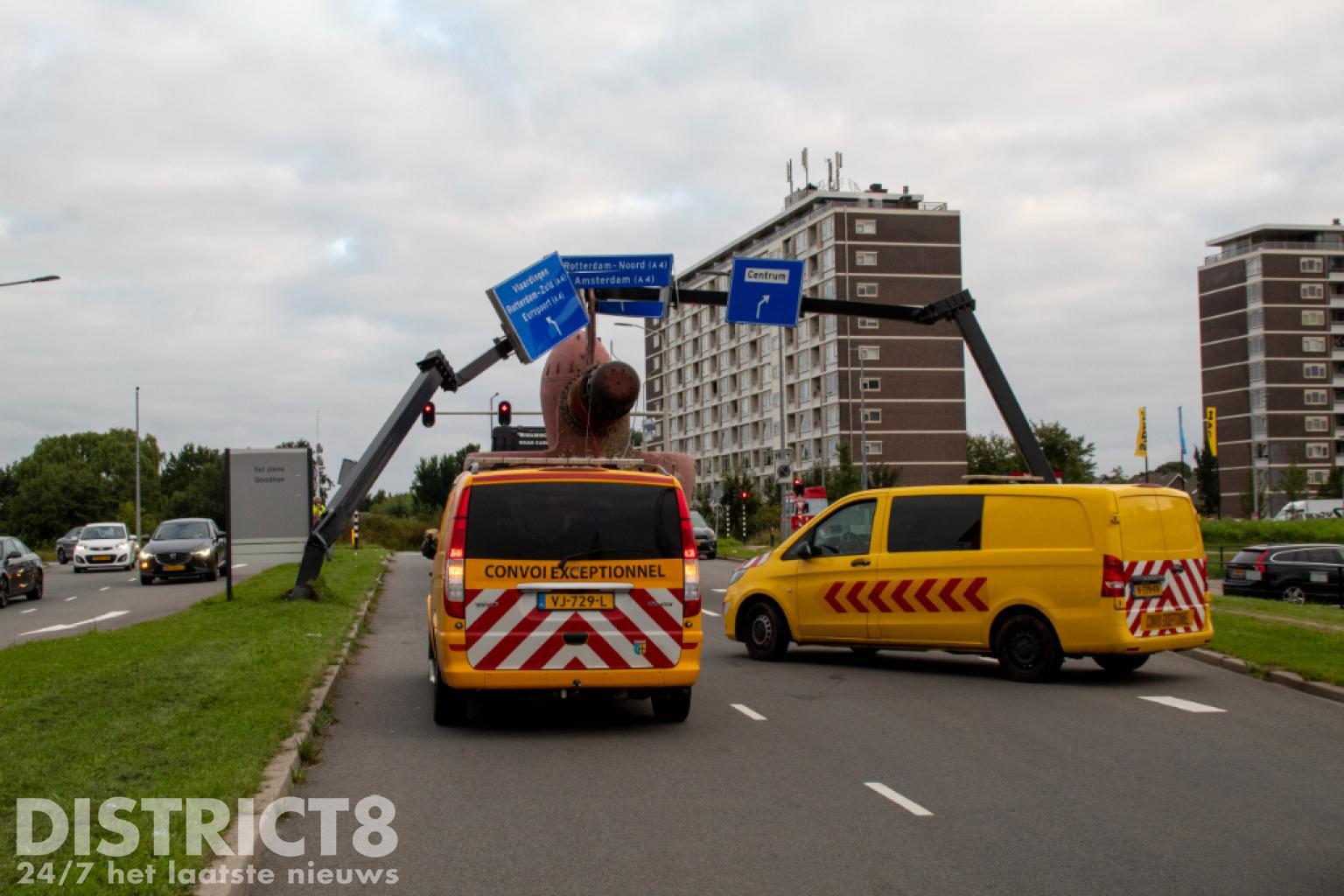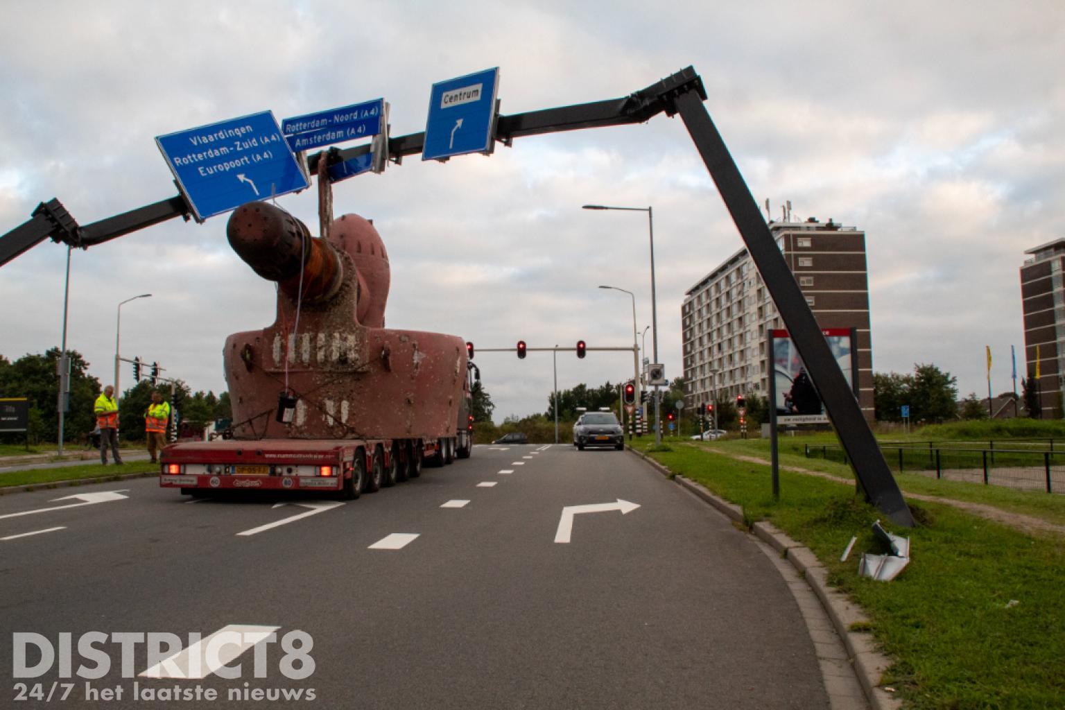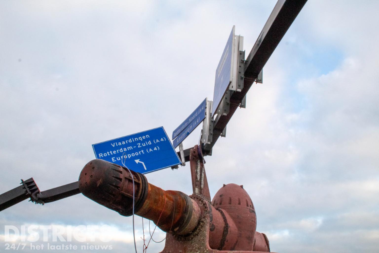 Vlaardingen – Op de Karel Doormanweg heeft een vrachtwagen met oplegger met daarop een flink gevaarte de bewegwijzeringsborden boven de weg geramd.