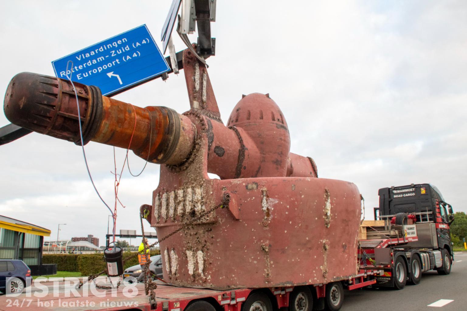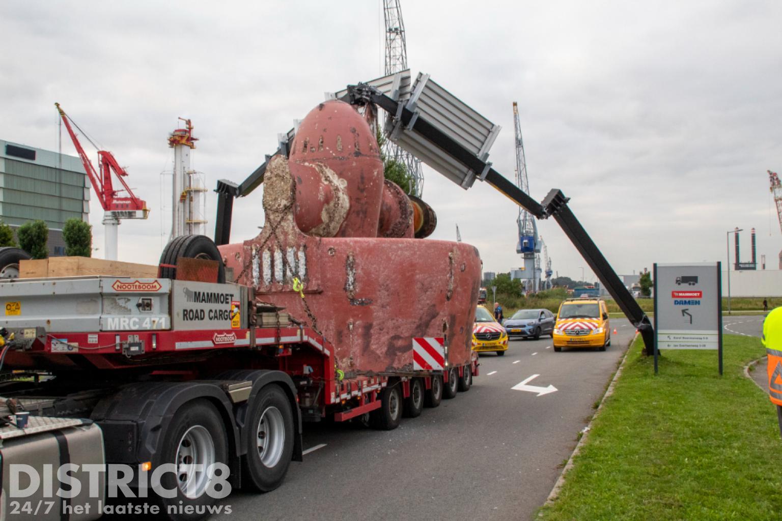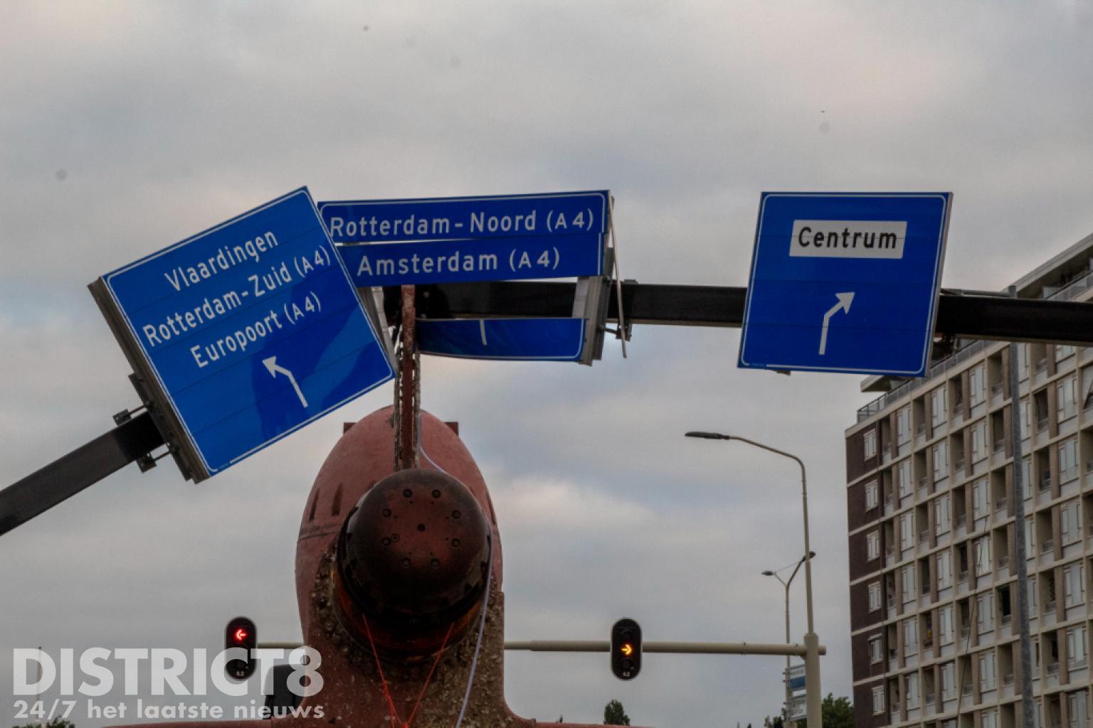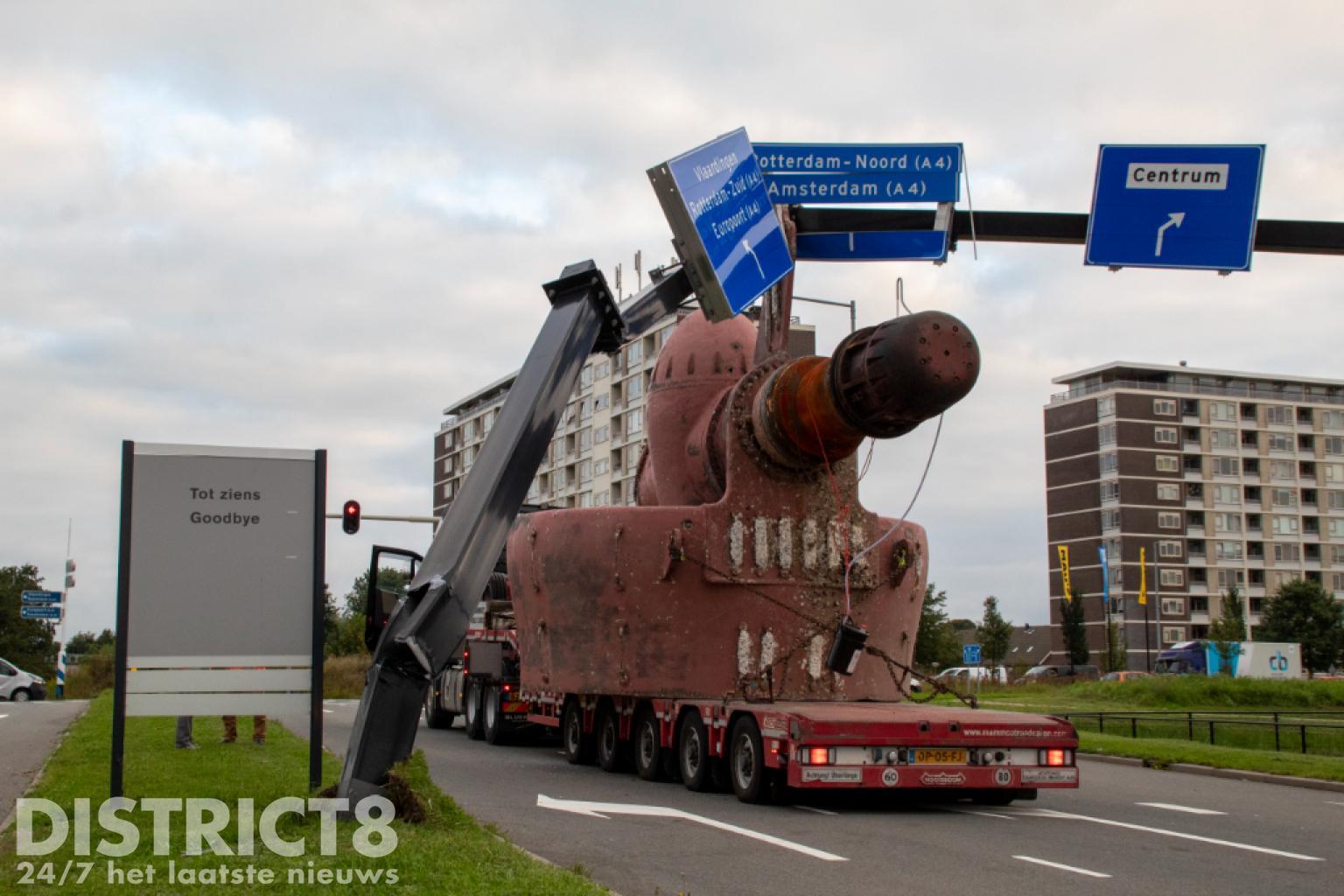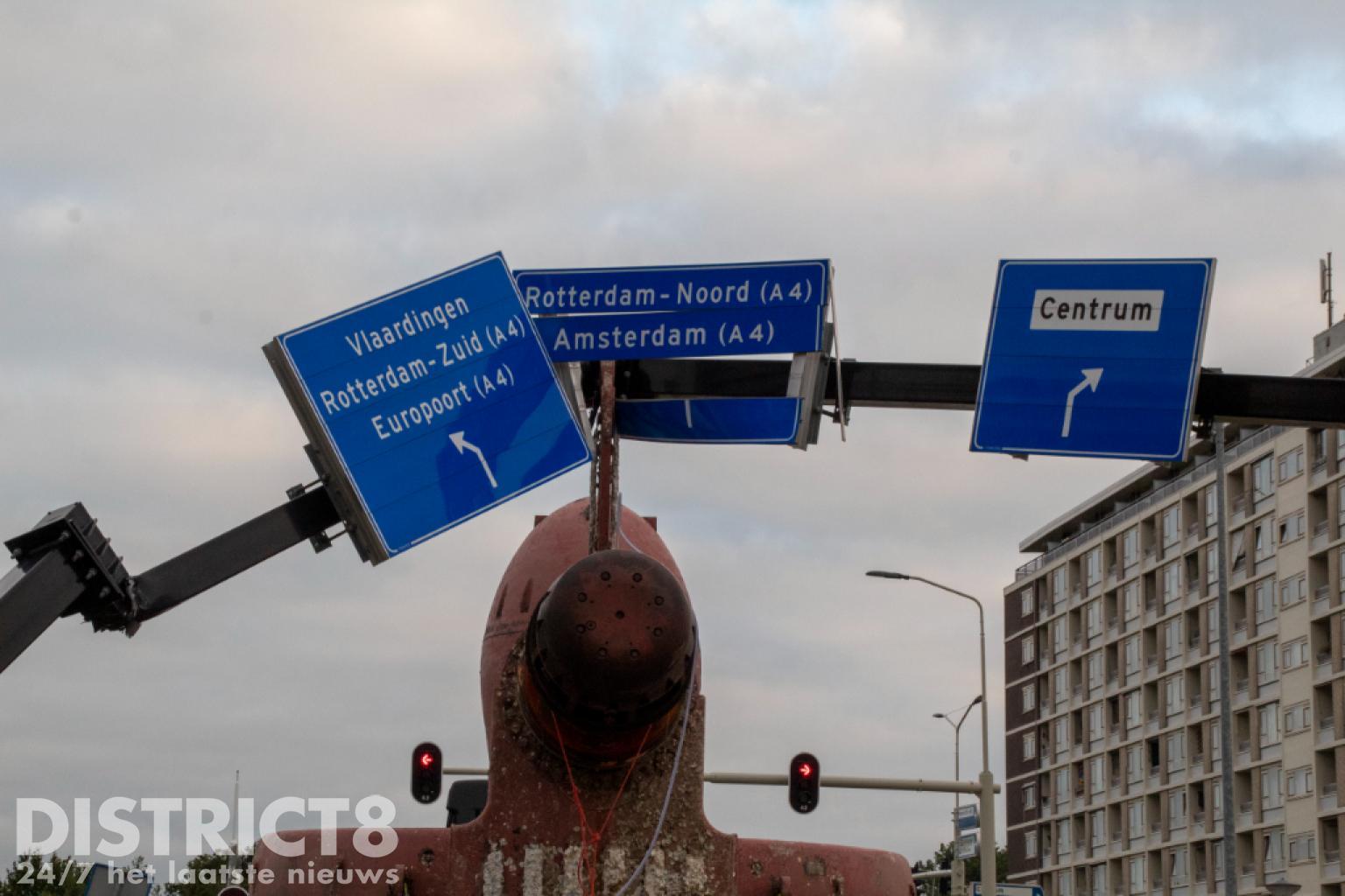 Vlaardingen – Op de Karel Doormanweg heeft een vrachtwagen met oplegger met daarop een flink gevaarte de bewegwijzeringsborden boven de weg geramd.