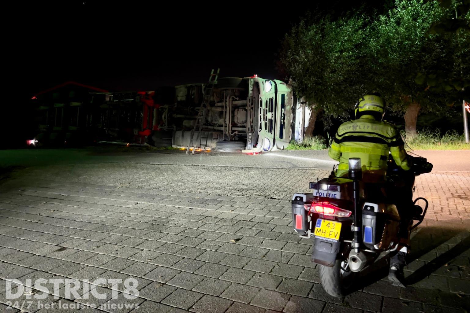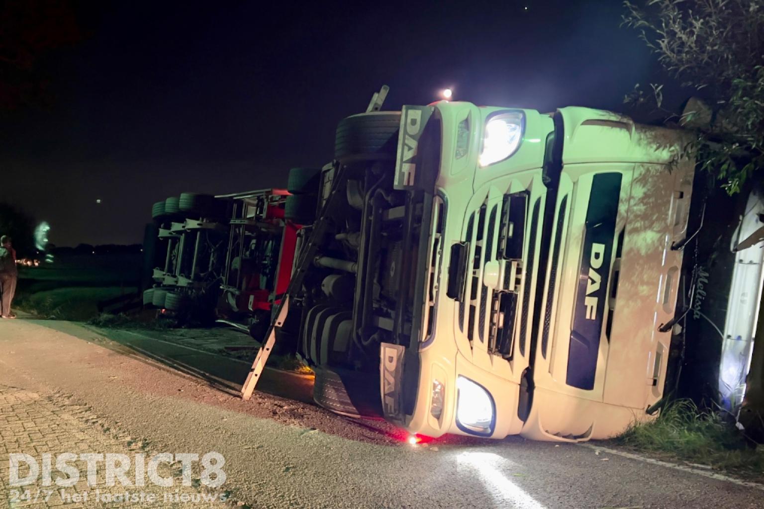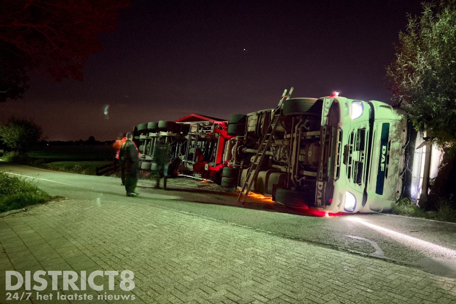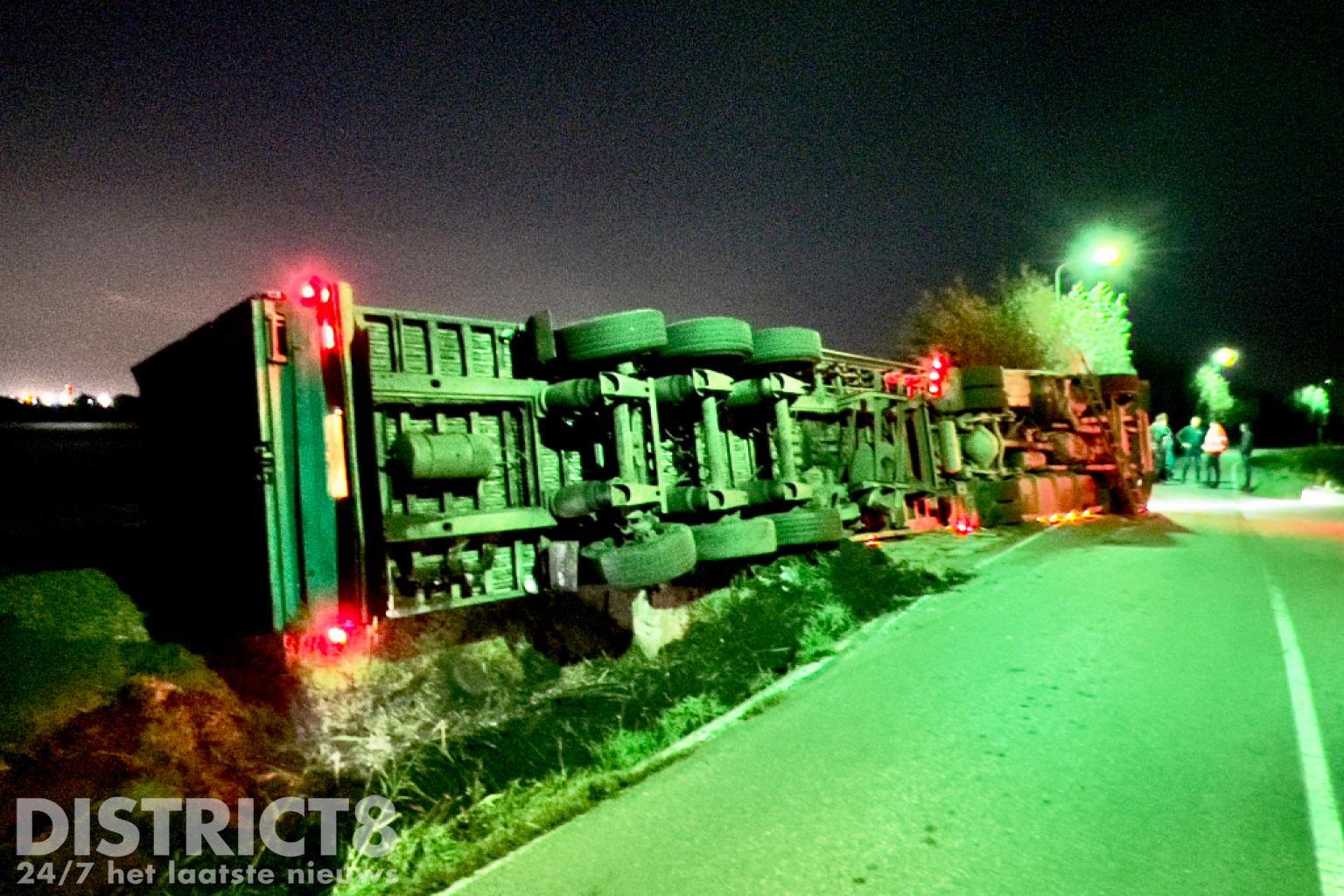 Schipluiden – Op de Oostveenseweg is donderdagavond een vrachtwagen -geladen met maïs- gekanteld en deels in een boerensloot terecht gekomen. De chauffeur vertelde dat hij met het linker voorwiel in de berm terecht kwam, waarna er geen houden meer aan was. De combinatie kantelde direct. De cabine is hierbij tegen een boom aangekomen waarbij de chauffeur lichtgewond raakte.