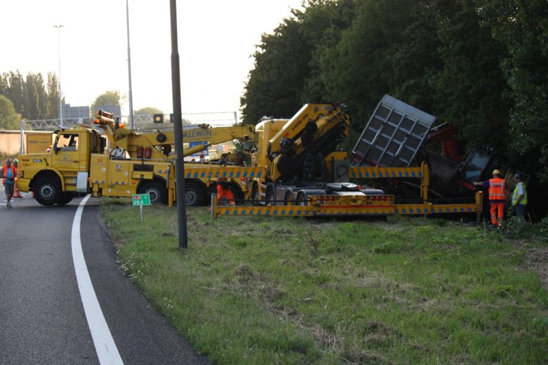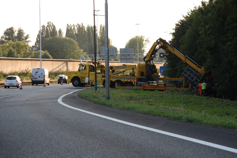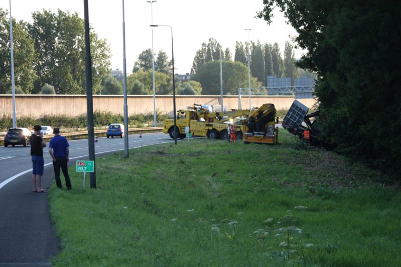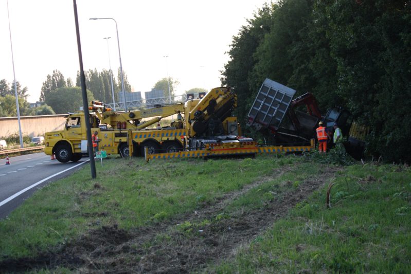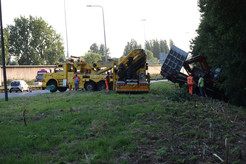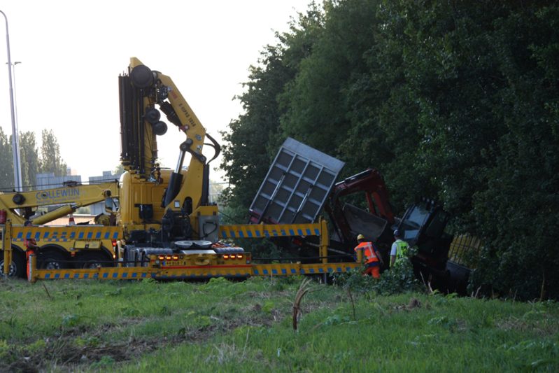 Vanavond is de vrachtwagen die eerder vandaag te water raakte langs de A20 in Vlaardingen geborgen. Meerdere takelwagens moesten er aan te pas komen om het gevaarte, met daarop nog een kleine graafmachine, weer uit de sloot te krijgen.