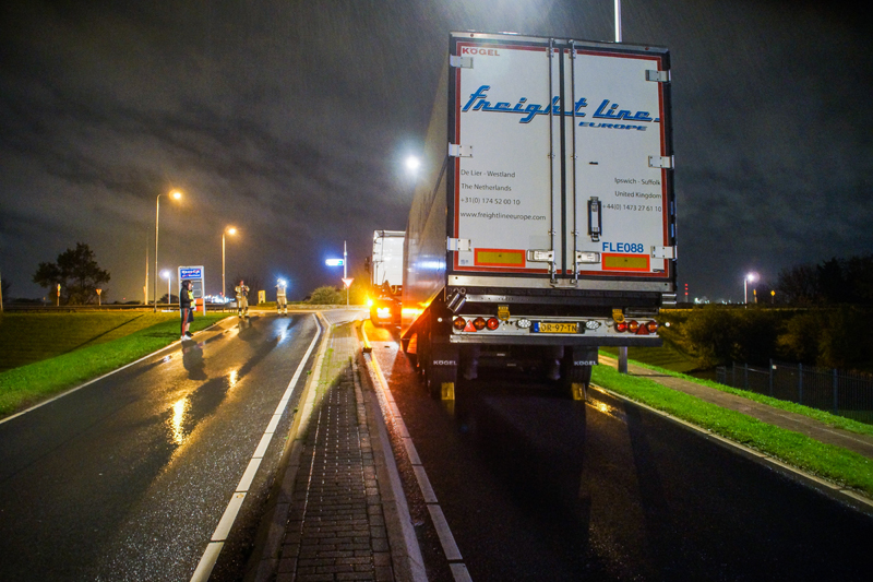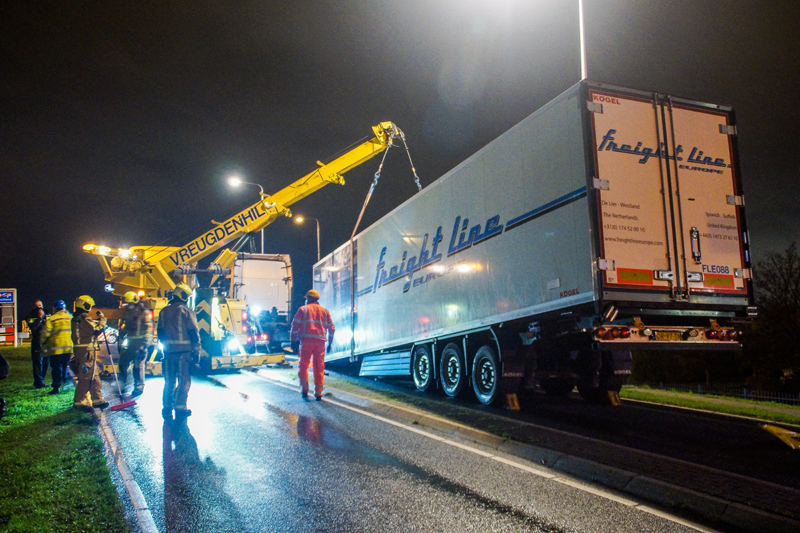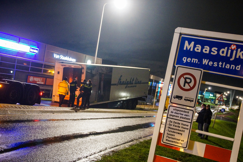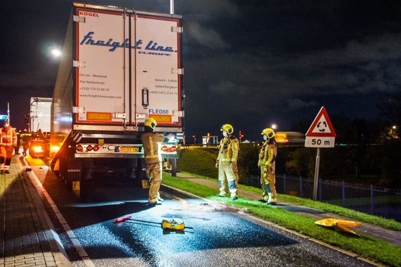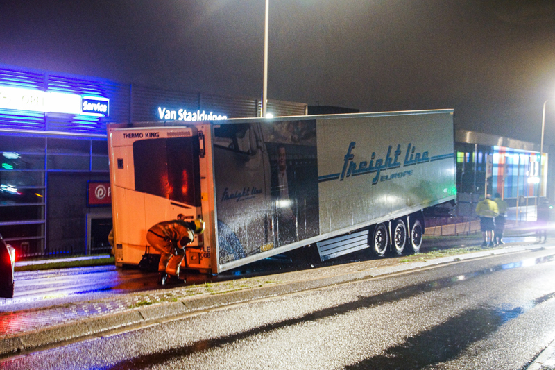 Maasdijk – De brandweer van Maasdijk en politie moesten zondagavond 1 november uitrukken naar het Honderdland in Maasdijk. Aldaar was een vrachtwagen zijn trailer verloren.