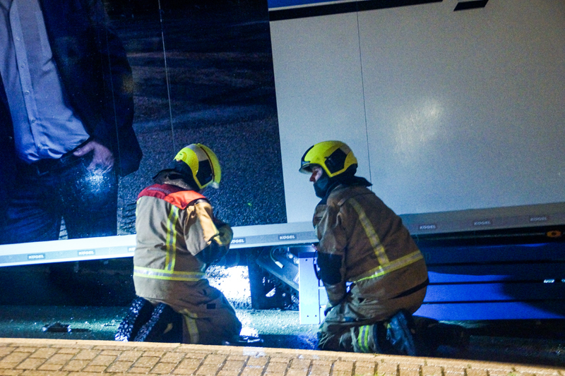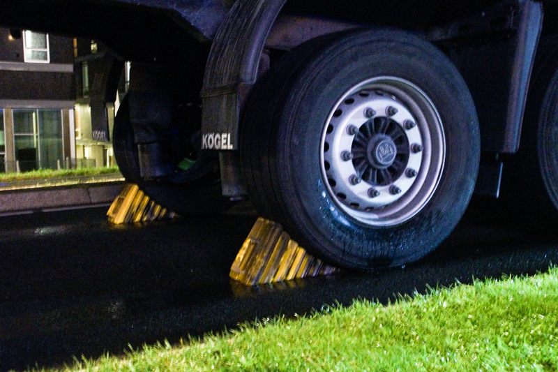 De vrachtwagencombinatie stonden bovenaan een helling. Met wat steunblokken bij de wielen kon worden voorkomen dat de trailer naar beneden rolde.