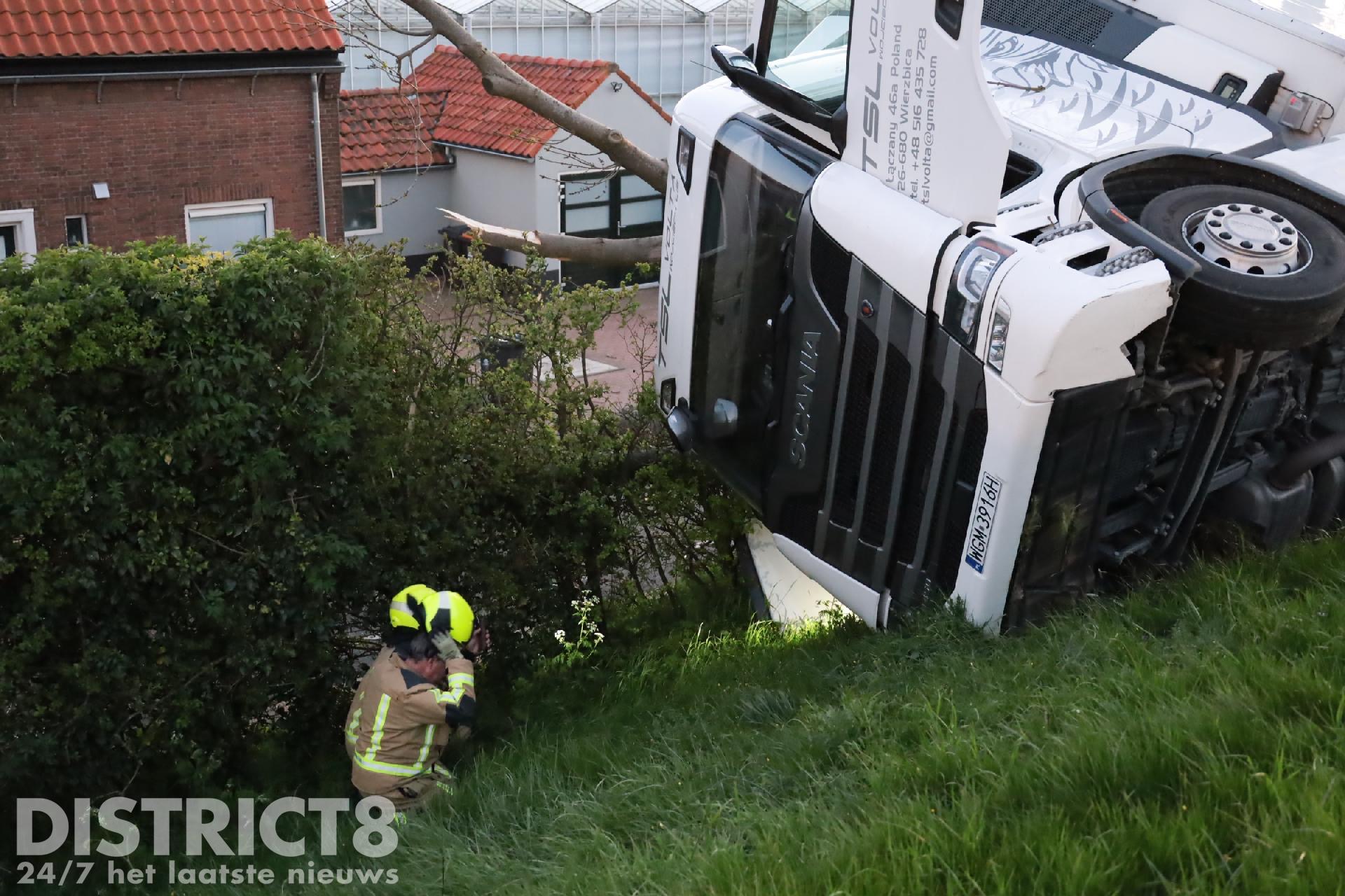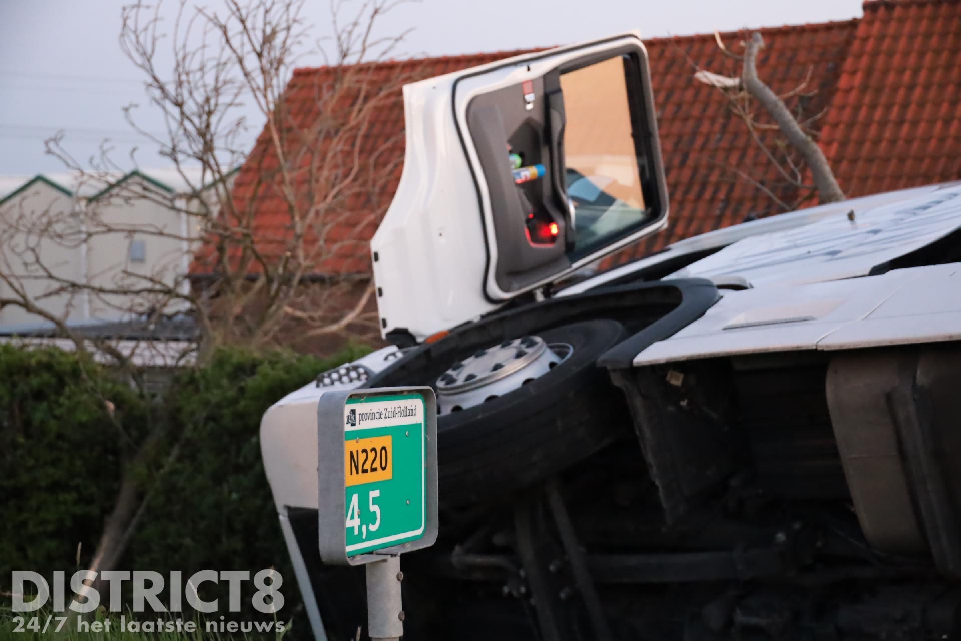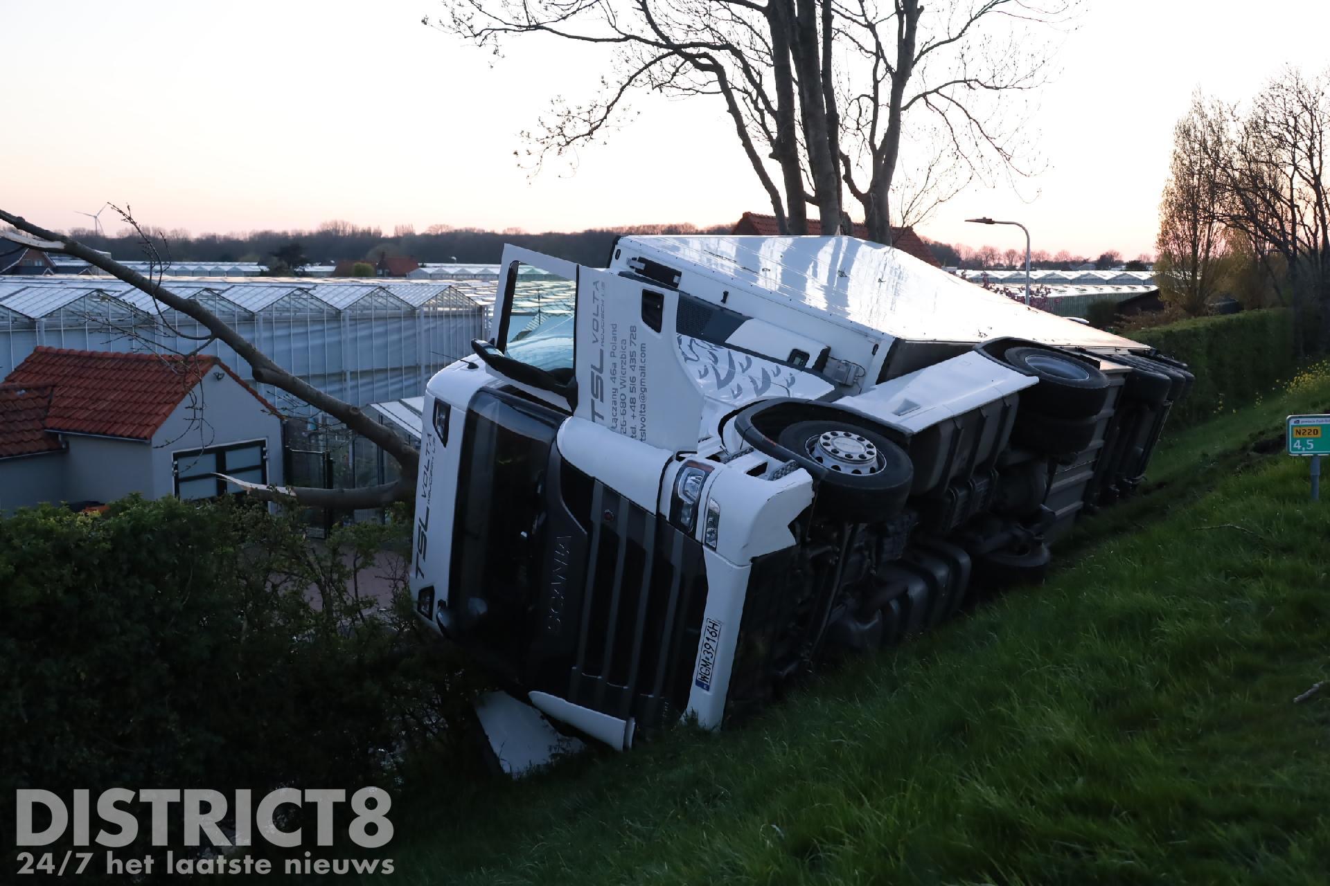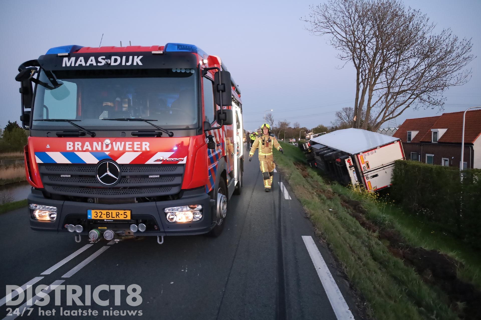 Maasdijk – Op de N220 in Maasdijk is er op woensdagavond 19 april een vrachtwagen van de weg geraakt na een eenzijdig ongeval.