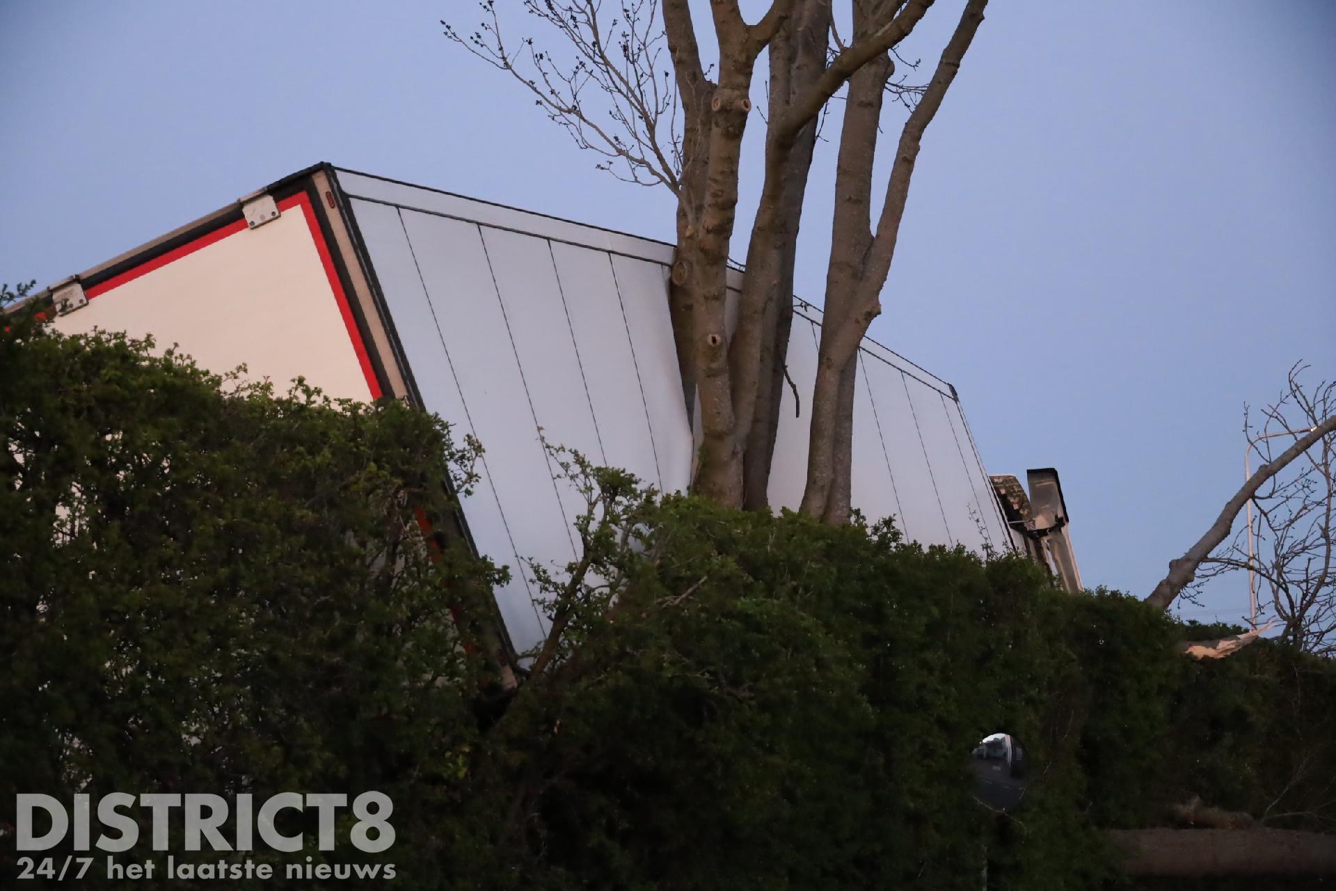 Eenmaal ter plaatse bleek de vrachtwagen van de weg te zijn geraakt en belandde op de zijkant langs de weg en leunt tegen een boom aan.