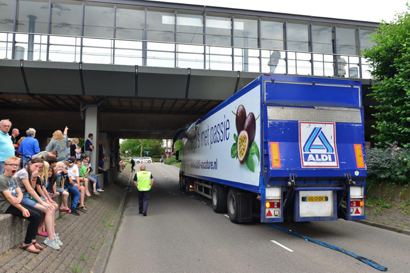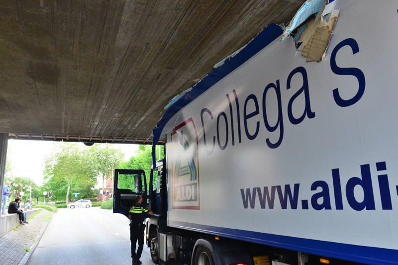 Zoetermeer – Een vrachtwagenchauffeur van de Aldi heeft dinsdagmiddag een verkeerde inschatting gemaakt. Op de Parkdreef in Zoetermeer kwam hij met zijn vrachtwagen klem te zitten onder een viaduct.