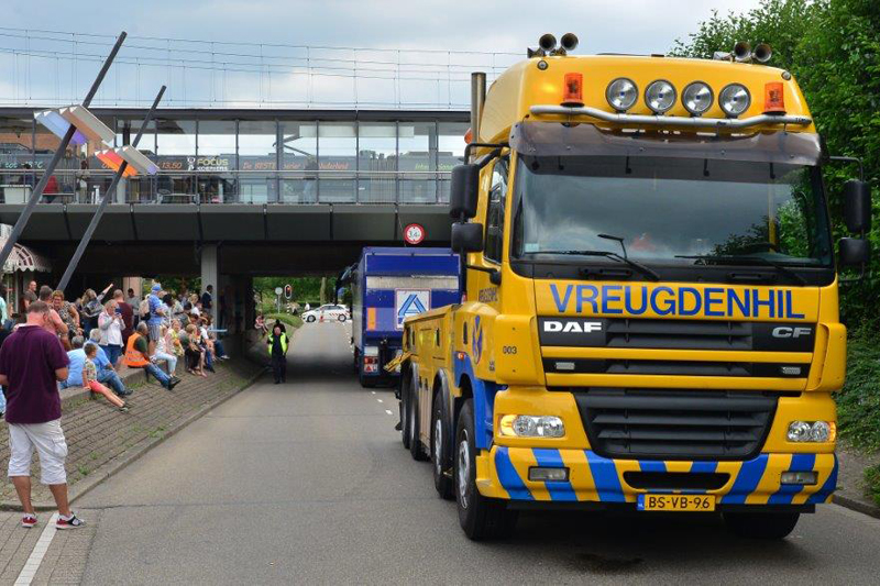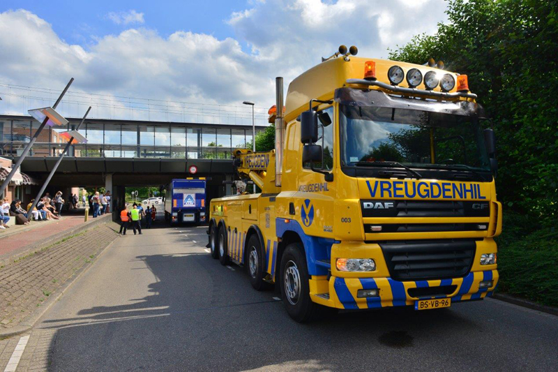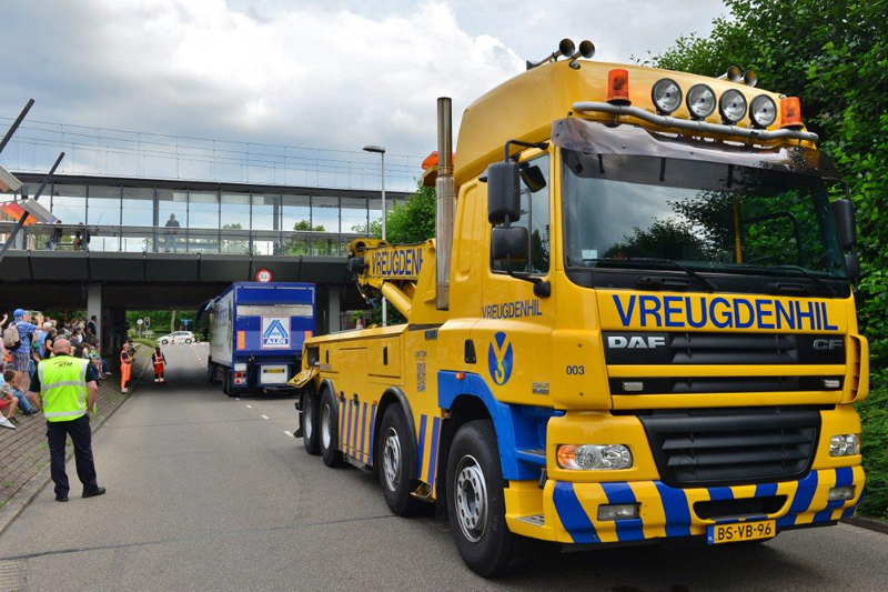 Het grote bergingsvoertuig van Vreugdenhil moest er aan te pas komen om de vrachtwagen vlot te trekken.