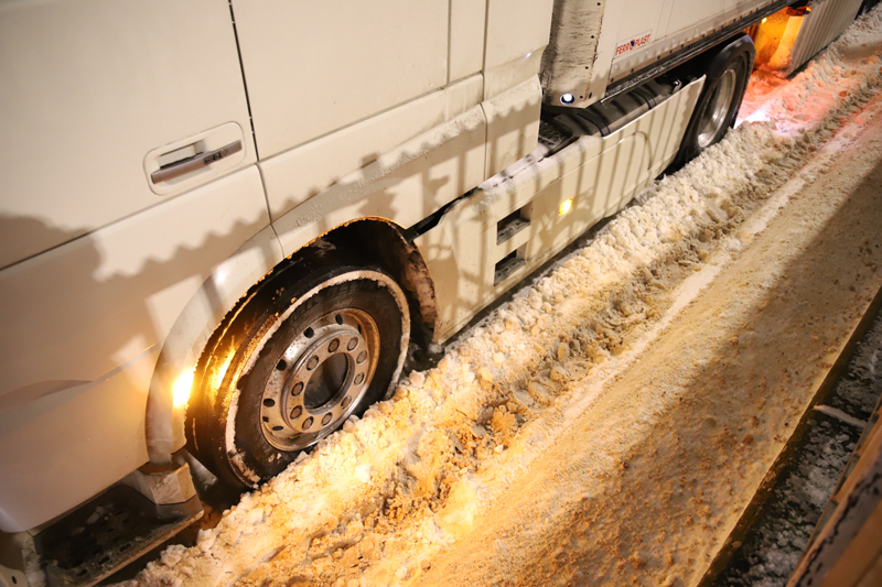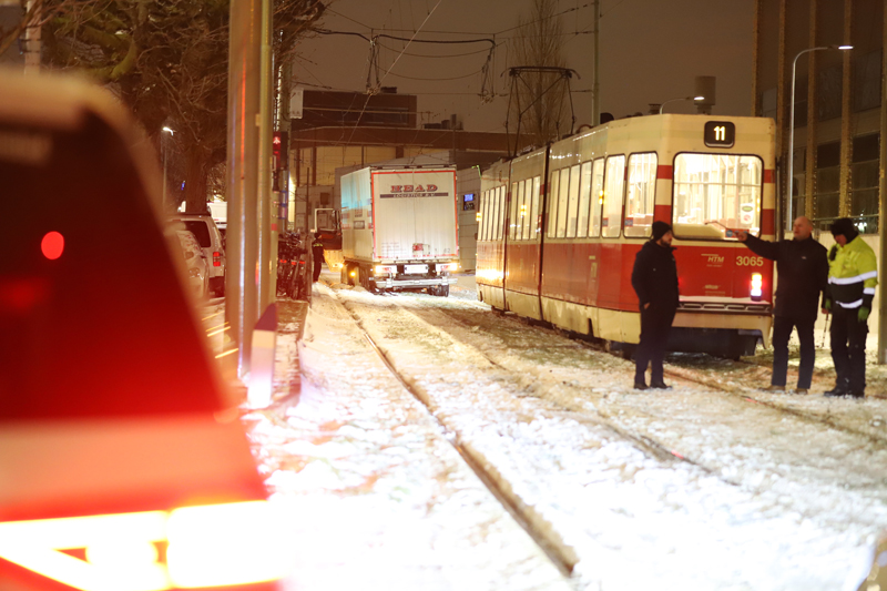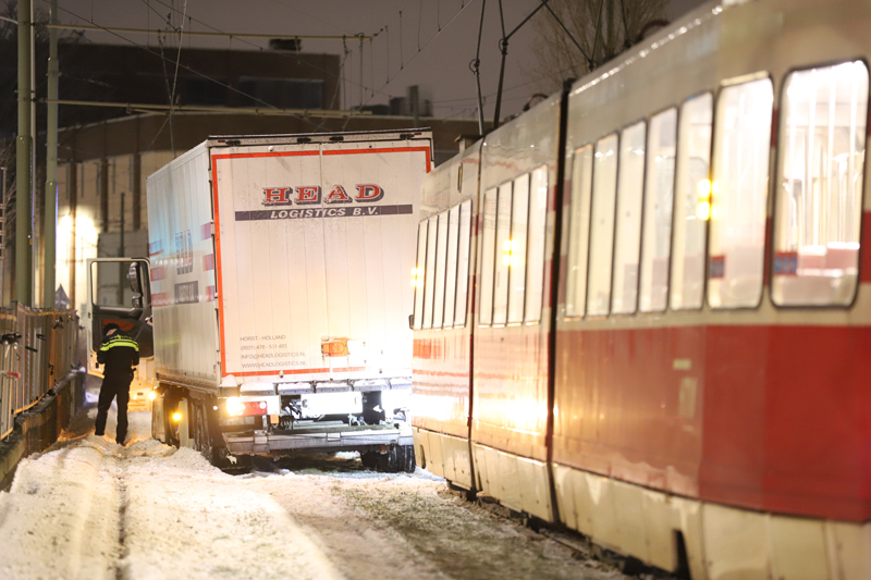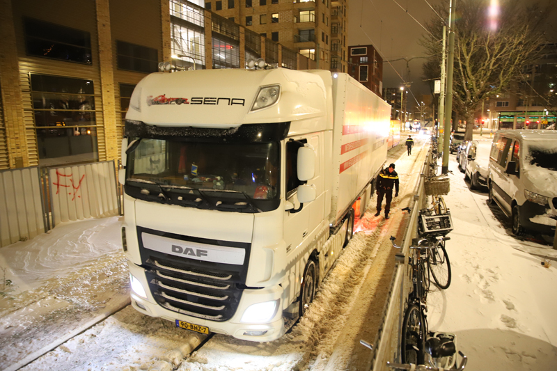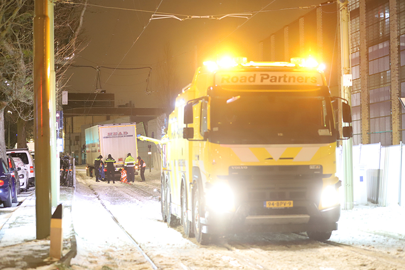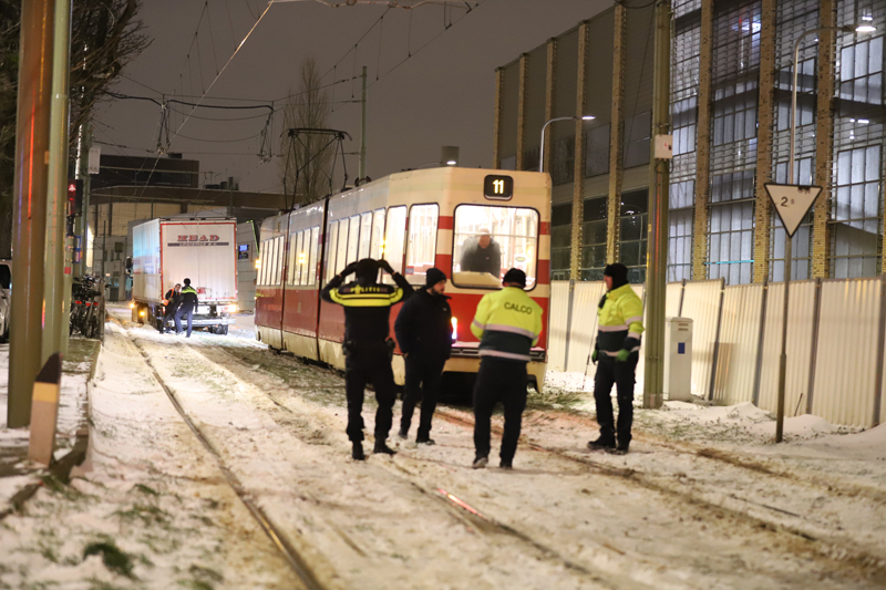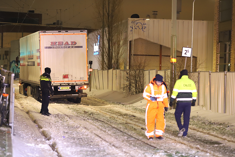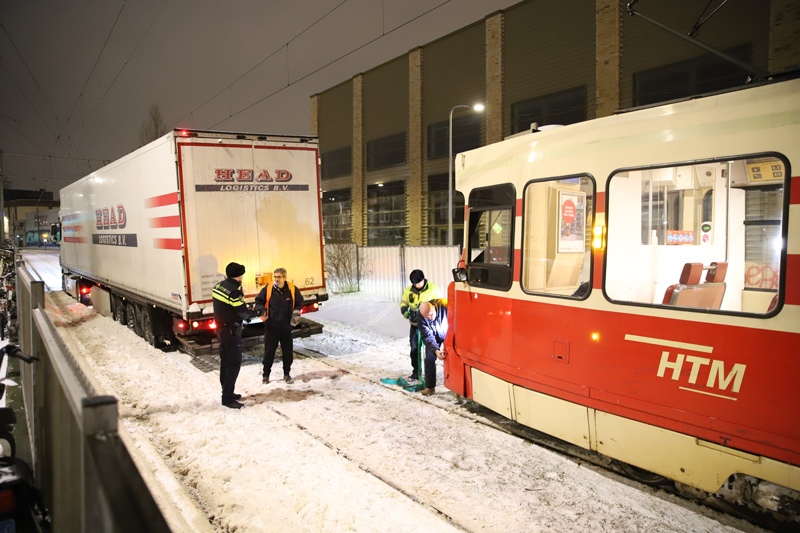 Na enkele meters op de trambaan te hebben gereden kwam hij tot stilstand. Naar voor of naar achter was geen optie meer. De vrachtwagen stond muurvast.