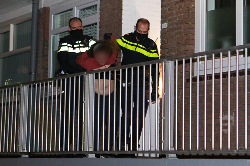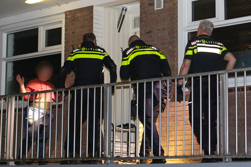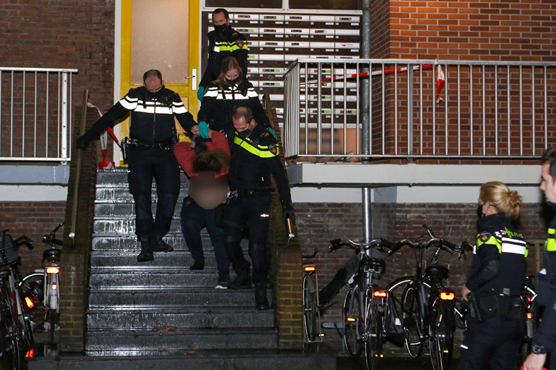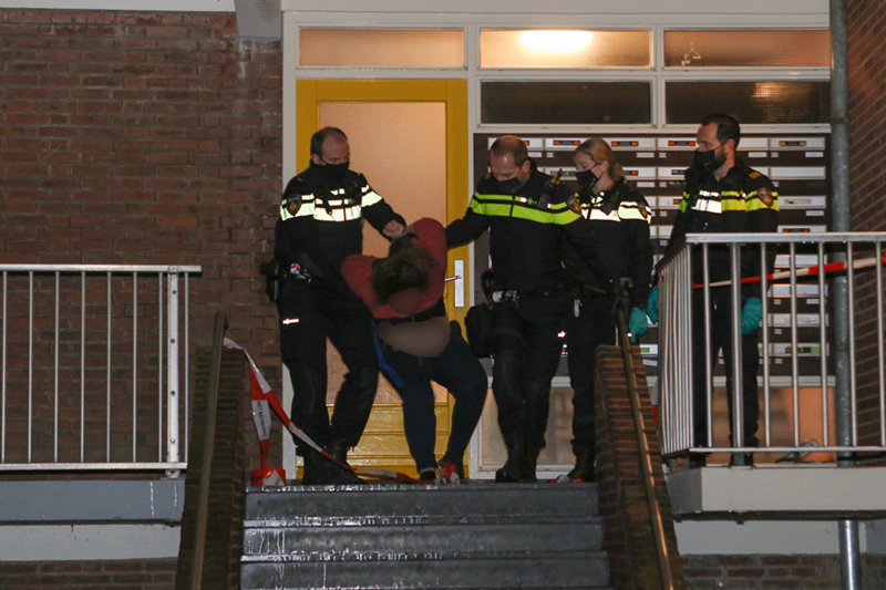 Het MMT en het ambulancepersoneel ontfermde zich over het slachtoffer terwijl de agenten de sporen van het bloed volgde naar de woning waar het incident plaats gevonden had. Hier stond een vrouw in de deur opening, nadat zeker was dat ze niets meer in haar handen had werd ze geboeid en konden de agenten de met bloed besmeurde woning doorzoeken.