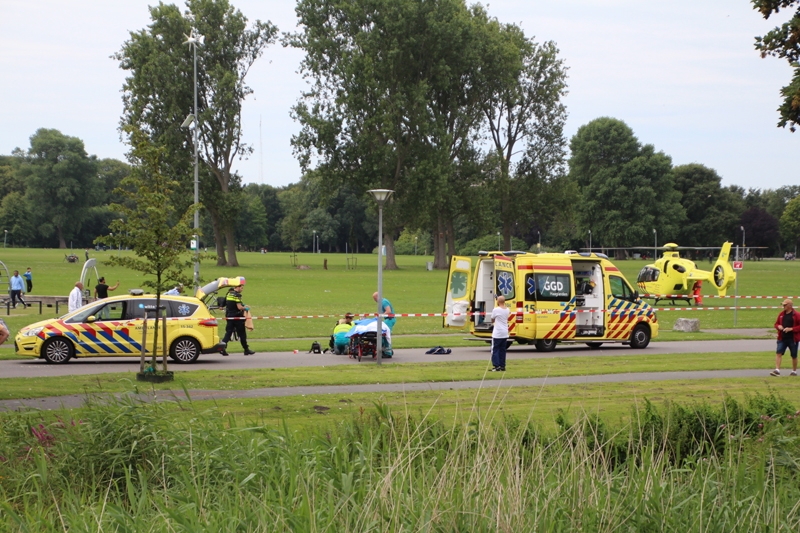 Ter plaatse bleek er een dame met skeelers ongelukkig ten val te zijn gekomen. De traumahelikopter is geland in het Zuiderpark, de arts van het MMT heeft het ambulancepersoneel enige tijd ondersteund bij behandeling van het slachtoffer.