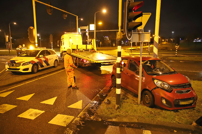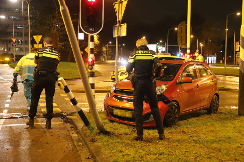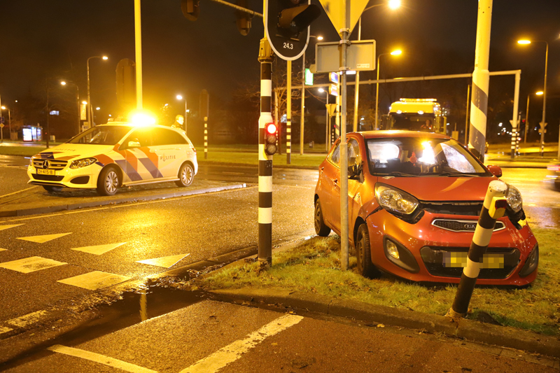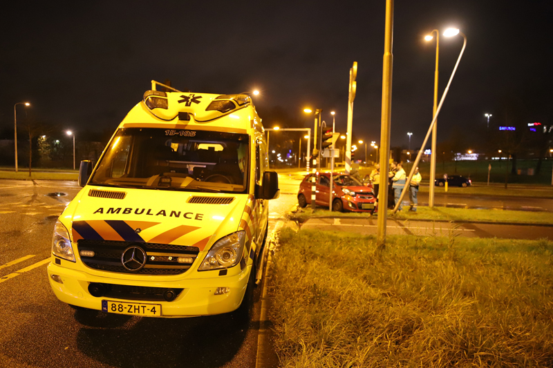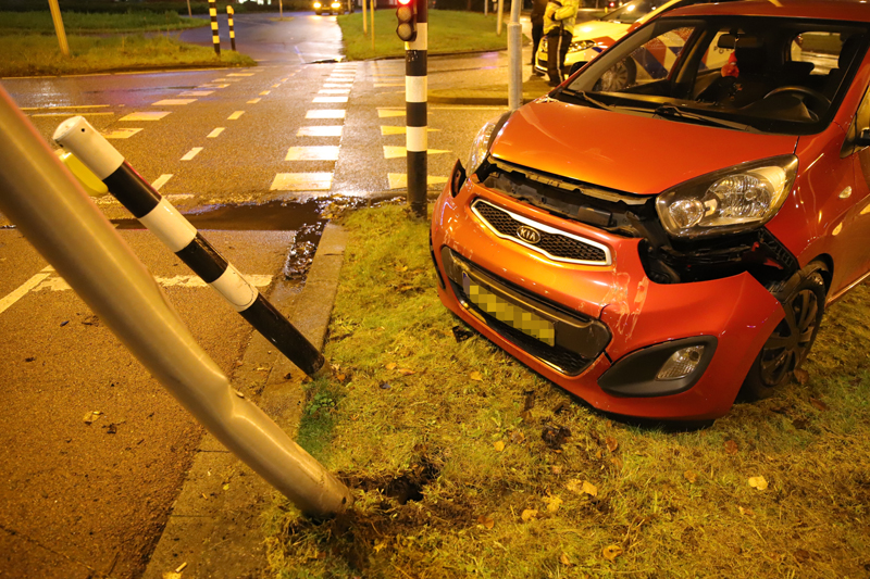 De auto kwam uiteindelijk tot stilstand tegen een lantaarnpaal en een paal voor het stoplicht. De vrouw raakte hierbij lichtgewond.
