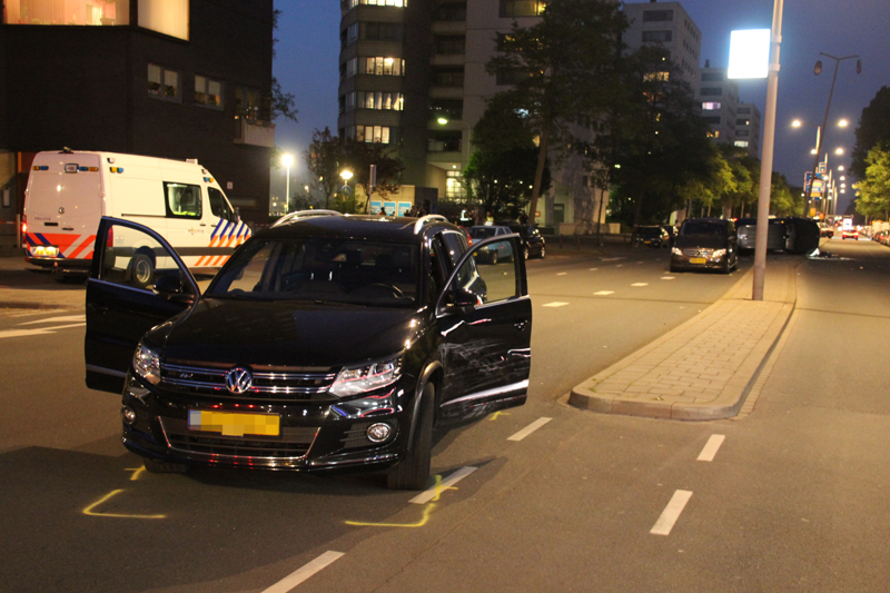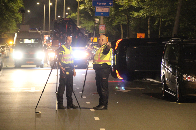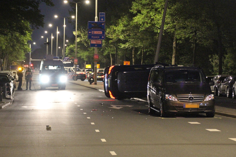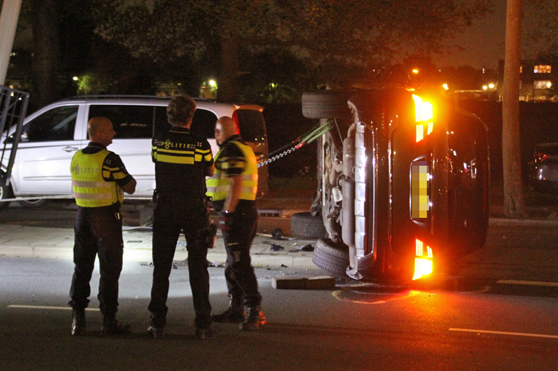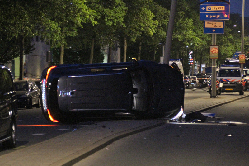 Den Haag – Op de Erasmusweg in Den Haag is een auto van het arrestatieteam van de weggeraakt bij een achtervolging. Het arrestatieteam achtervolgde een auto met hoge snelheid toen de AT wagen tegen een lantaarnpaal knalde. De auto kwam hierdoor op de zijkant terecht.