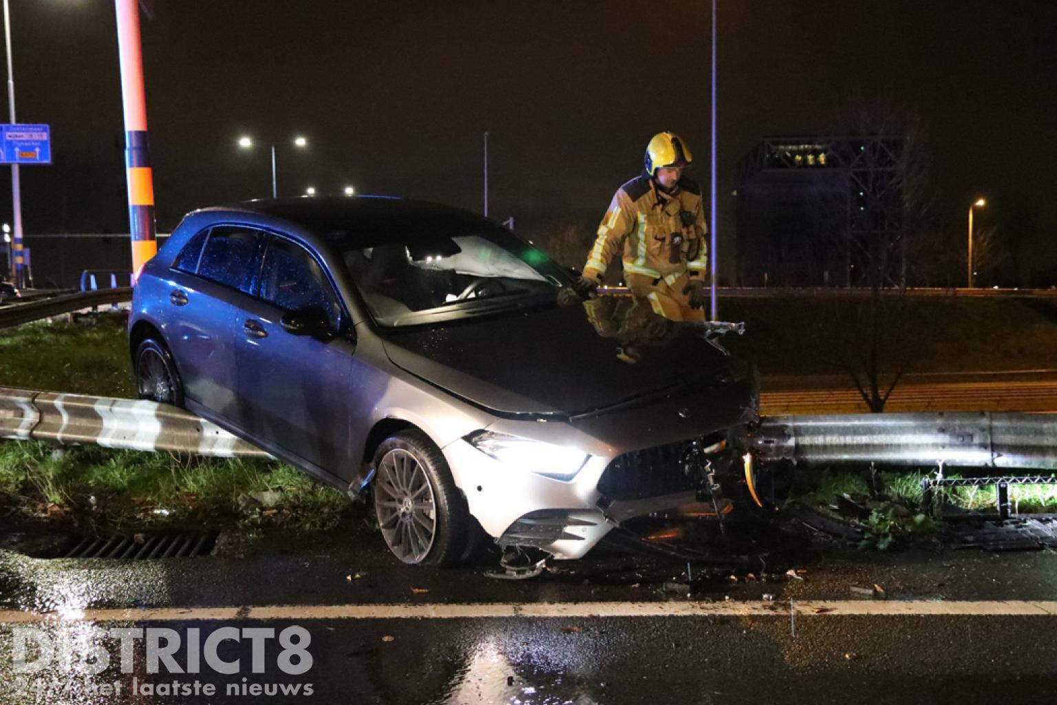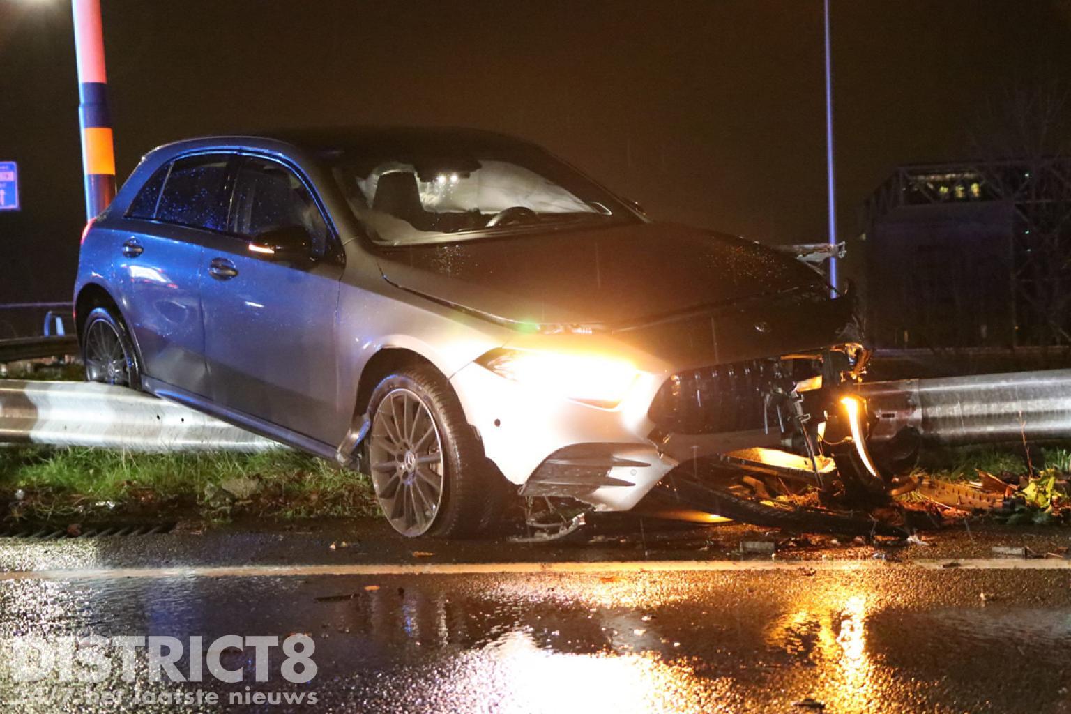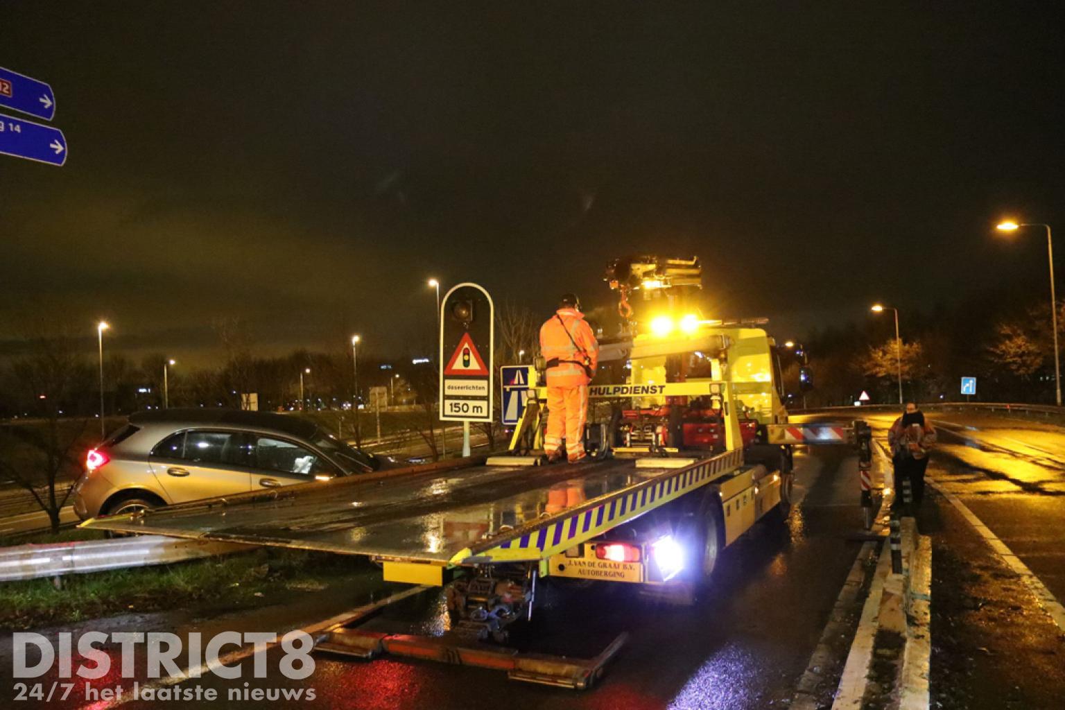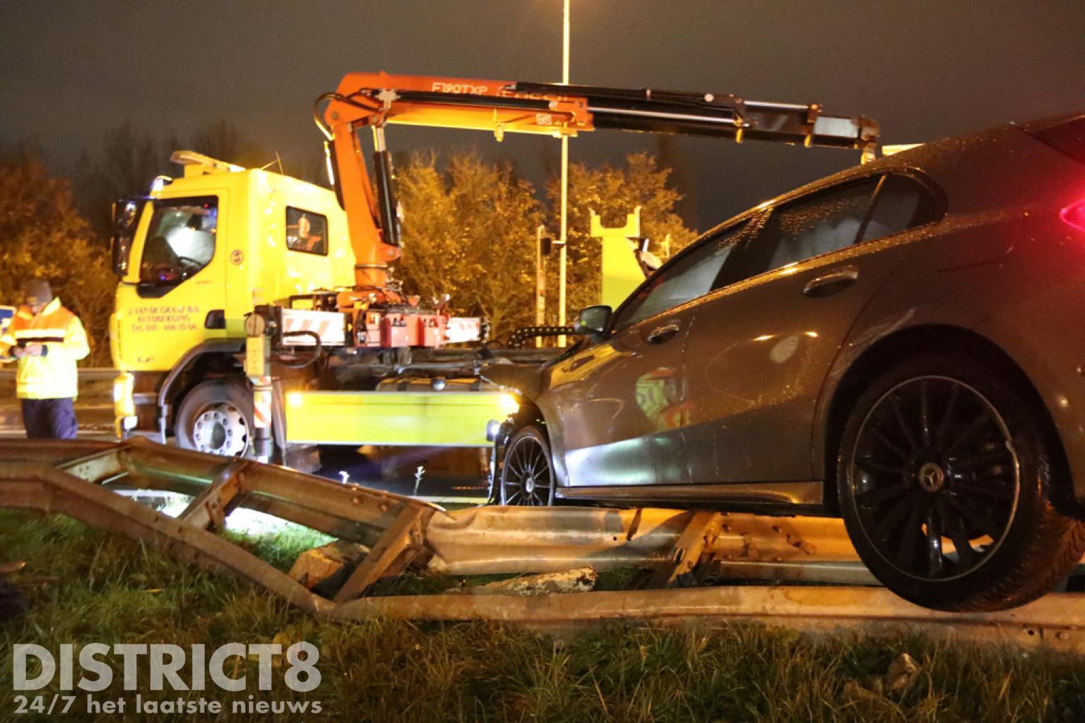 Een bergingsbedrijf is ter plaatse om de personenauto bergen. De Vermeulen Groep zal de schade aan de vangrail repareren.