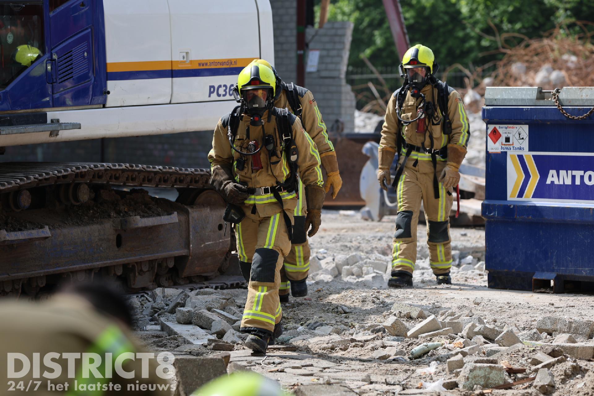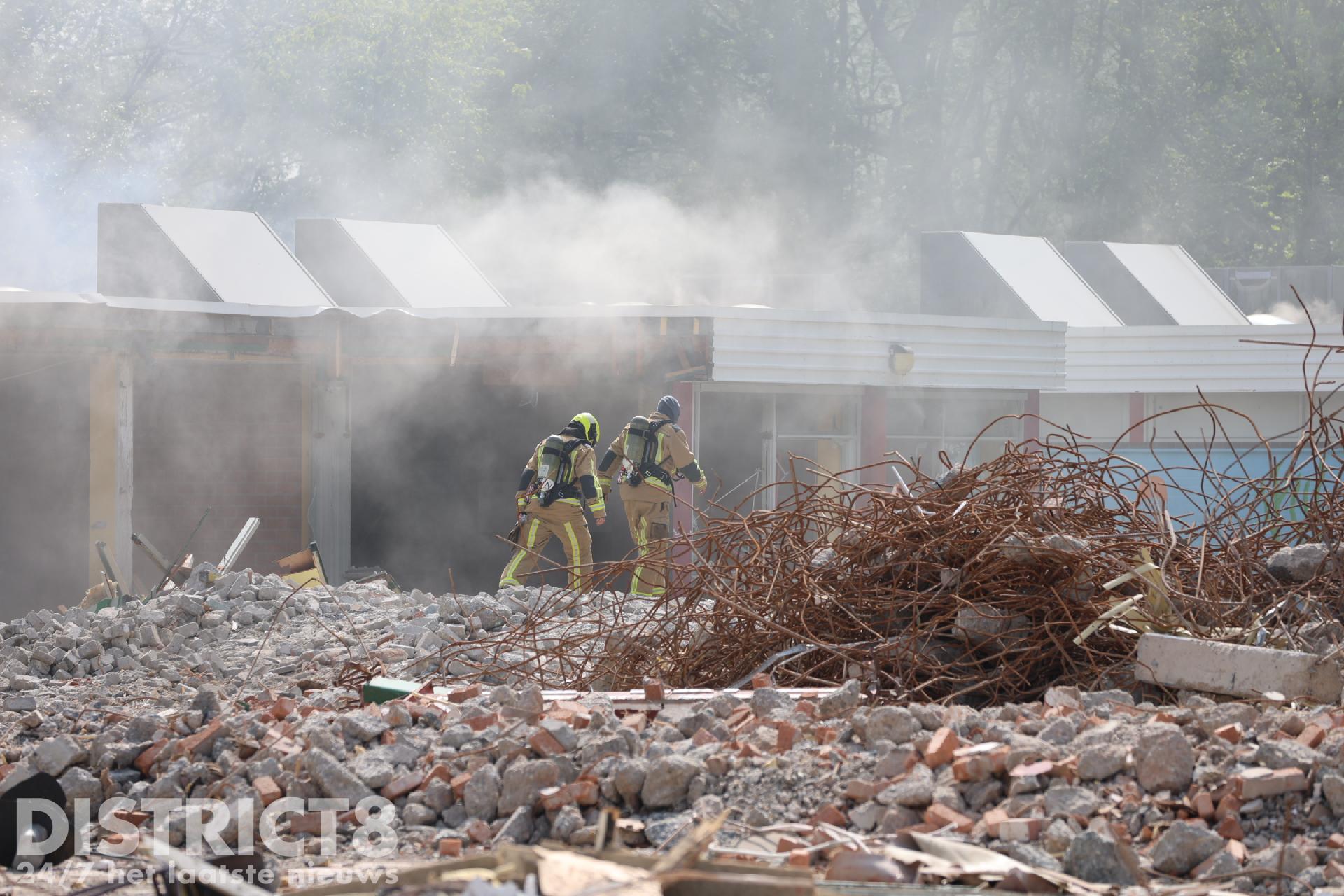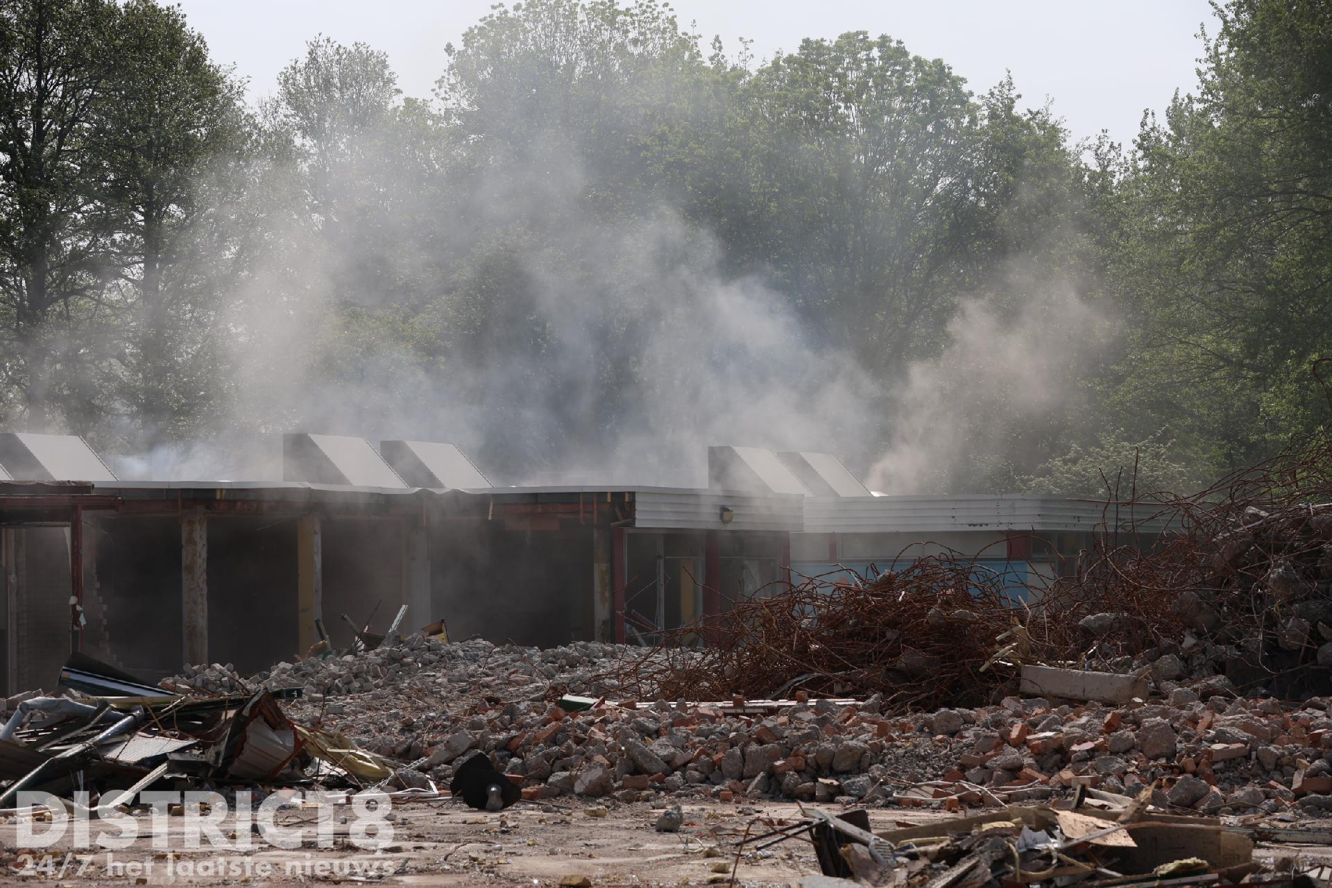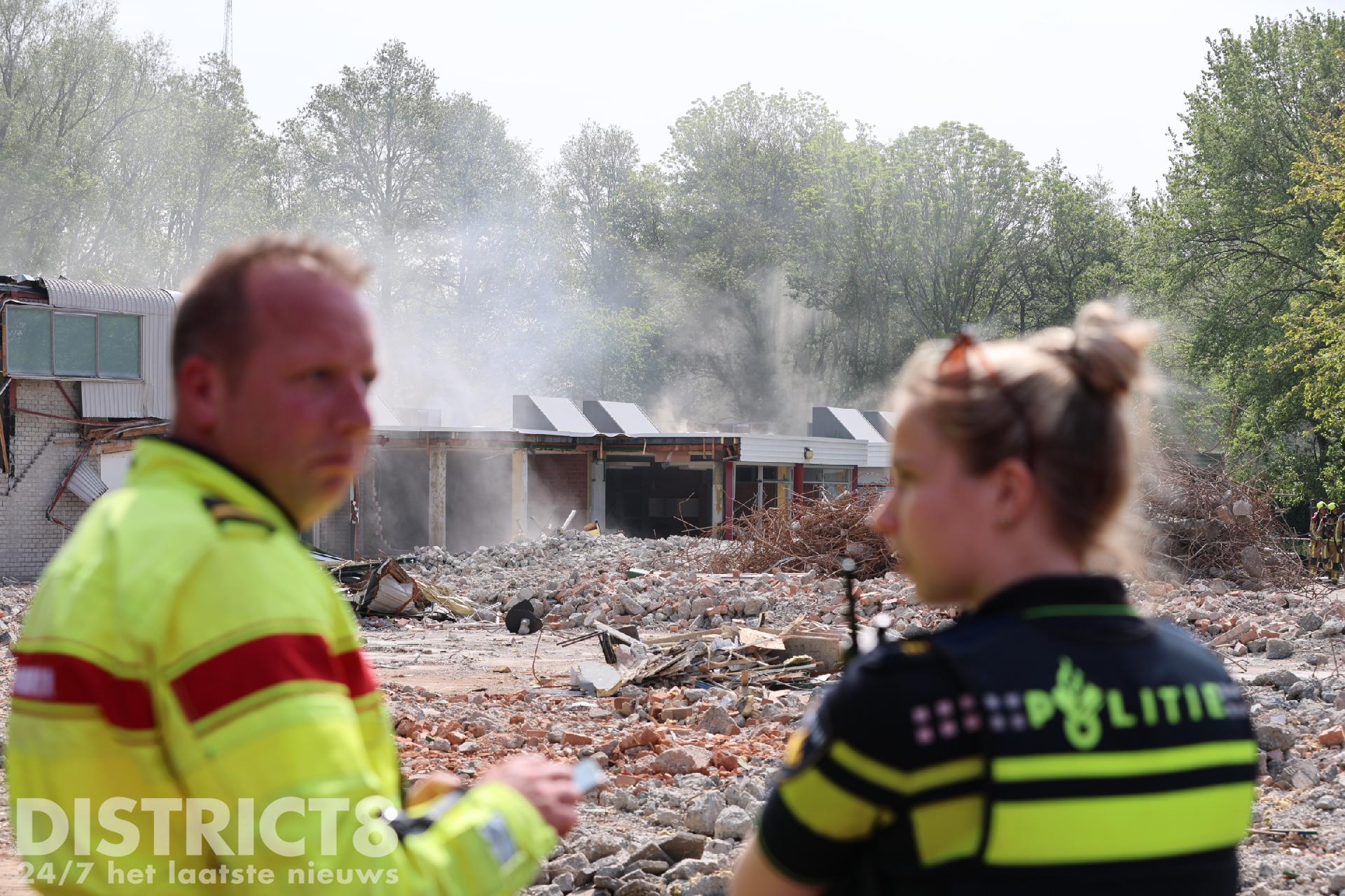 De brandweer is druk bezig met bluswerkzaamheden. Een deel van de school is al gesloopt.