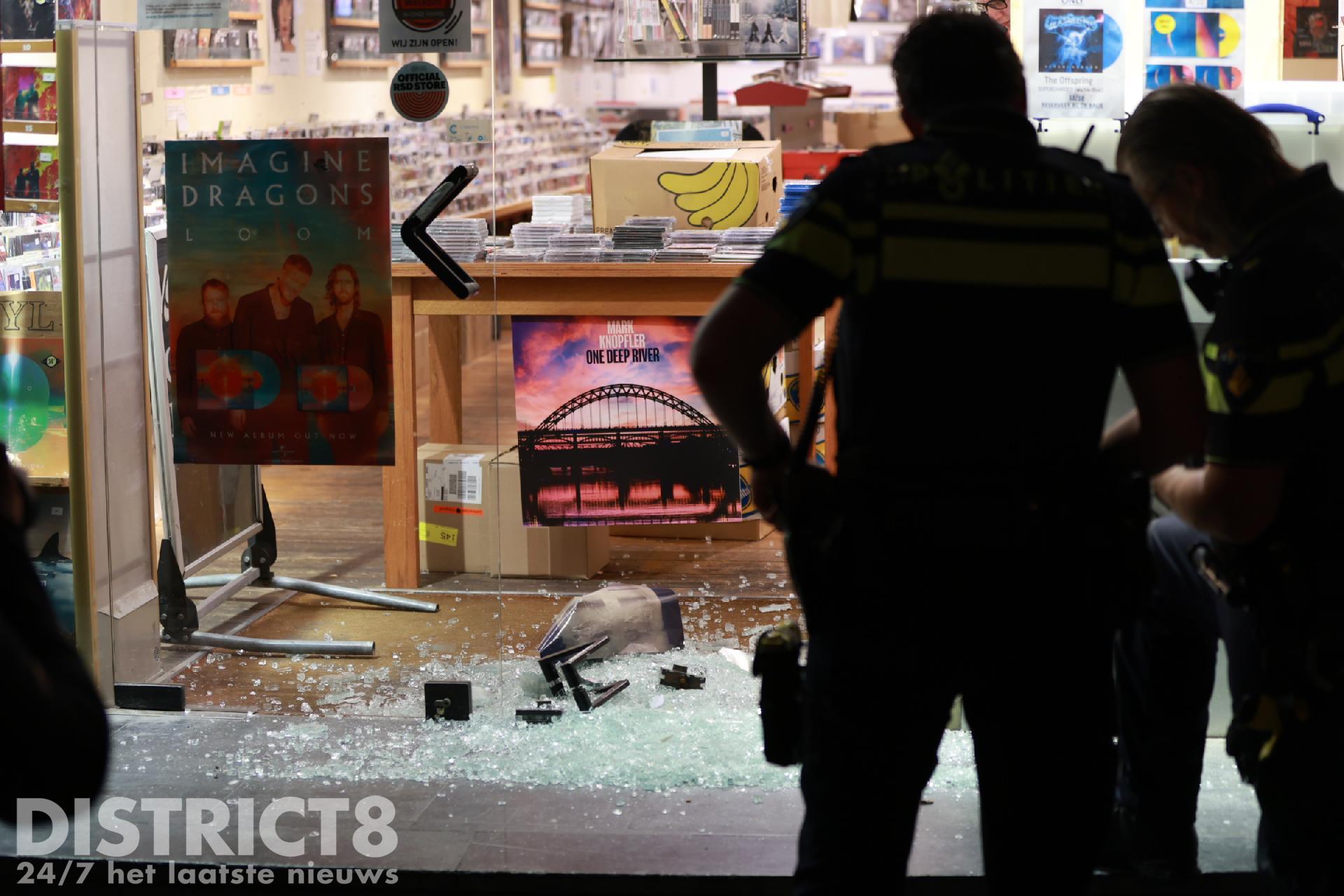 Ter plaatse bleek een winkelruit te zijn vernield, politieagenten verrichten onderzoek naar het waarom van deze vernieling.