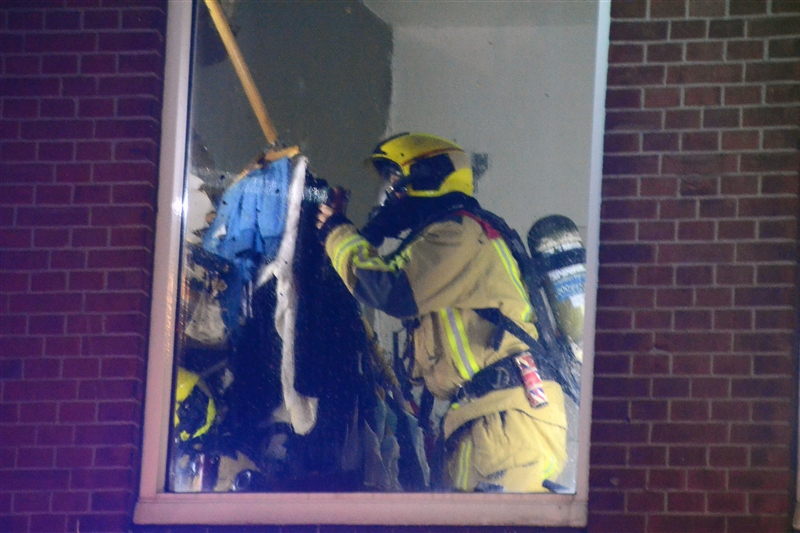 De brandweer verricht sloopwerkzaamheden aan de muur.