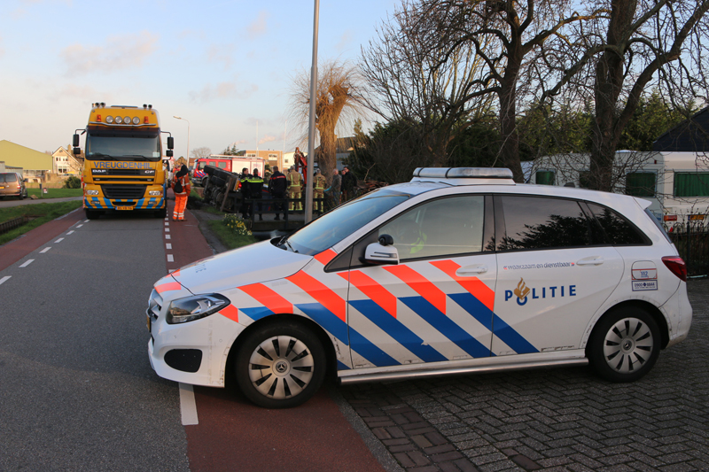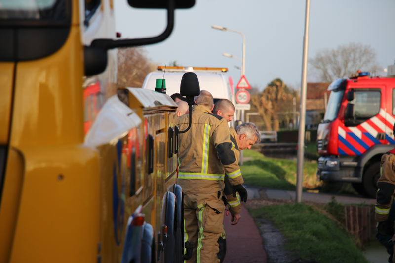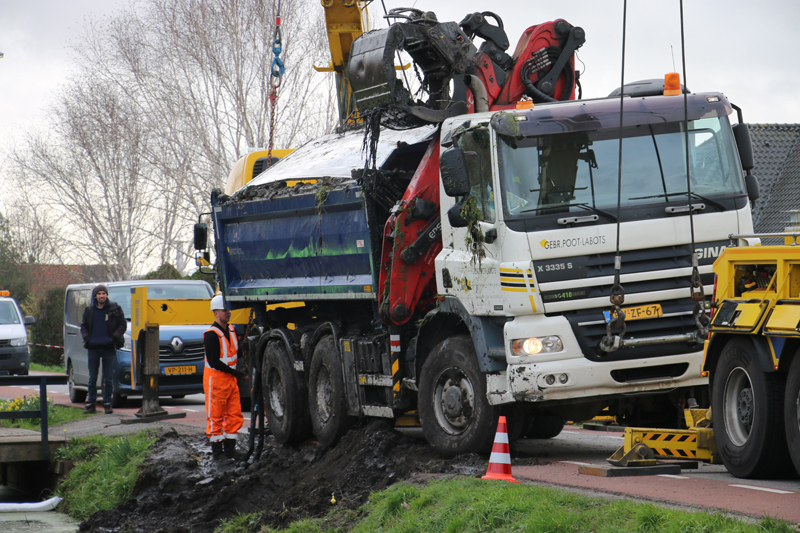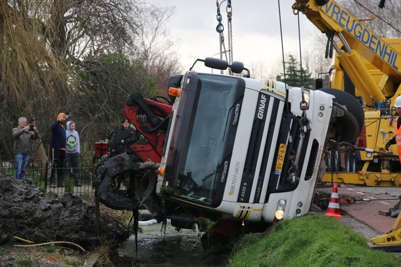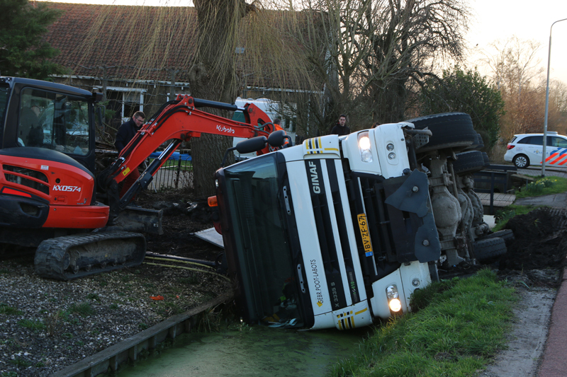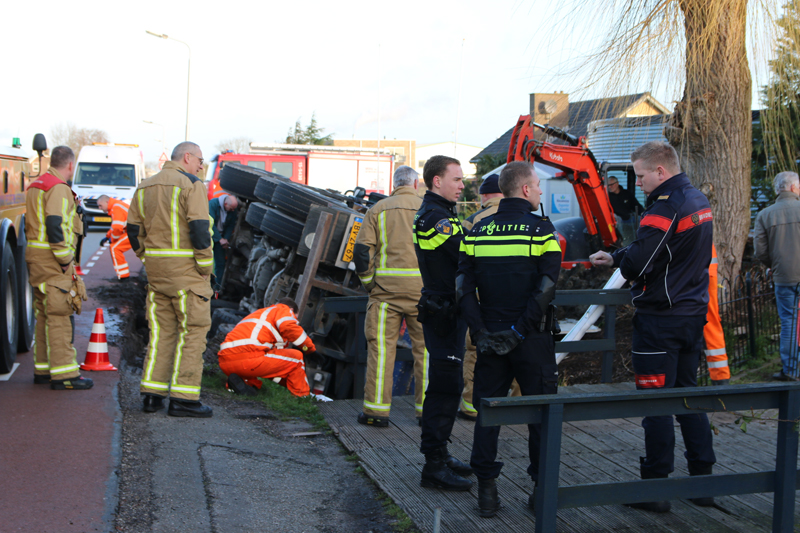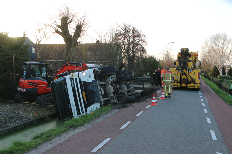 Nootdorp – Aan de Nieuwkoopseweg is een zandwagen op zijn zijkant in het water beland.