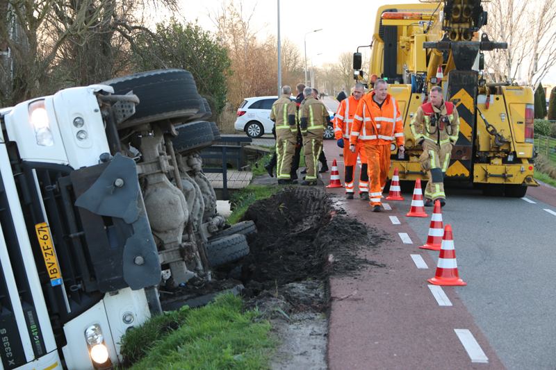 De chauffeur onderschatte de zachte berm, waarna de zandwagen omviel.