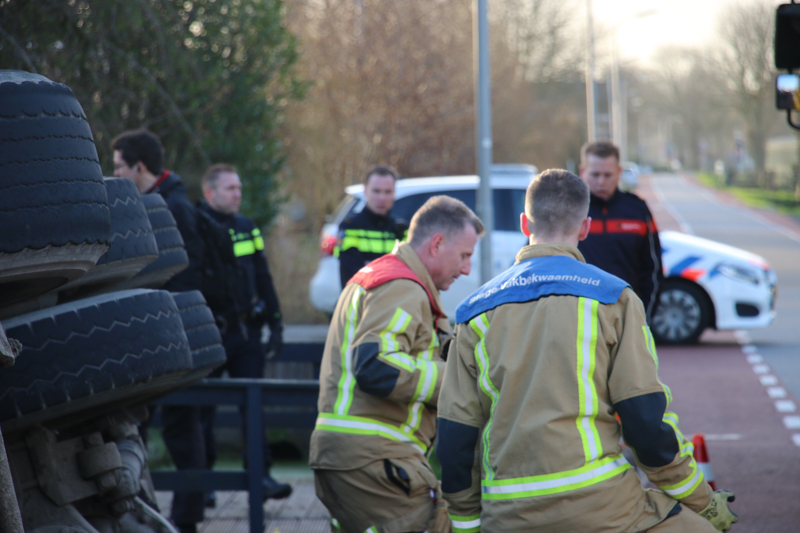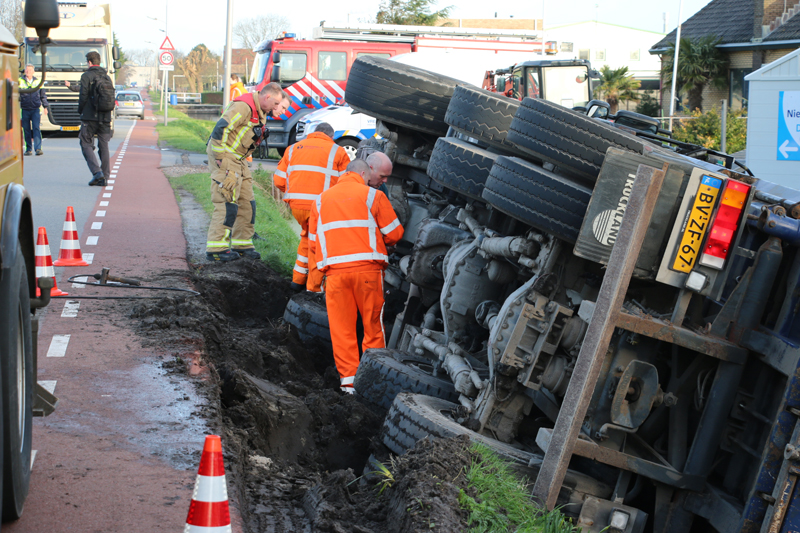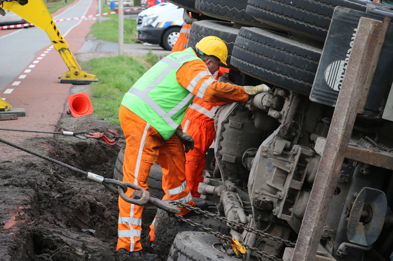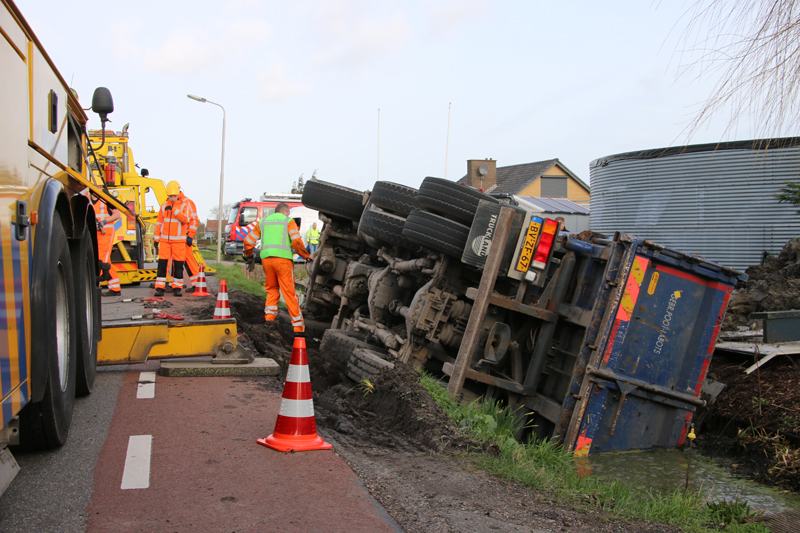 Een zware berger zal de zandwagen proberen terug op zijn wielen te zetten. De weg was door het ongeval tijdelijk afgesloten. De brandweer kwam ter plaatse en voerde hand- en spandiensten uit.