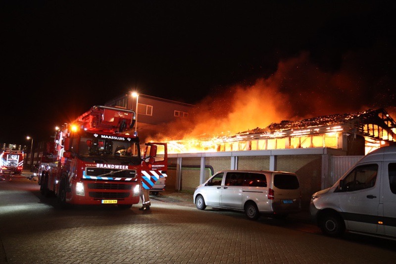 De vlammen sloegen lange tijd uit de loods maar het vuur wordt inmiddels minder door de grote inzet van de brandweer. Grote rookwolken kwamen vrij bij de brand. Korpsen uit de omgeving van onder andere Maassluis, Vlaardingen, Schiedam, Naaldwijk, ‘S-Gravezande en Maasdijk kwamen ook ter plaatse.