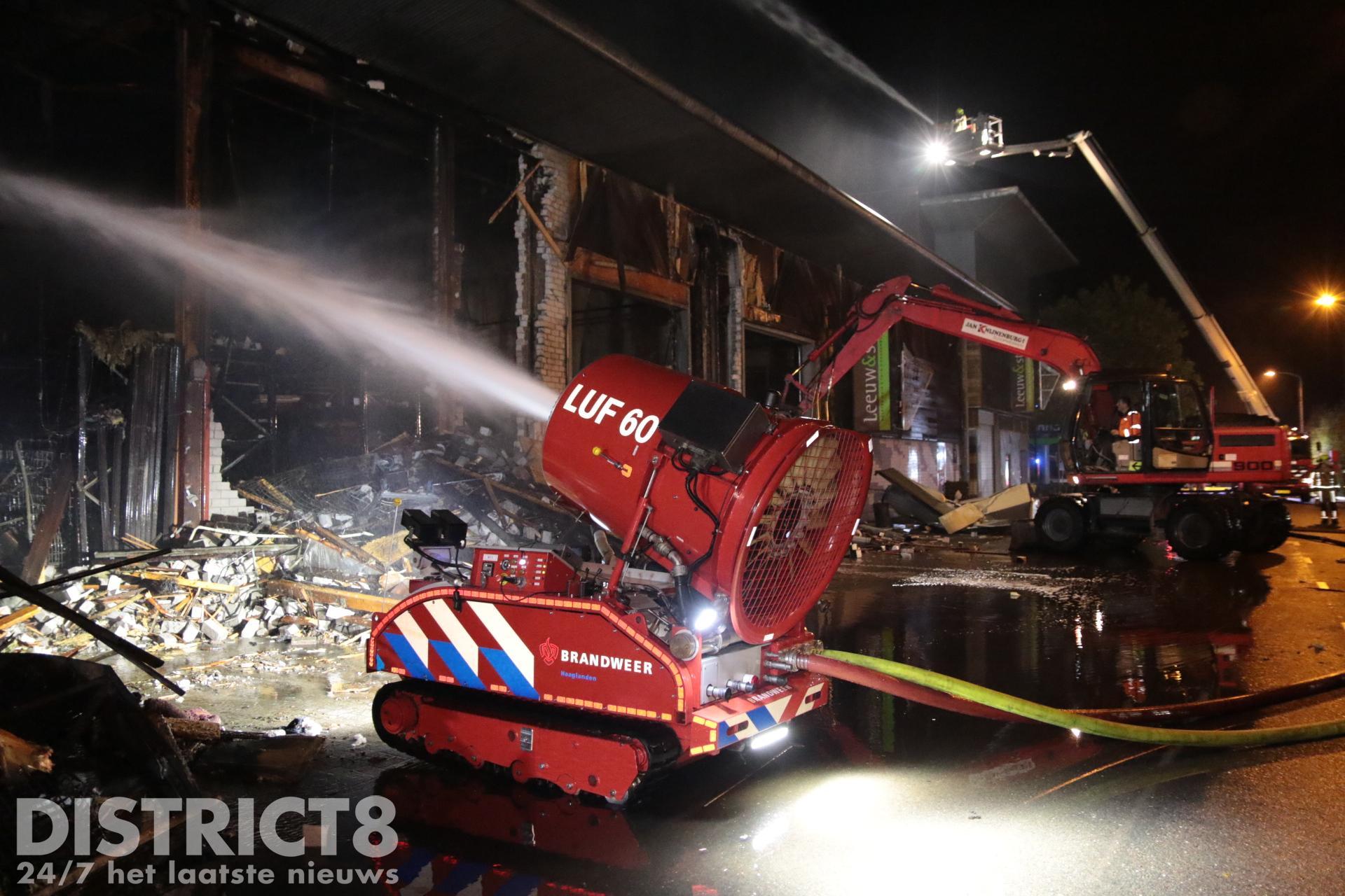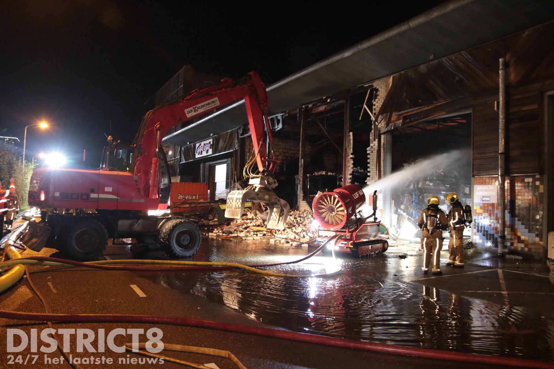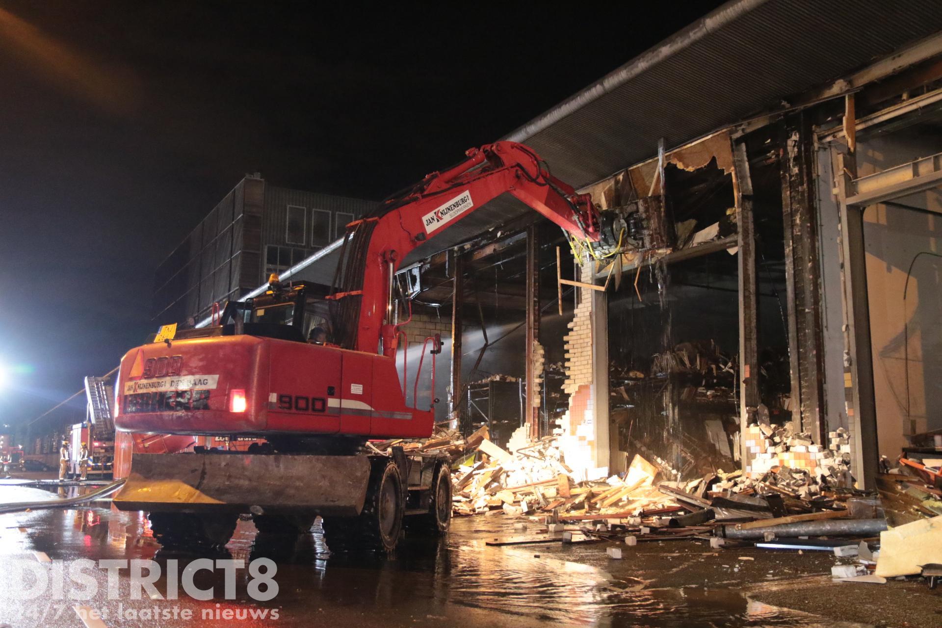 De brand is nog niet onder controle. Op dit moment wordt er met behulp van een sloopkraan gezorgd dat de hulpdiensten op een veilige manier bij de brandhaard kunnen komen.