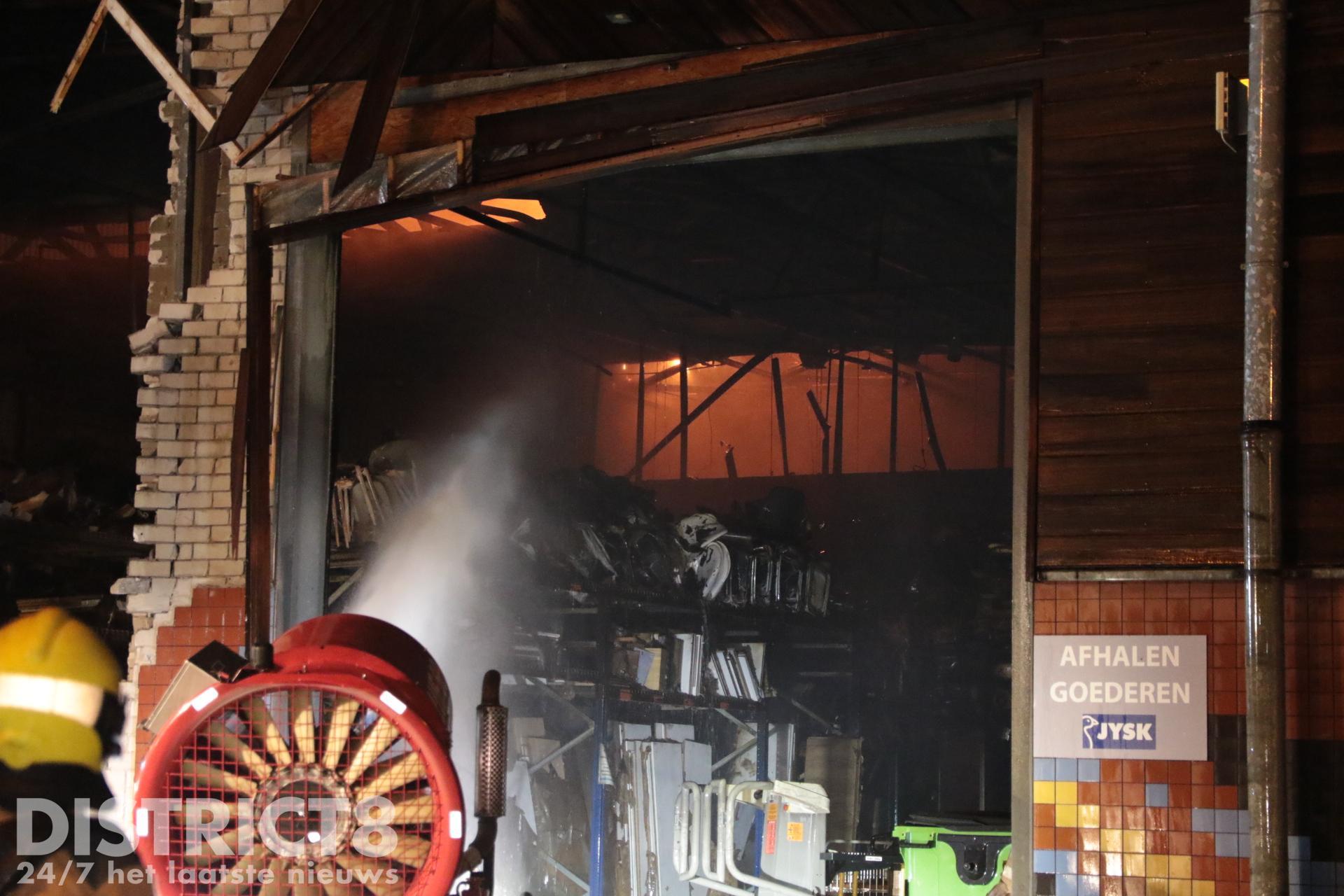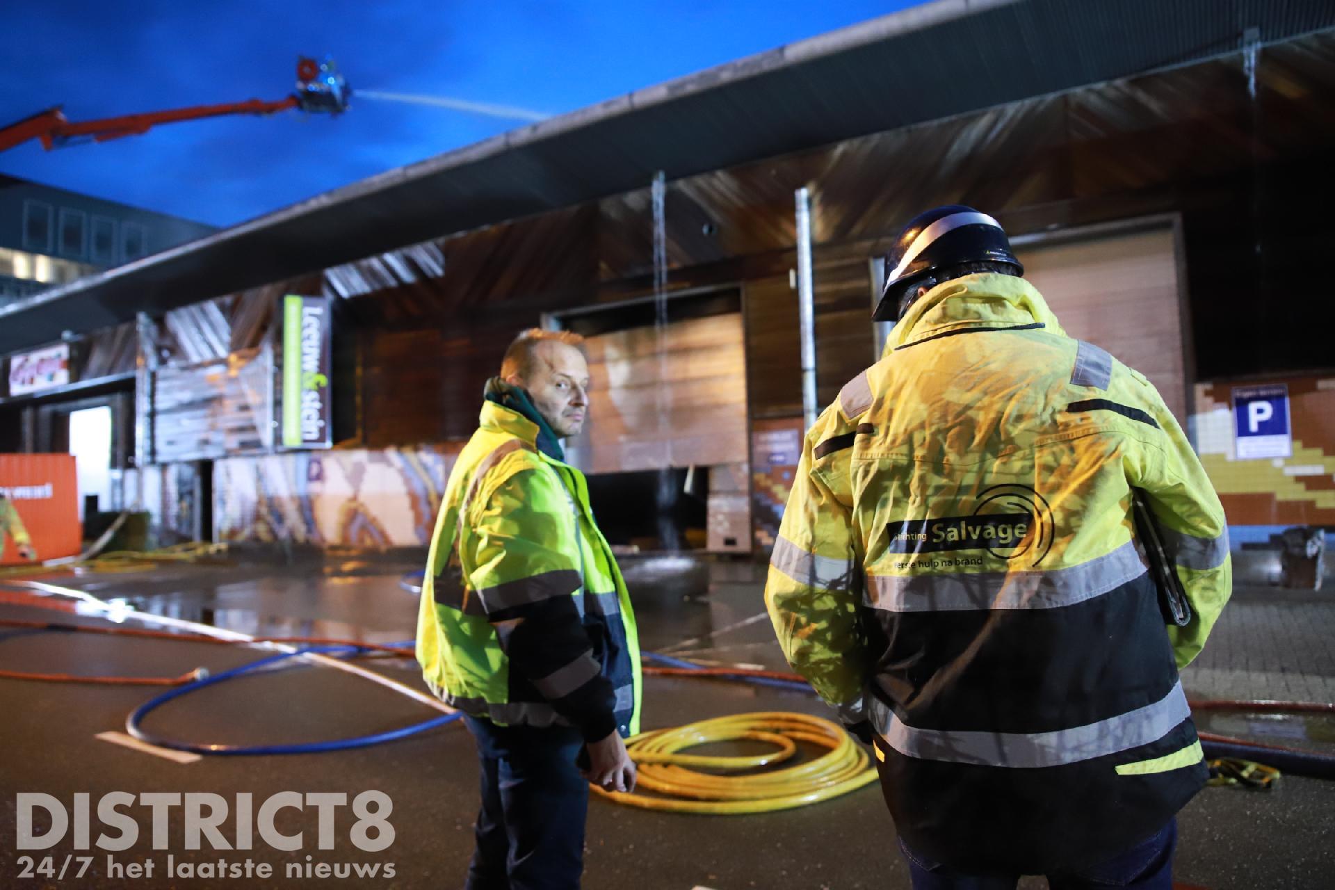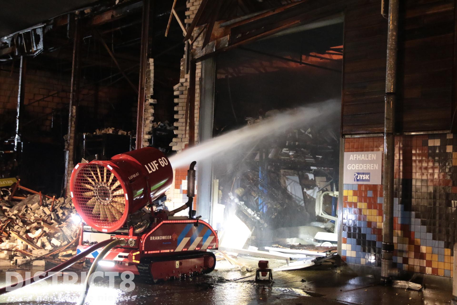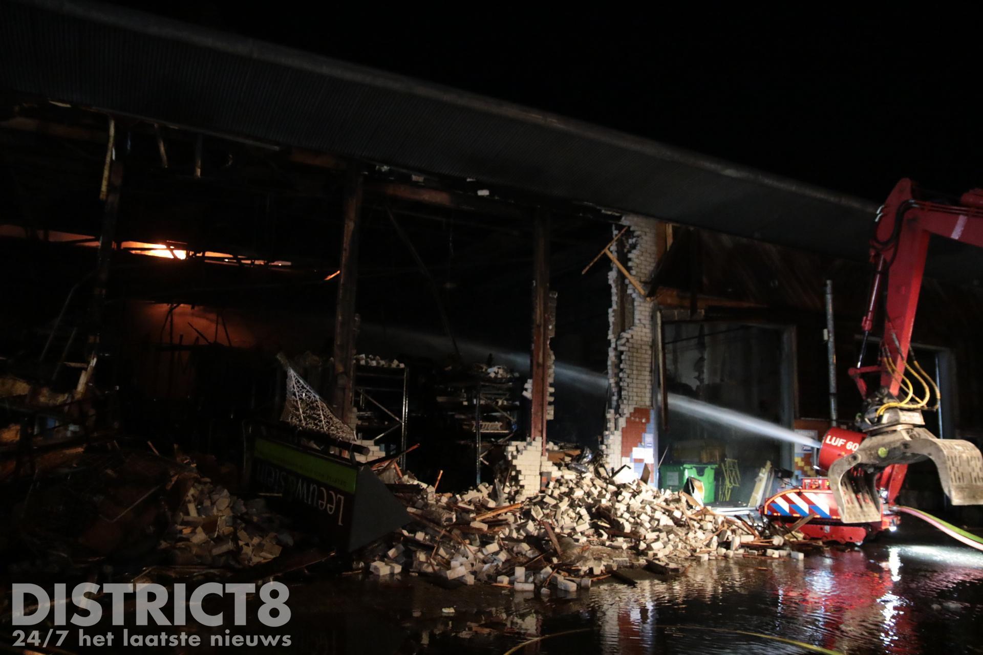 De brand is nog niet onder controle. Op dit moment wordt er met behulp van een sloopkraan gezorgd dat de hulpdiensten op een veilige manier bij de brandhaard kunnen komen.