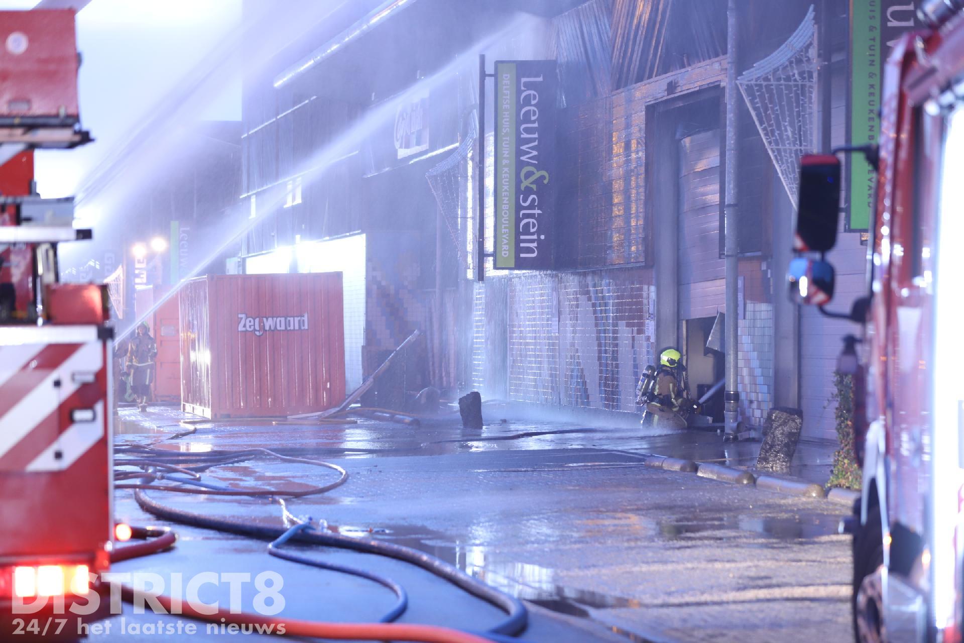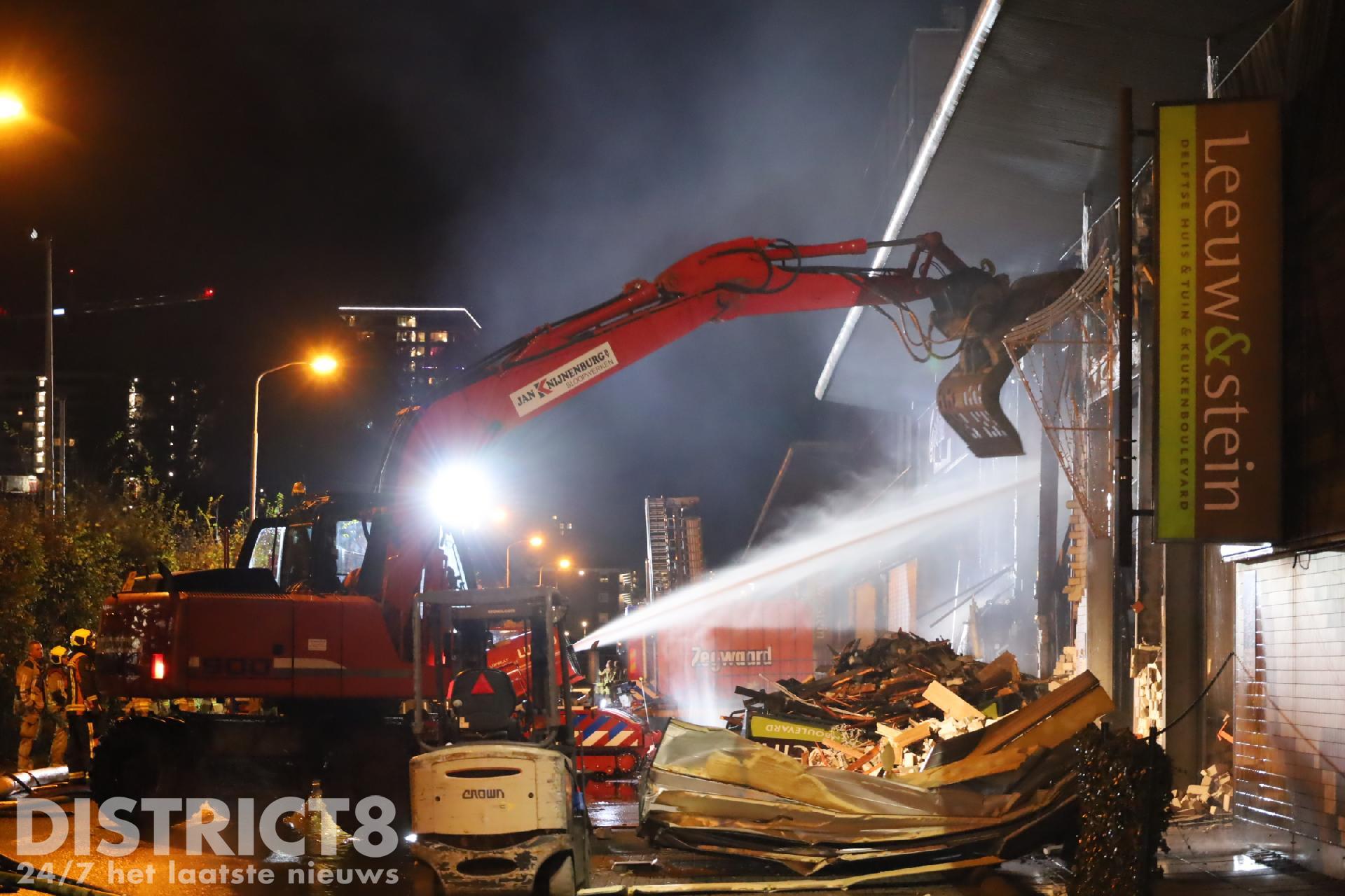 Er wordt tot laat in de avond nog flink geblust. Ook de blusrobot van kazerne Rijswijk wordt ingezet. Een sloopkraan is aanwezig en wordt gebruikt om delen van het pand open te breken om zo dichterbij het vuur te komen. De brand is ook nog niet onder controle.