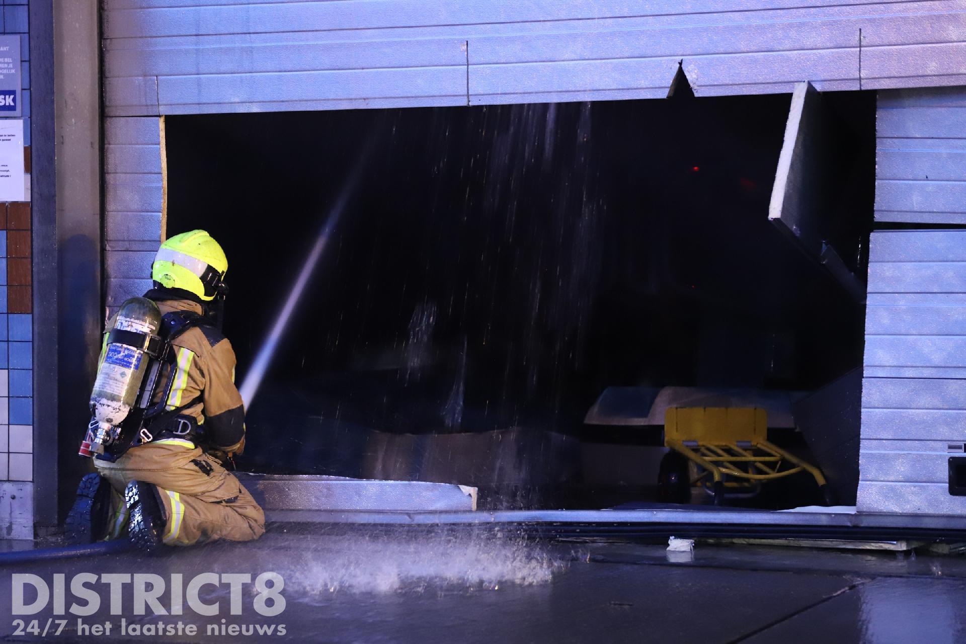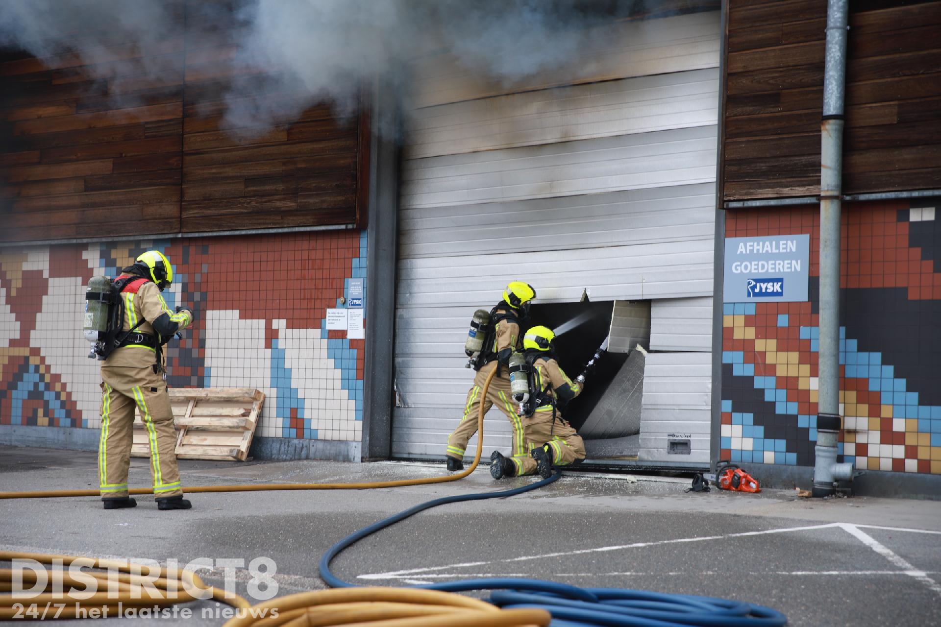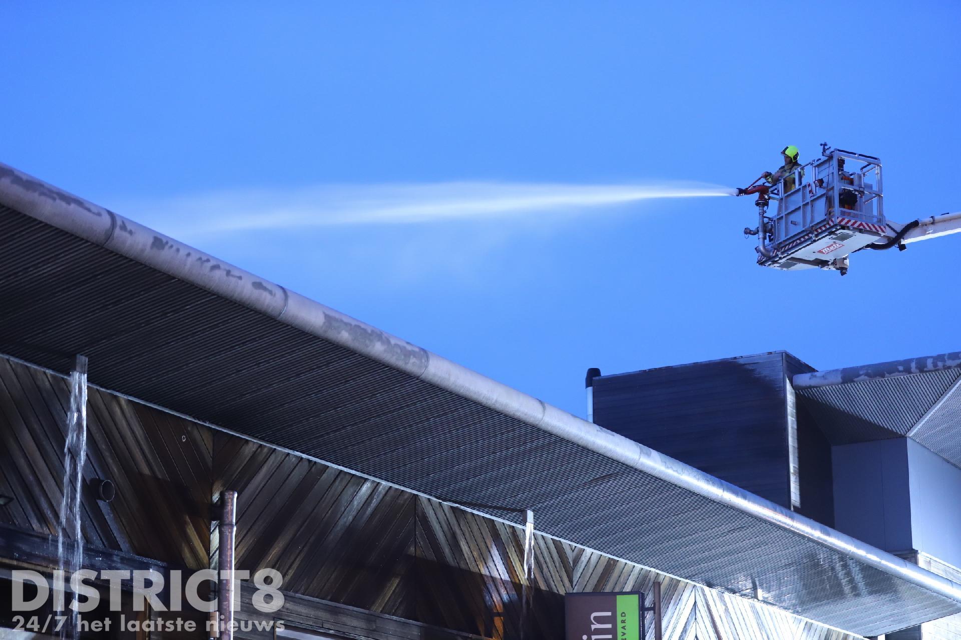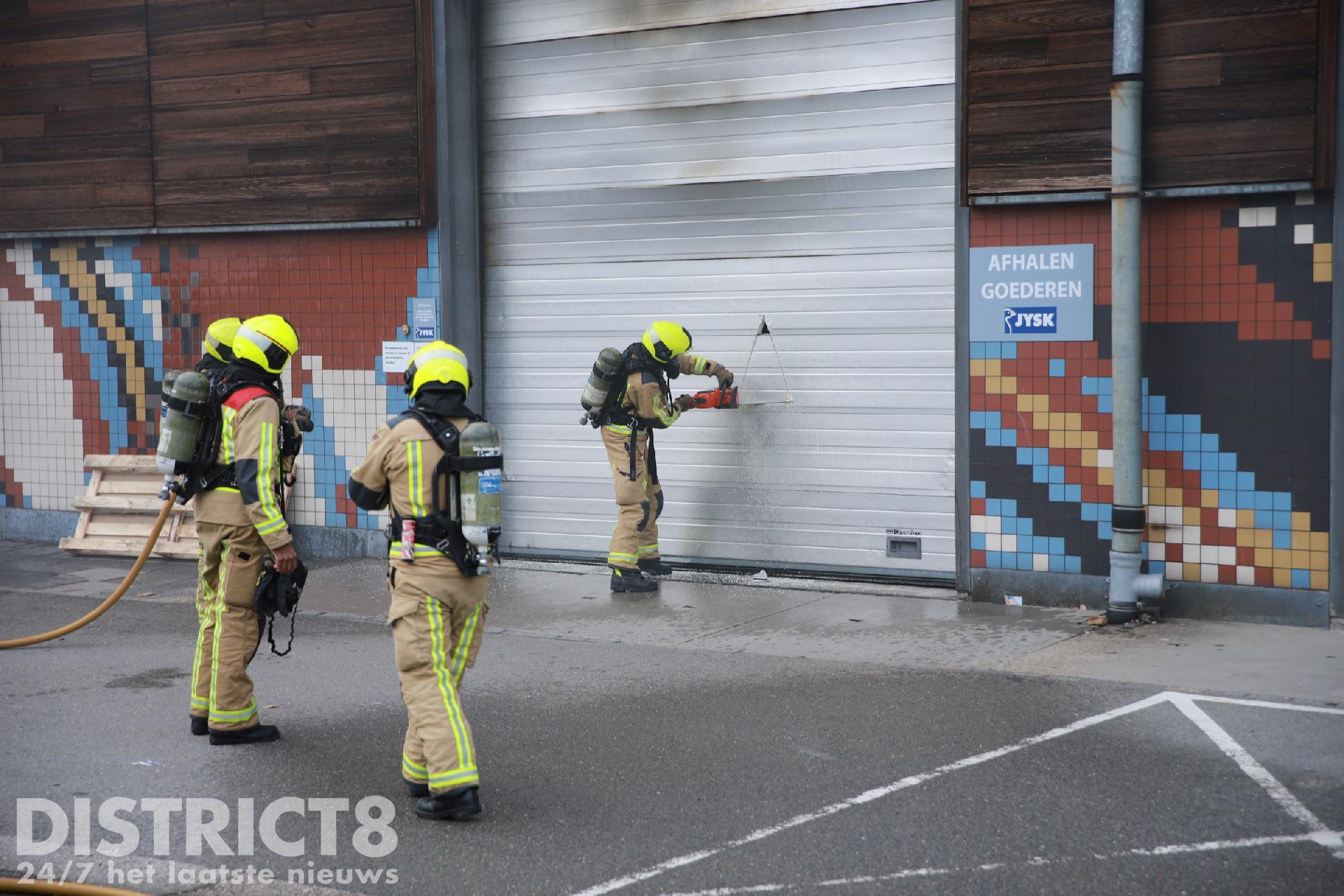 De brandweer heeft meerdere rolluiken opengezaagd om het pand te kunnen betreden. Met meerdere hoogwerkers uit de gehele regio werd vanaf boven geblust.