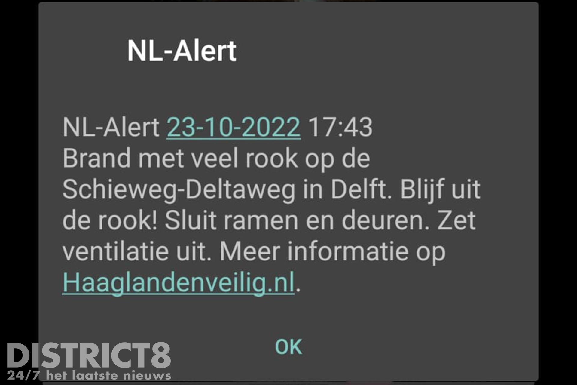 Er is een NL-Alert uitgestuurd voor Delft, Rijswijk en Den Haag. Als u last heeft van de rook moet u ramen en deuren gesloten houden.