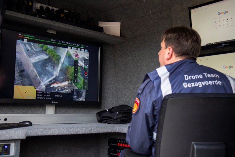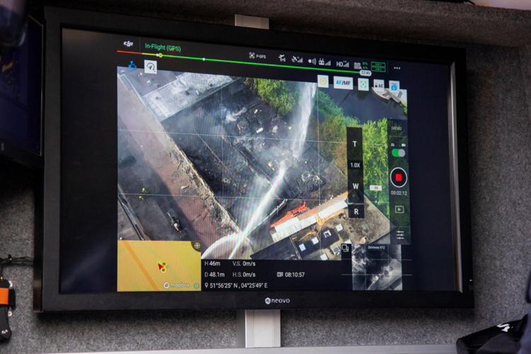 Met behulp van het drone-team van de Gezamenlijke Brandweer kon een goed overzicht verkregen worden van de brandhaarden in het getroffen pand. Zo’n 2,5 uur na het uitbreken van de brand konden de meeste voertuigen weer vertrekken. Een laatste ploeg blijft er plaatse om er voor te zorgen dat alle brandhaarden uit