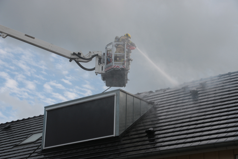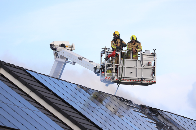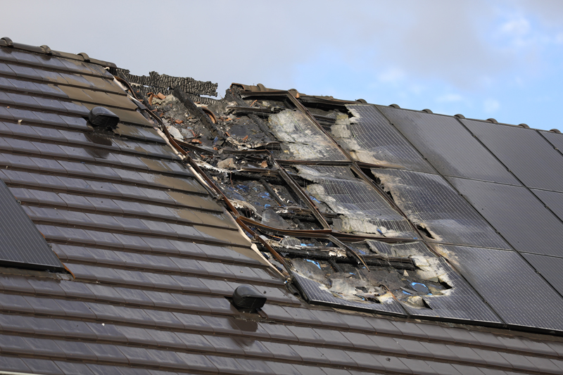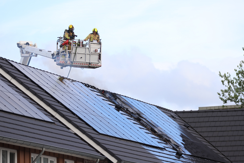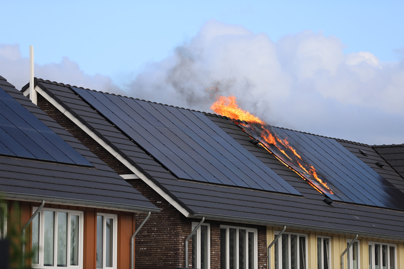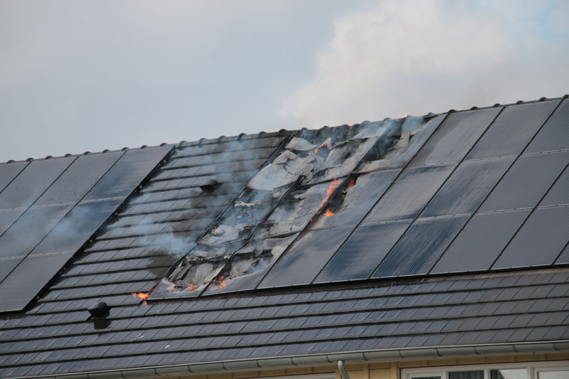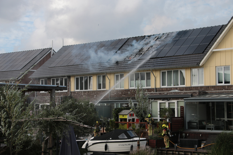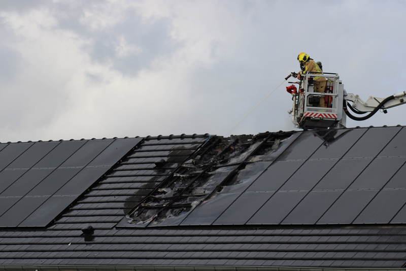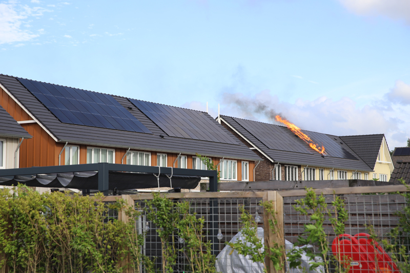 Op het dak staan zonnepanelen in brand. De vlammen waren korte tijd goed zichtbaar.
