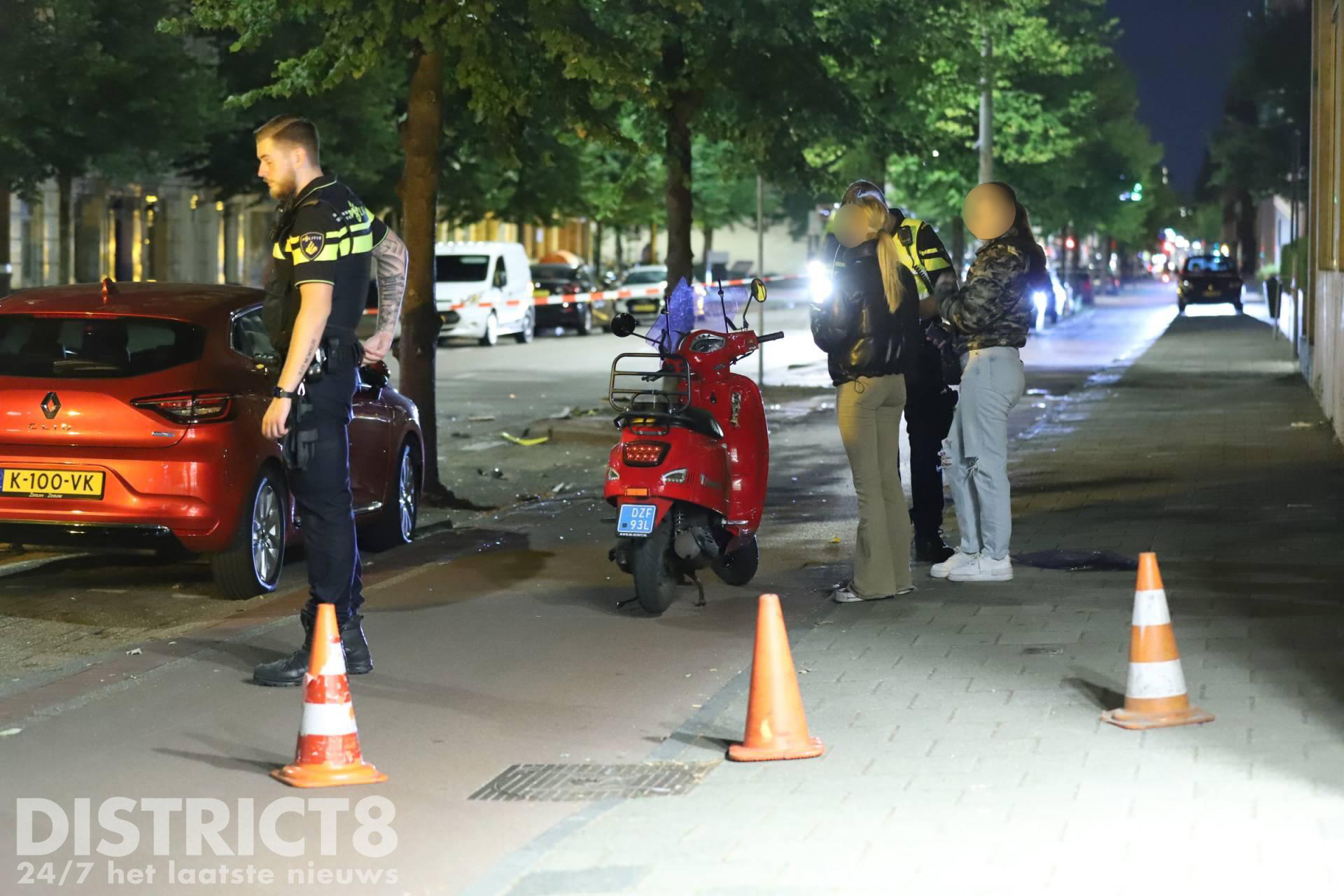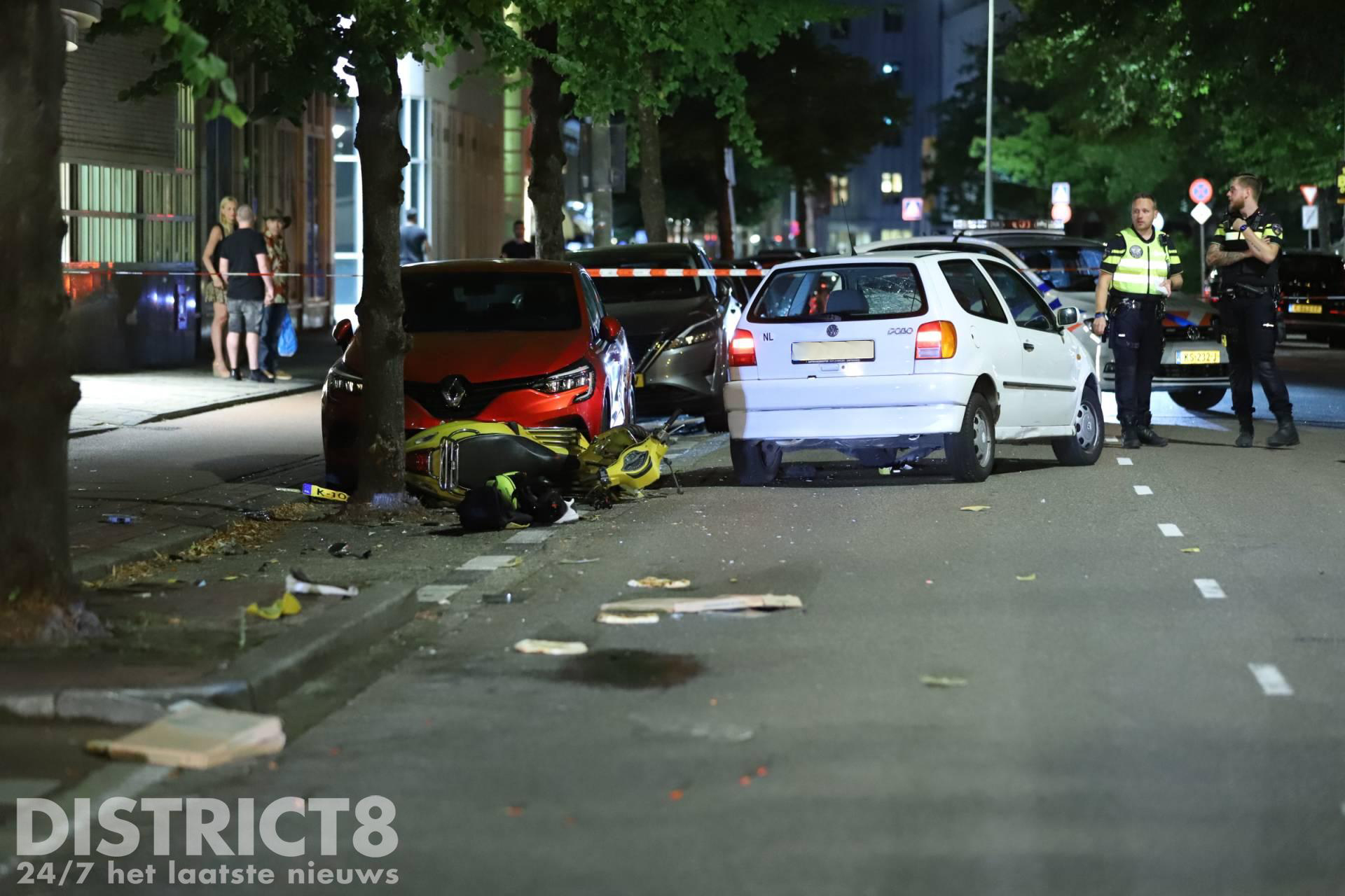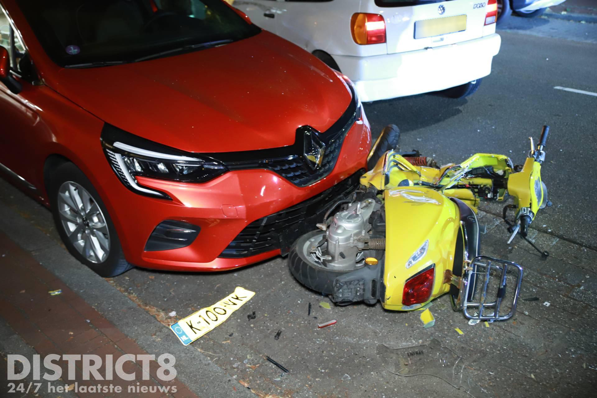 Even na half elf ging het mis. Door nog onbekende oorzaak kwamen de partijen frontaal met elkaar in botsing. De scooterrijder en zijn opzittende kwamen tegen een geparkeerde auto tot stilstand.