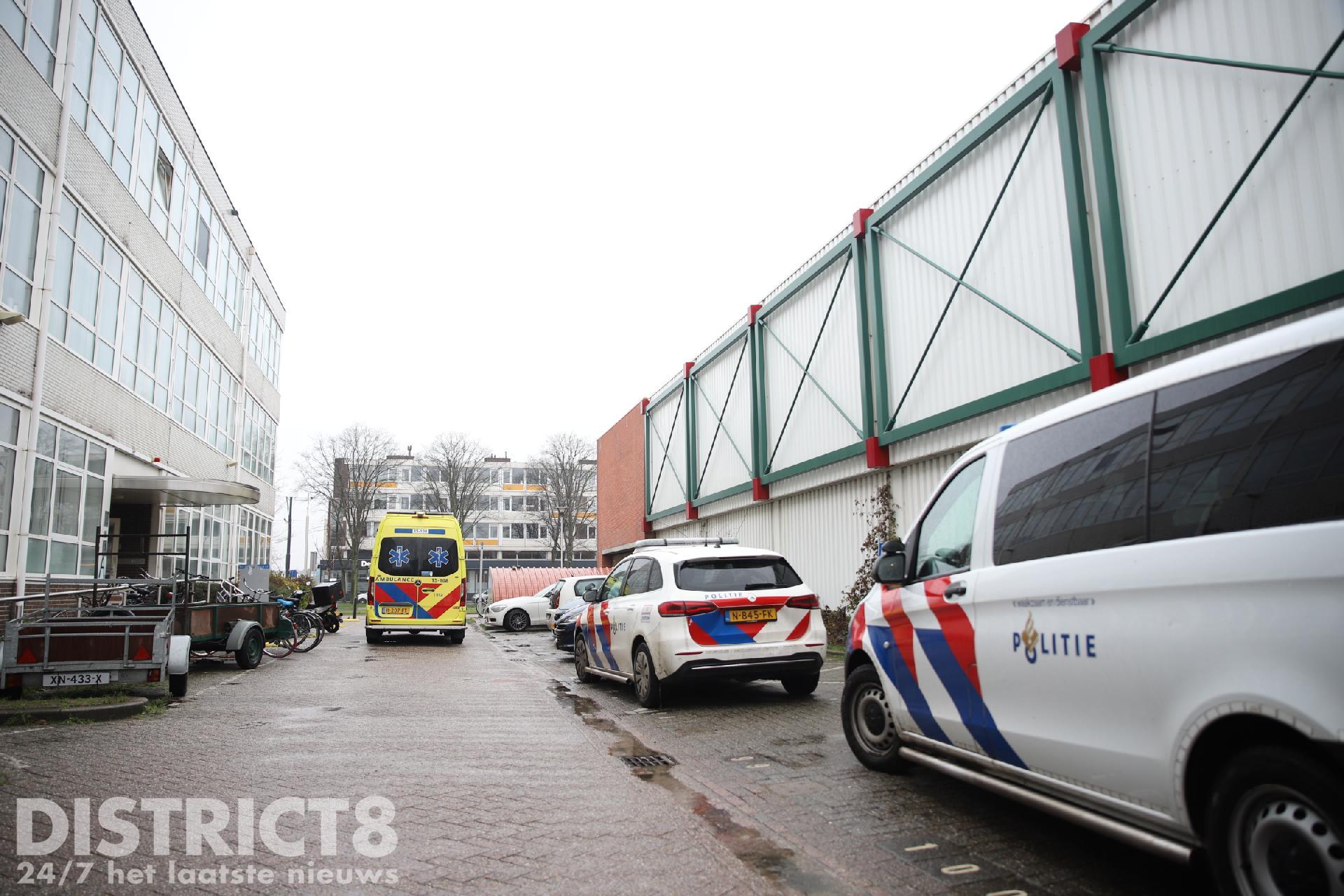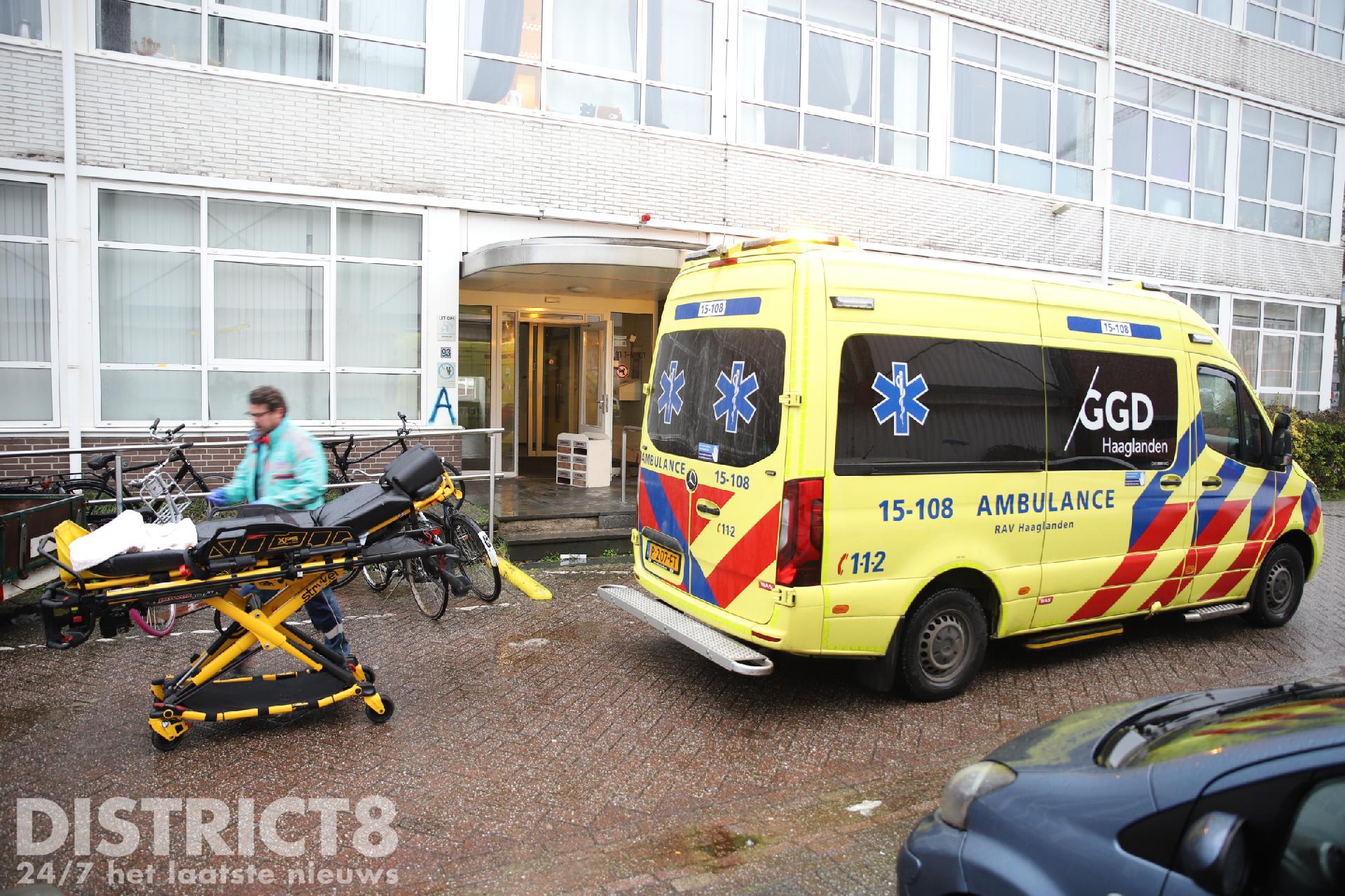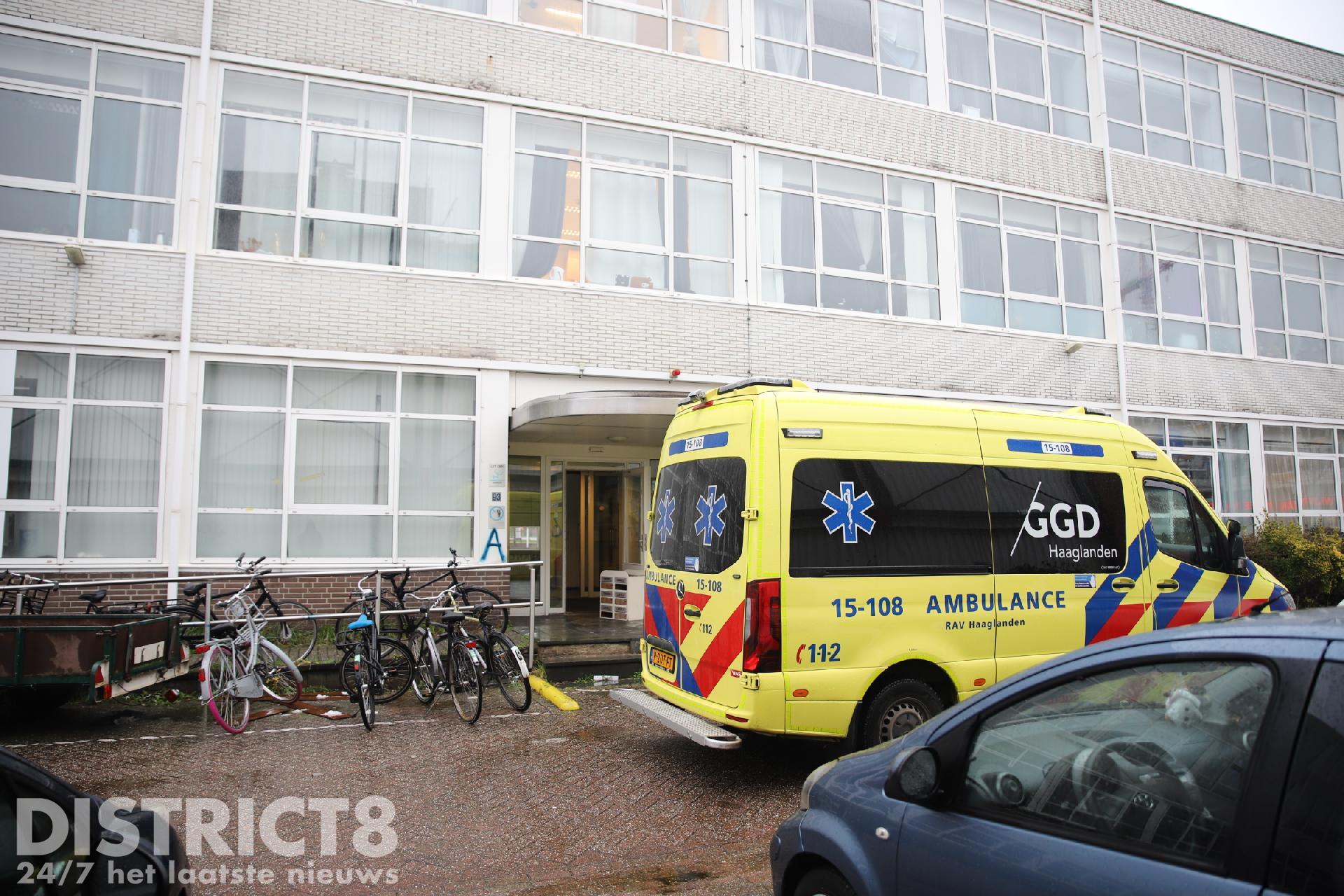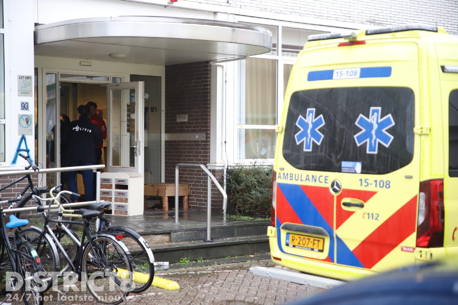 Even na drie uur rukken meerdere hulpdiensten uit naar de studentenflat aan de Van Bleyswijckstraat in Delft. Ook een traumahelikopter wordt opgeroepen.