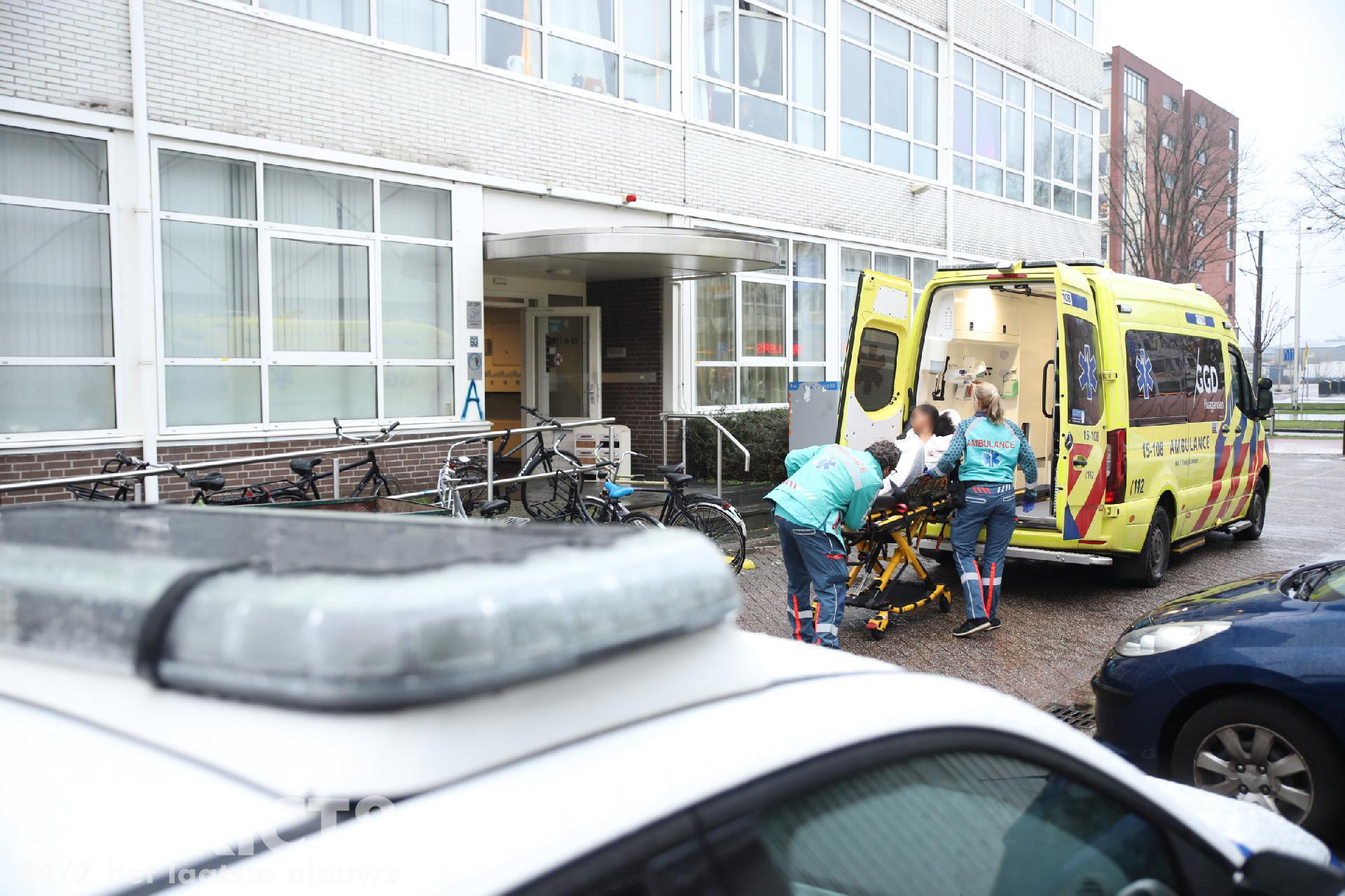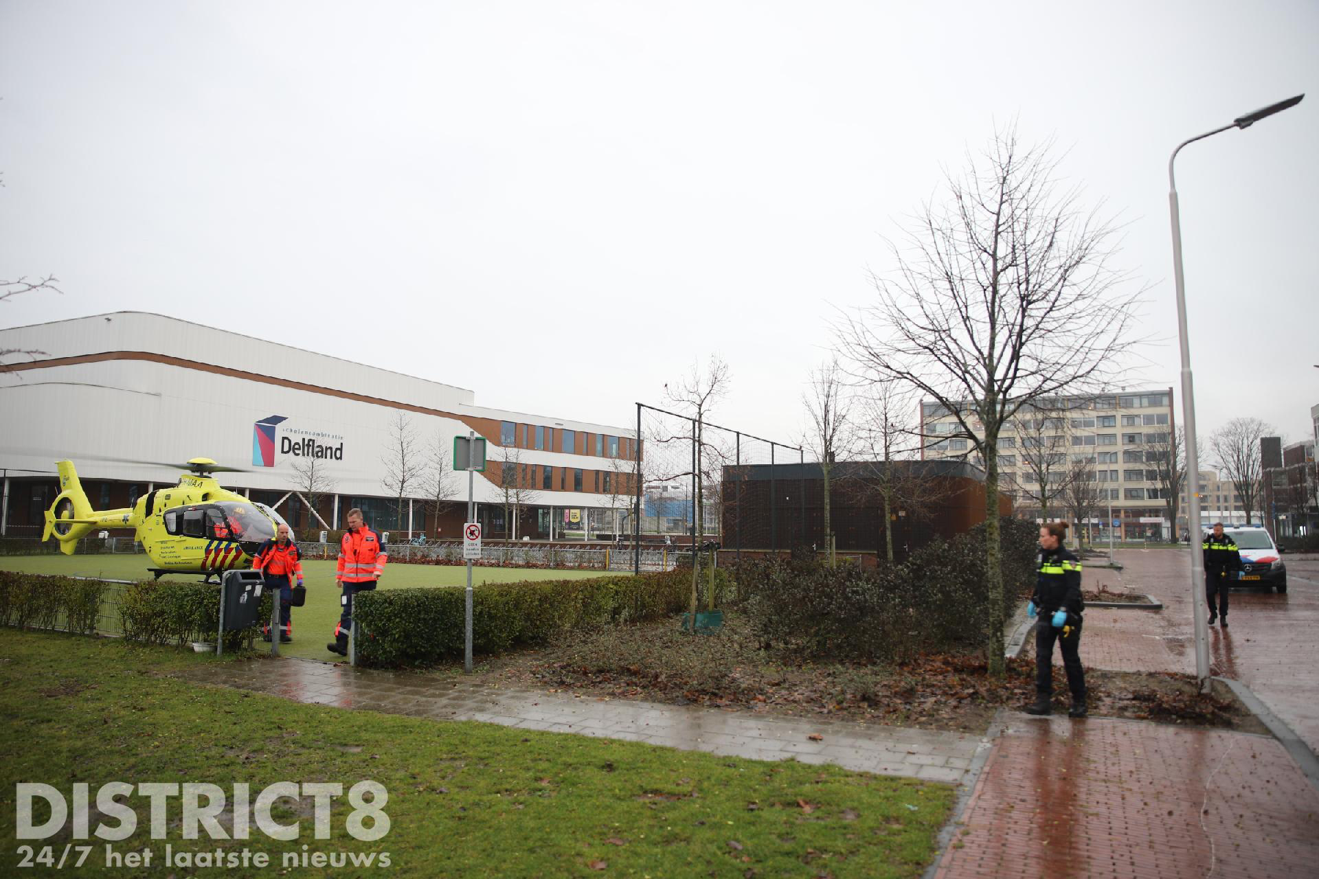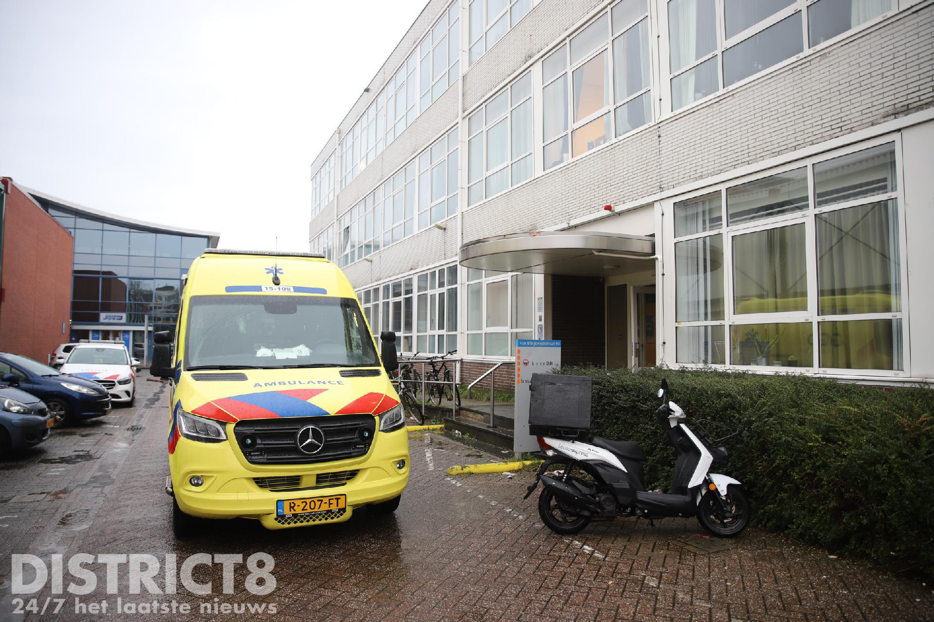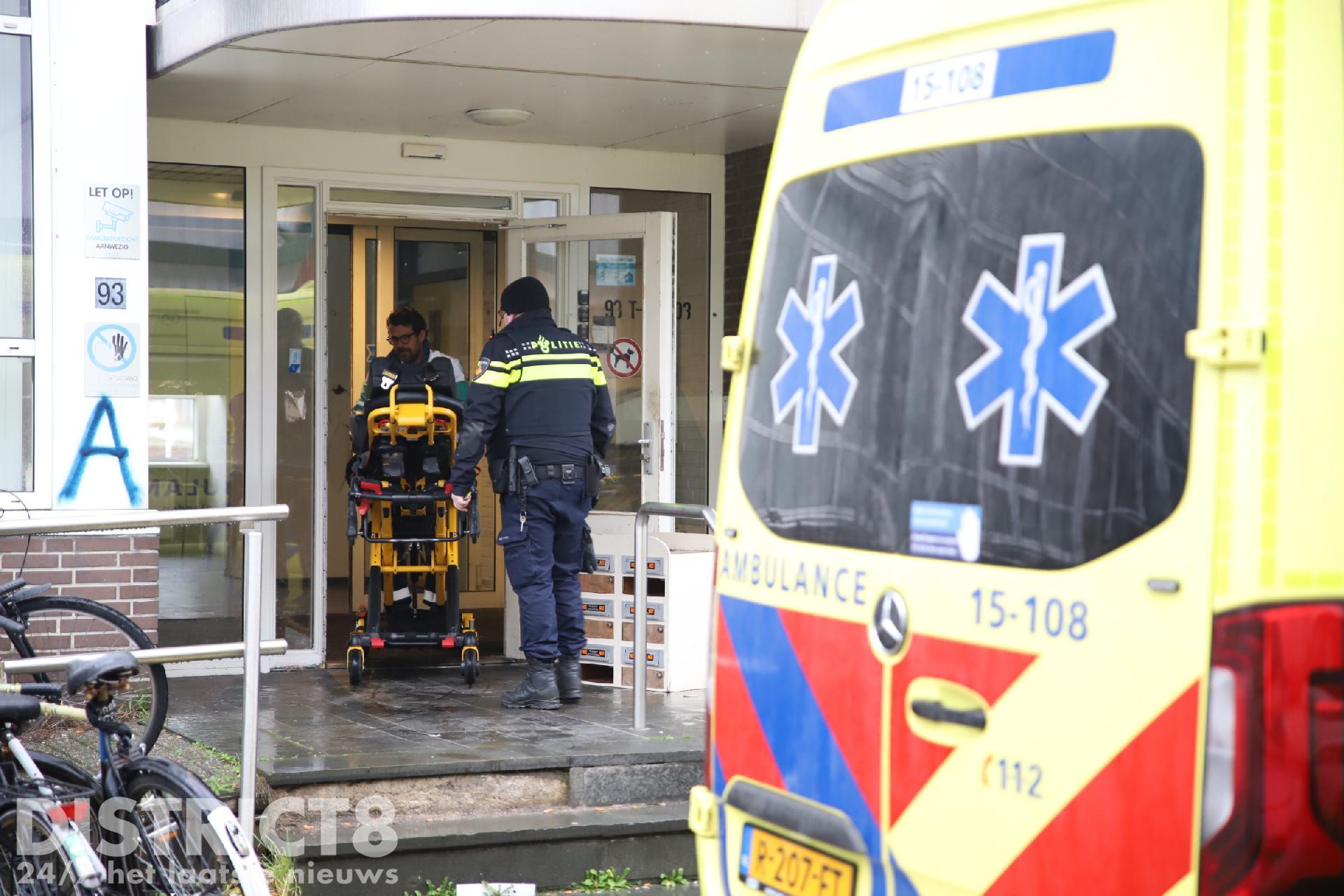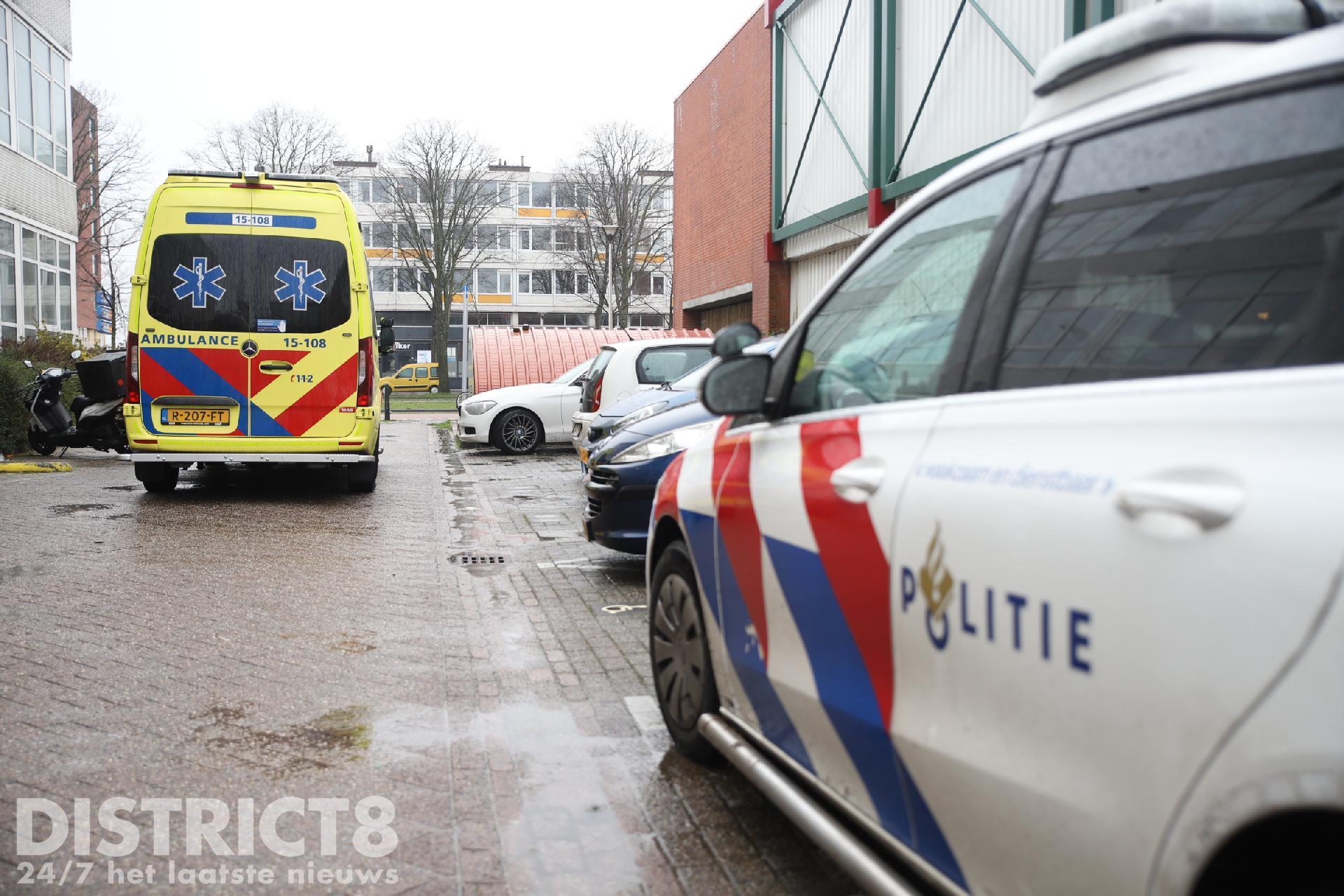 Even na drie uur rukken meerdere hulpdiensten uit naar de studentenflat aan de Van Bleyswijckstraat in Delft. Ook een traumahelikopter wordt opgeroepen.