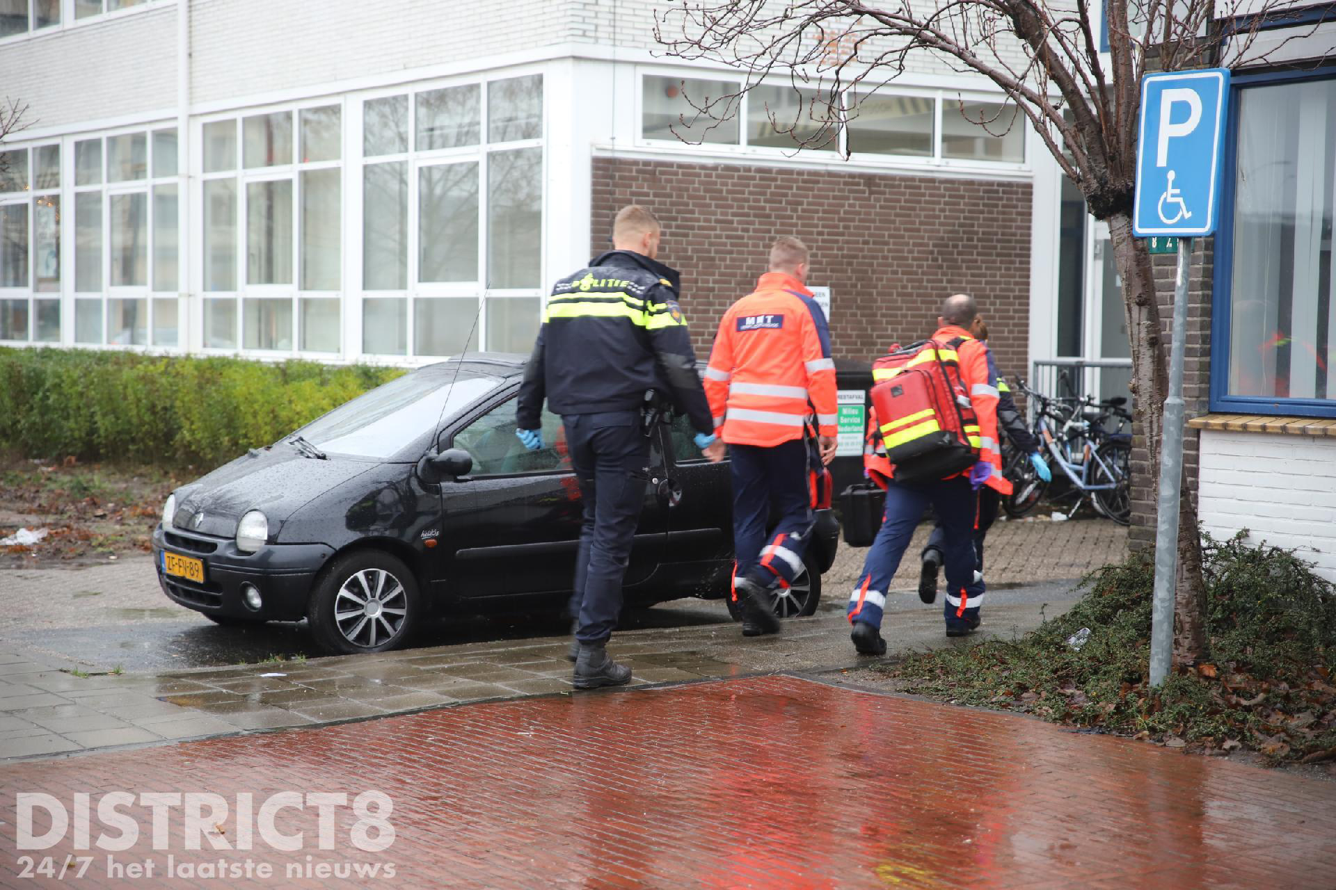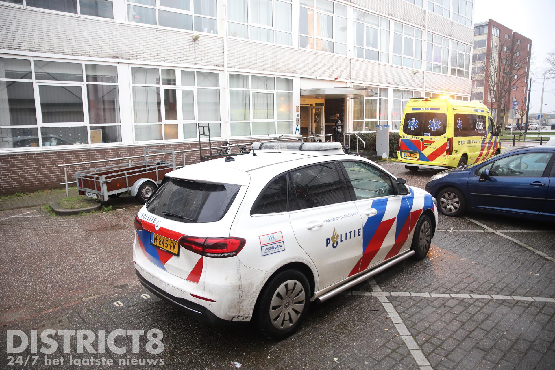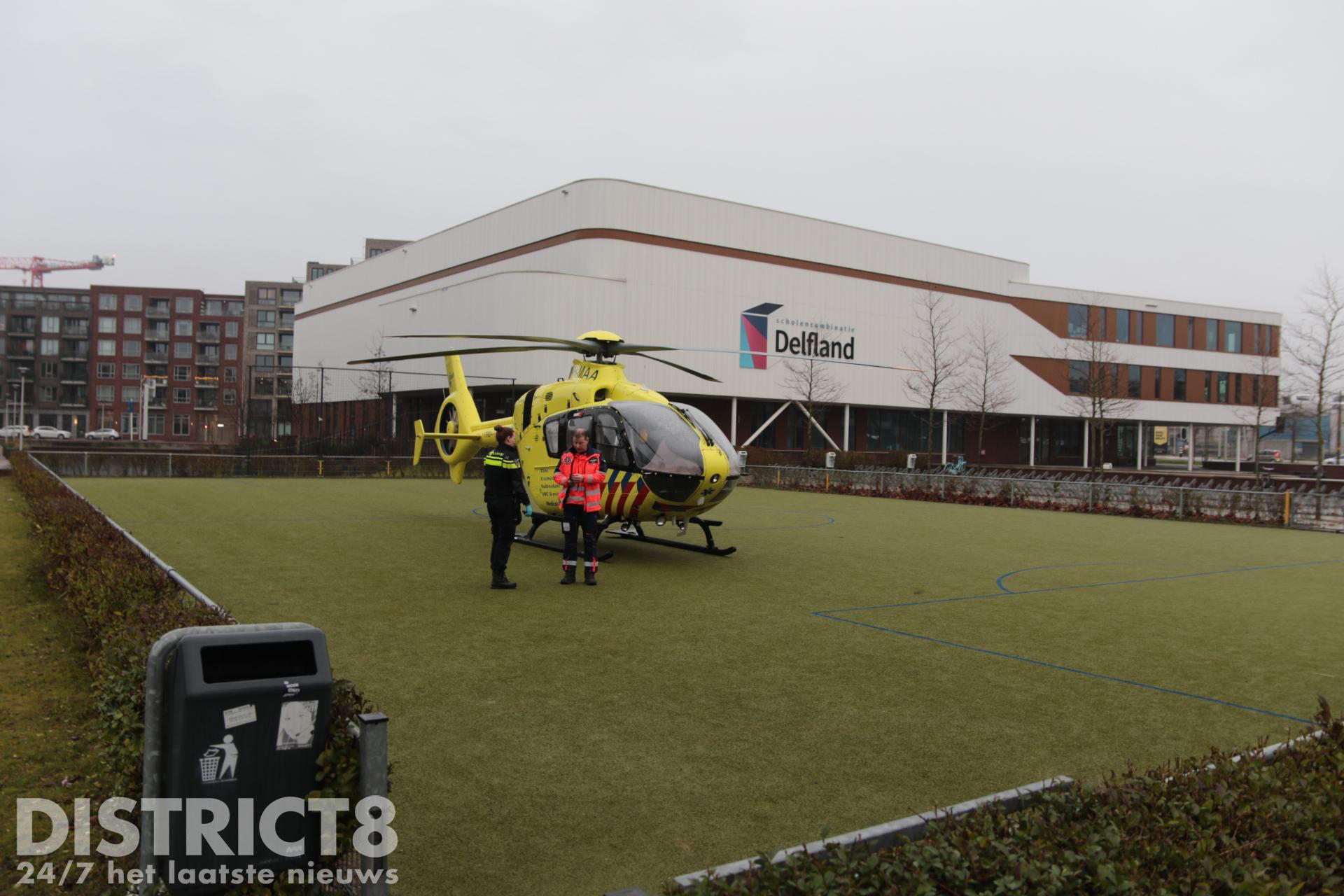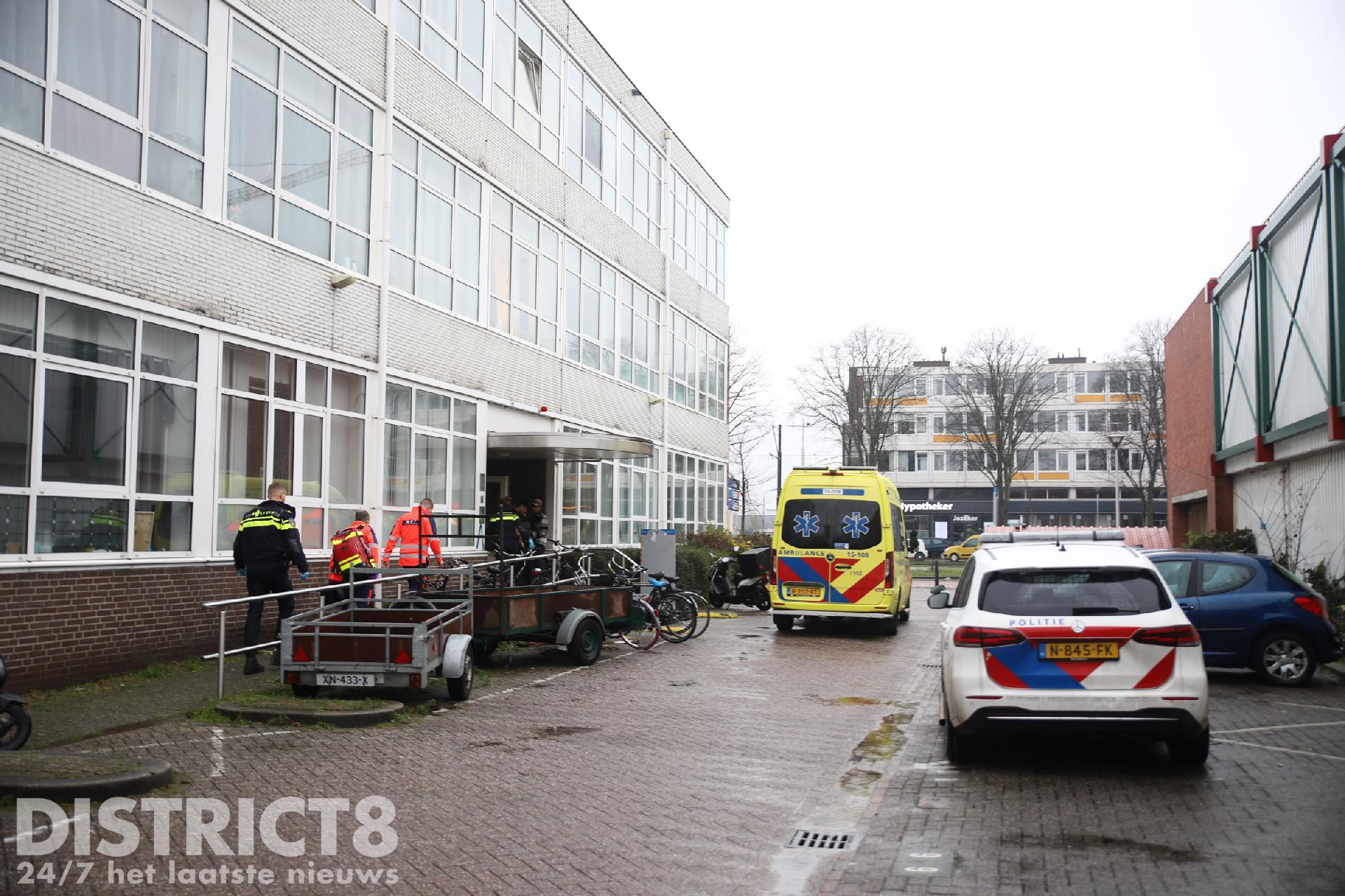 Even na drie uur rukken meerdere hulpdiensten uit naar de studentenflat aan de Van Bleyswijckstraat in Delft. Ook een traumahelikopter wordt opgeroepen.