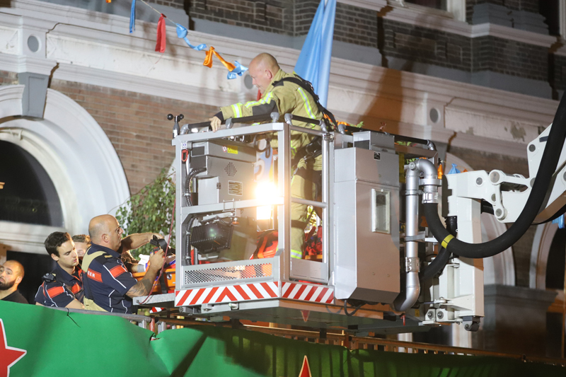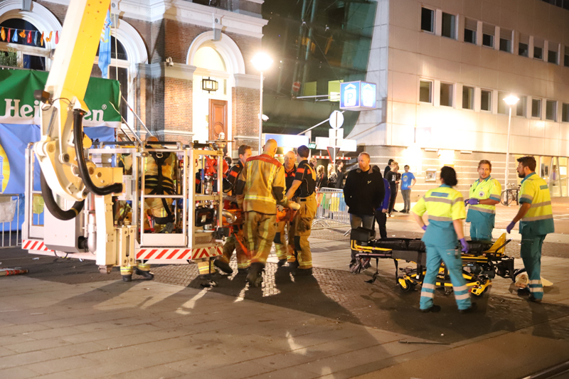 De brandweer heeft voor de Societeit een hoogwerker opgesteld. Omdat de toestand van het slachtoffer stabiel was is de komst van het traumateam gecanceld. Het slachtoffer is gefixeerd in een vacuümmatras en hierna met de hoogwerker naar beneden gehaald.